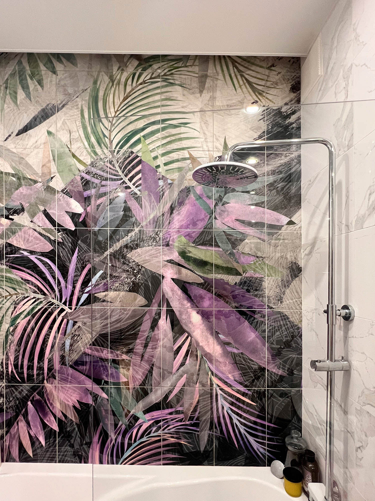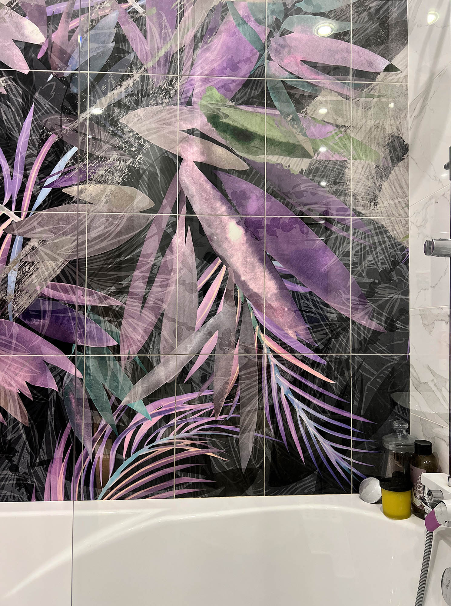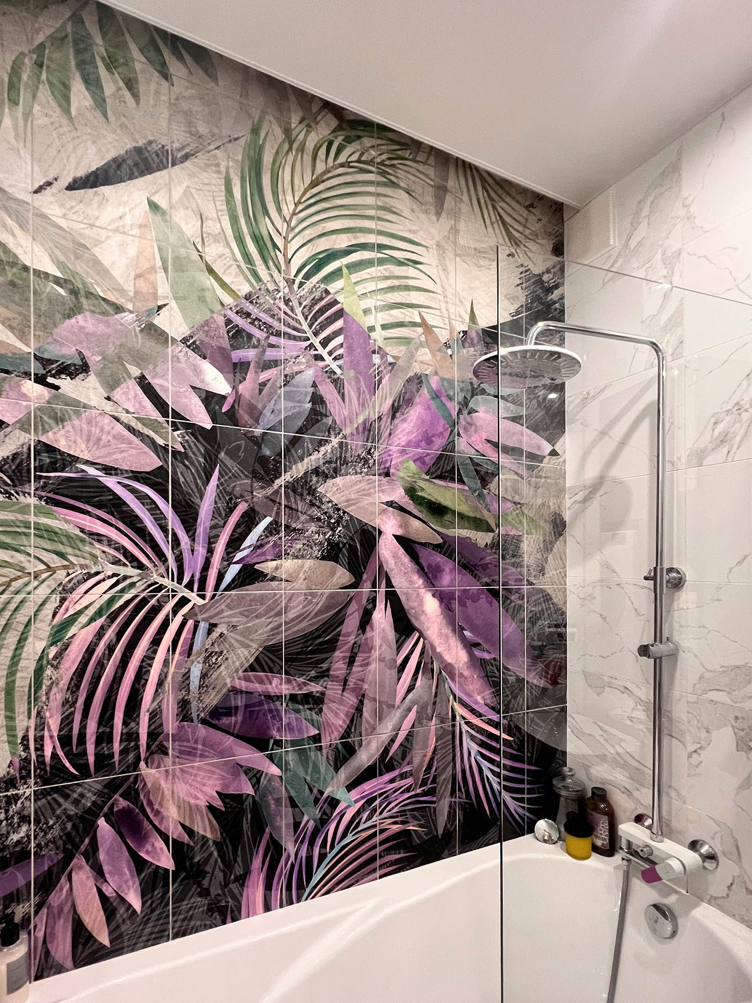 Плитка с тропическими растениями в дизайне ванной комнаты