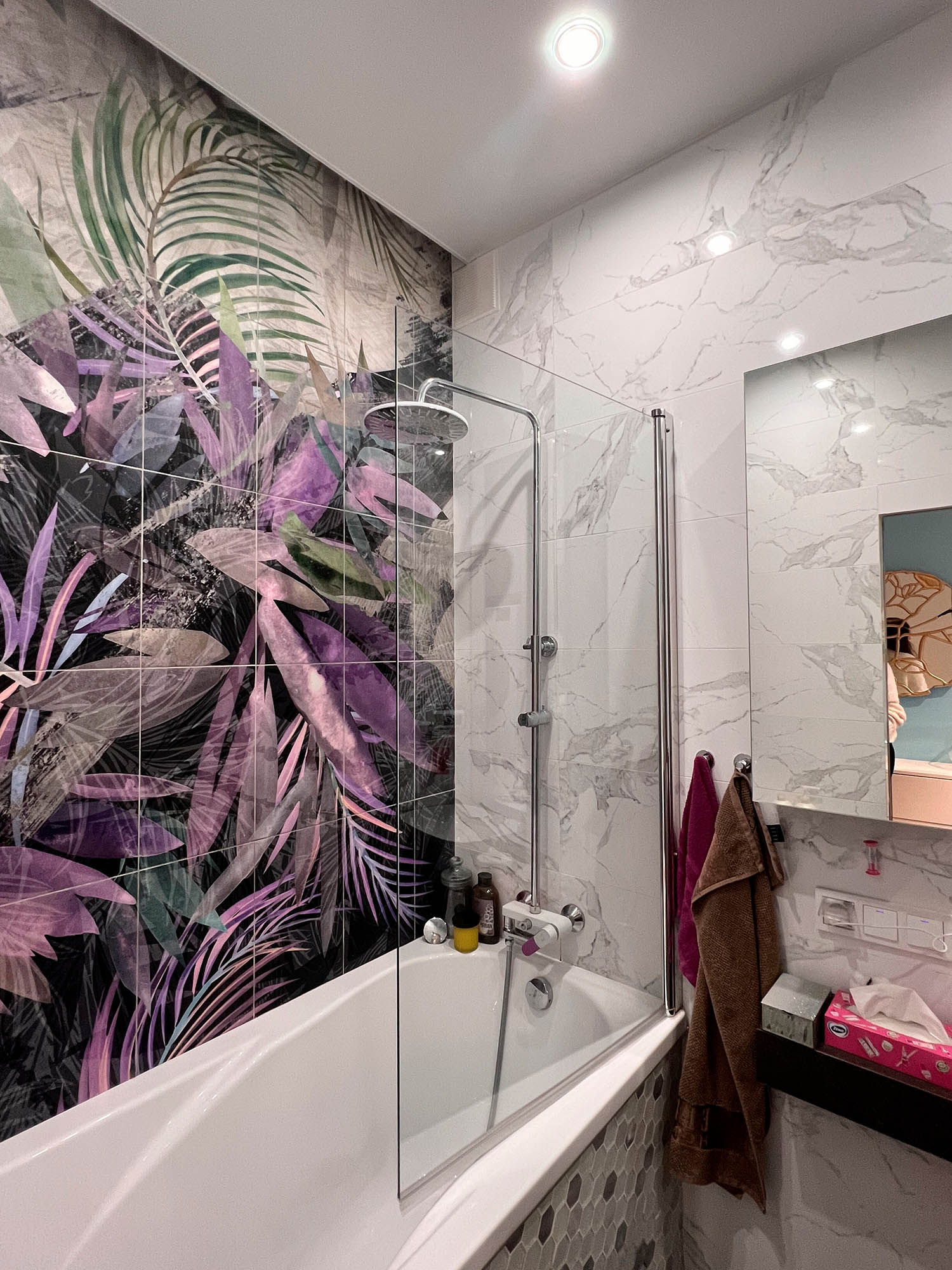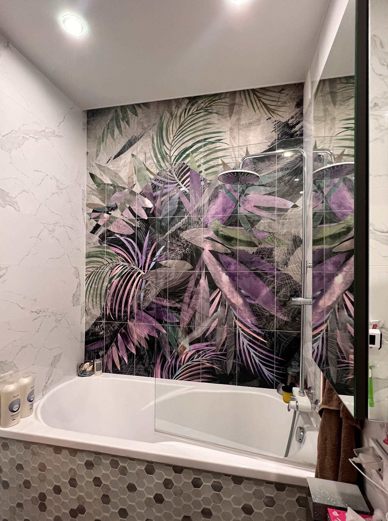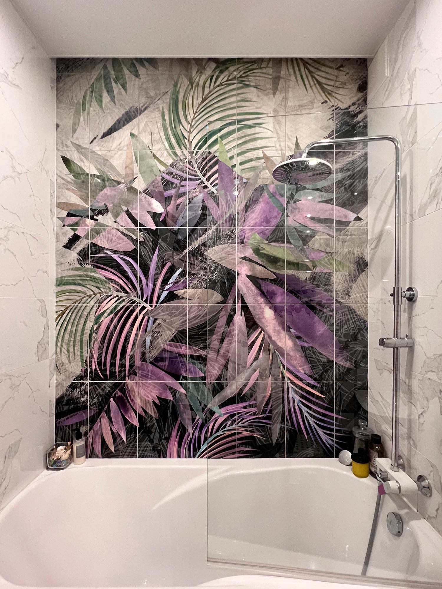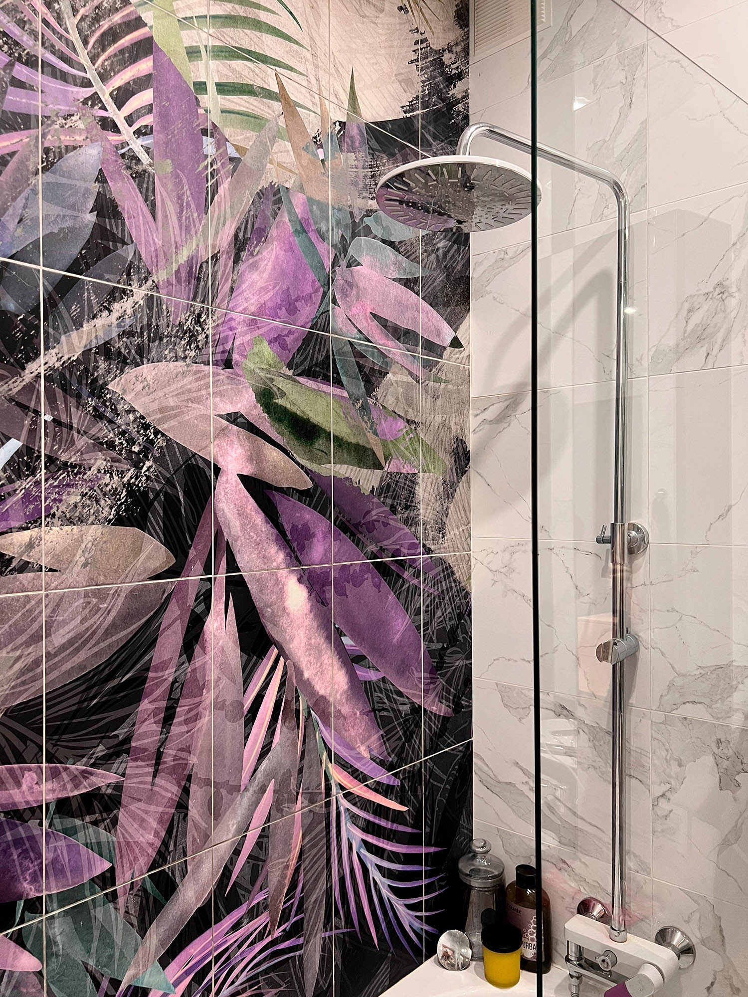 Плитка с тропическими растениями в дизайне ванной комнаты