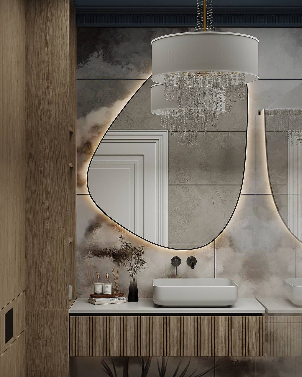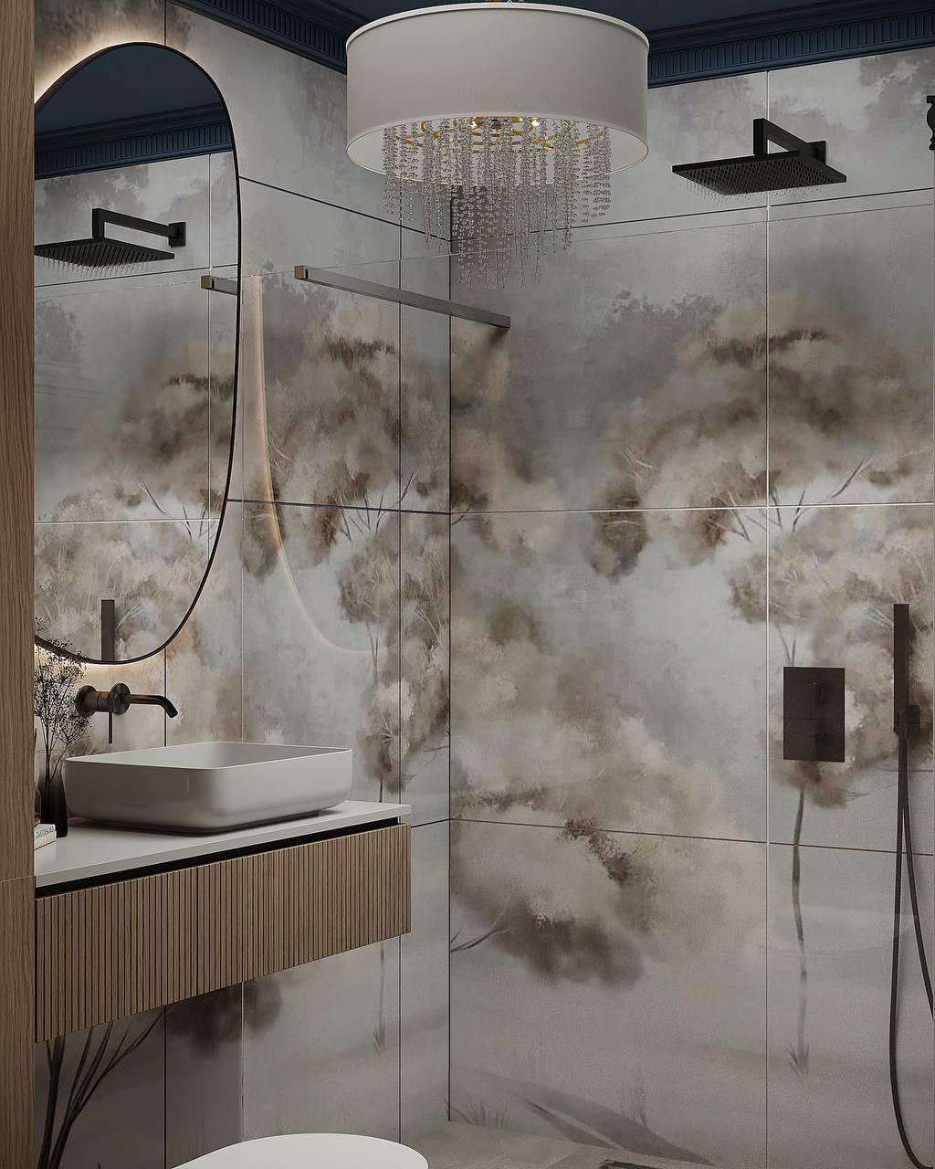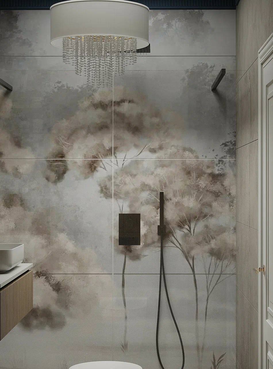 Дизайн ванной комнаты с необычной плиткой WallStreet из коллекции ARBRE 22. Arbre означает «дерево» в переводе с французского. Основная художественная задумка коллекции — сочетание классических пейзажных сюжетов, популярных для традиционных фресок и скандинавской стилистики. Идеальное решение для внесения нежных акцентов в интерьер в скандинавском и минималистичном стиле.