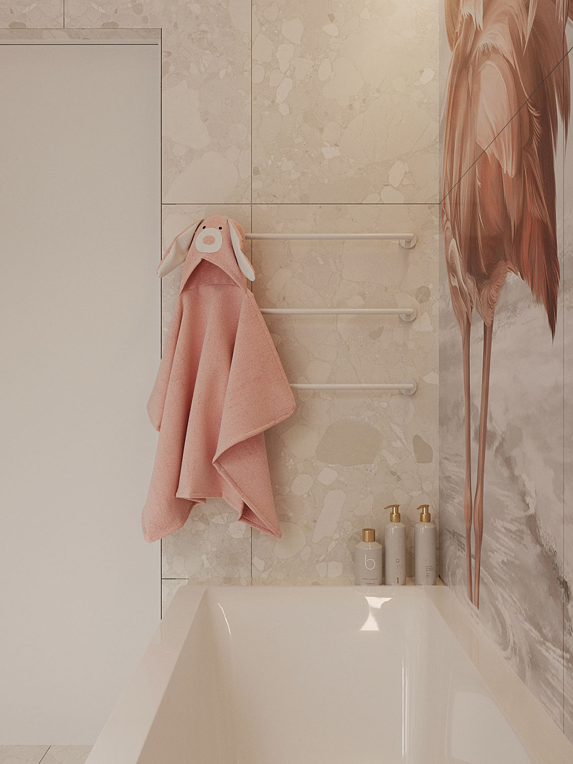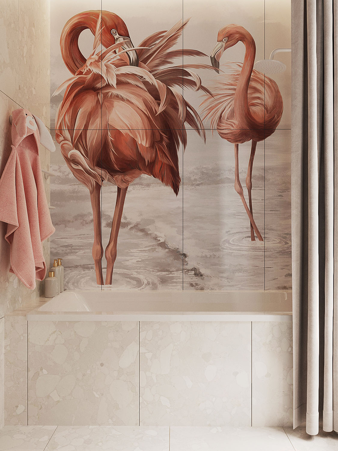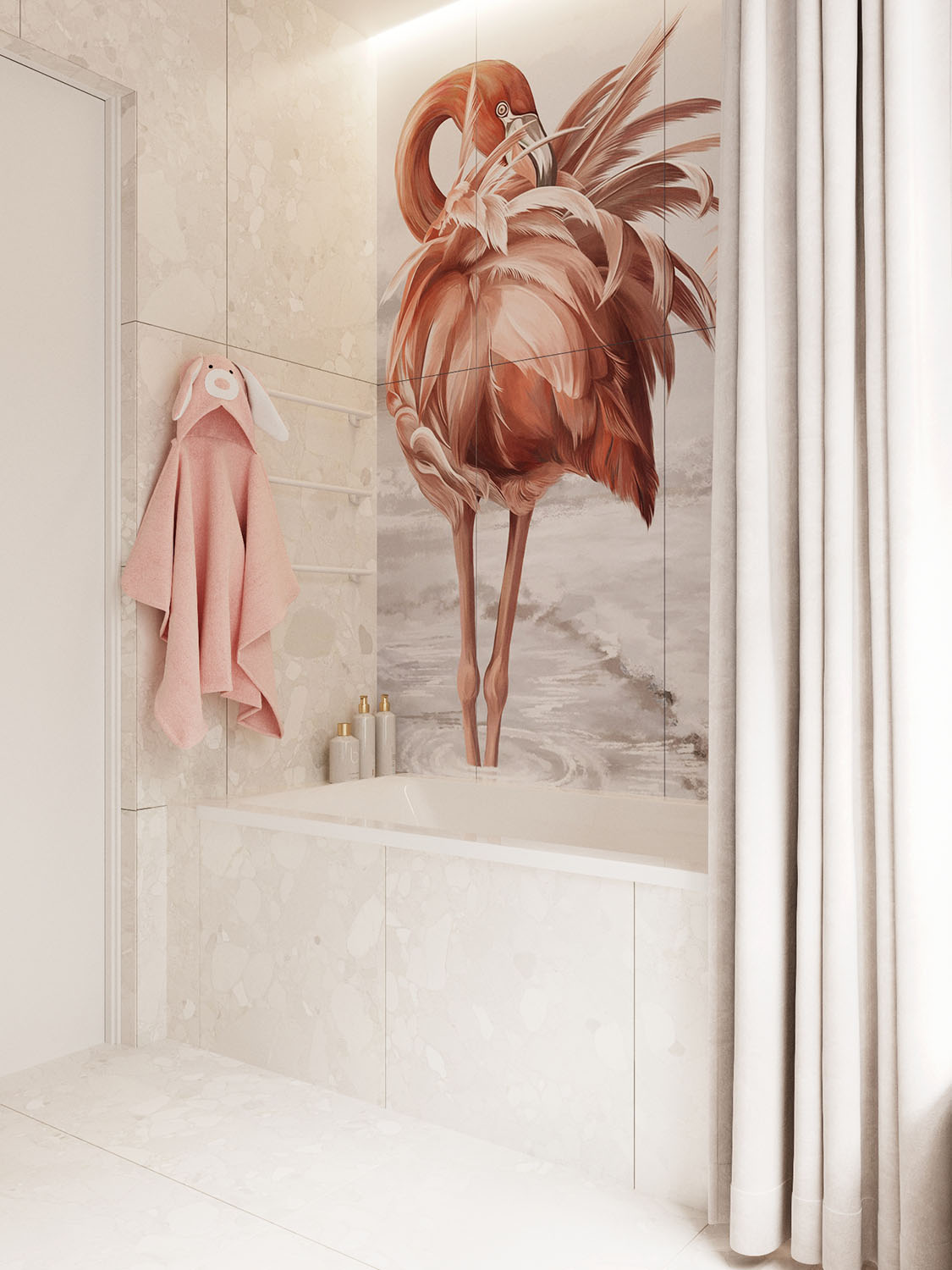 Детская ванная комната в Нижнем Новгороде, КП Прага. Площадь комнаты — 4,2 м². Для оформления выбрали широкоформатный керамогранит с печатью из коллекции FAUNA ZOOM. Дизайнеры уделили в ней внимание каждому животному: здесь в полной красе показаны изящные фламинго, непосредственные зебры, статные пернатые и многие другие персонажи.