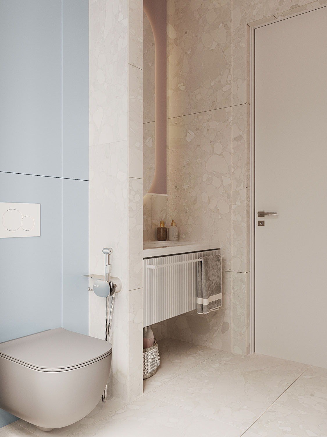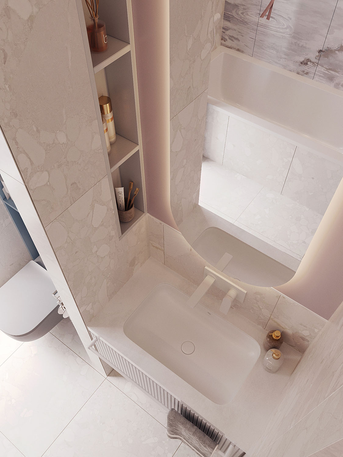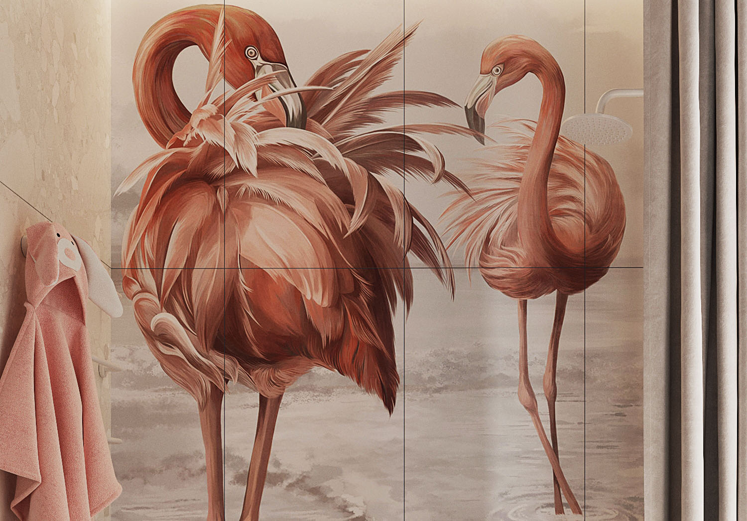 Детская ванная комната в Нижнем Новгороде, КП Прага. Площадь комнаты — 4,2 м². Для оформления выбрали широкоформатный керамогранит с печатью из коллекции FAUNA ZOOM. Дизайнеры уделили в ней внимание каждому животному: здесь в полной красе показаны изящные фламинго, непосредственные зебры, статные пернатые и многие другие персонажи.