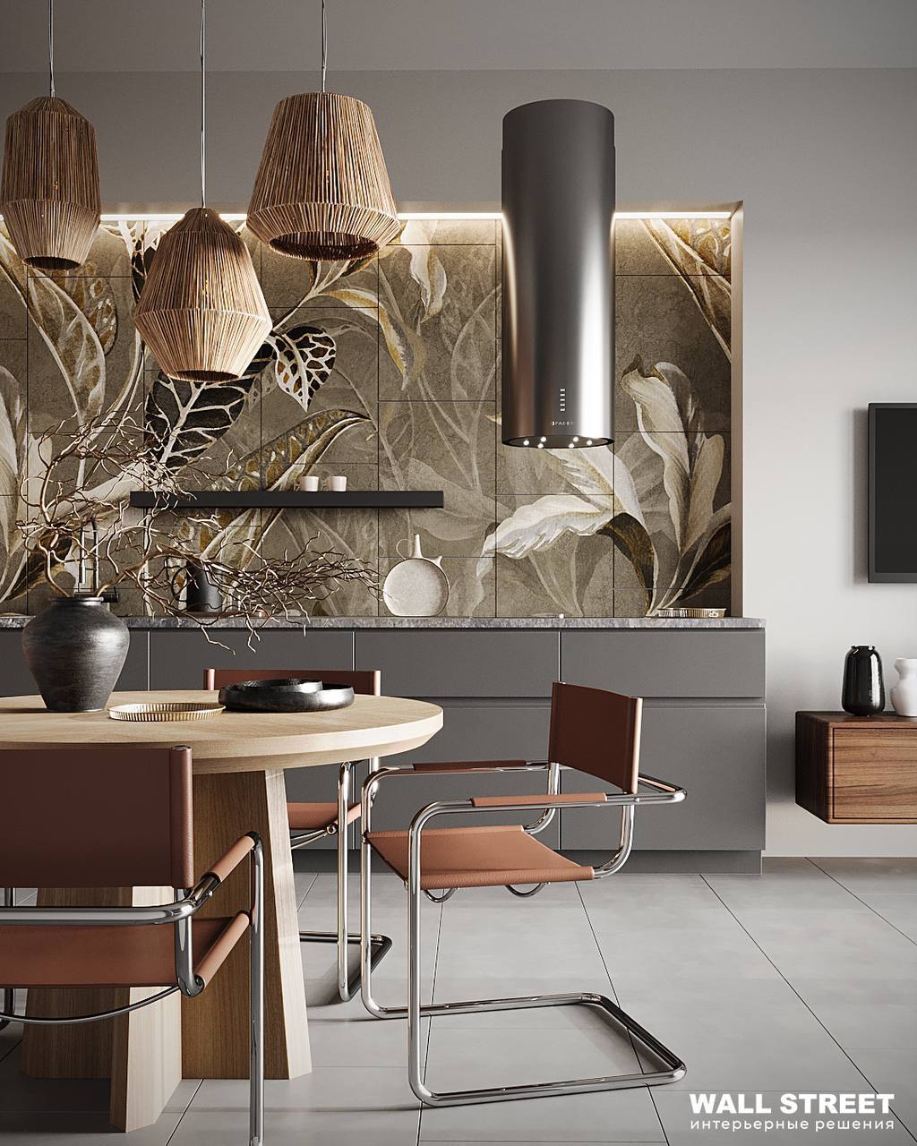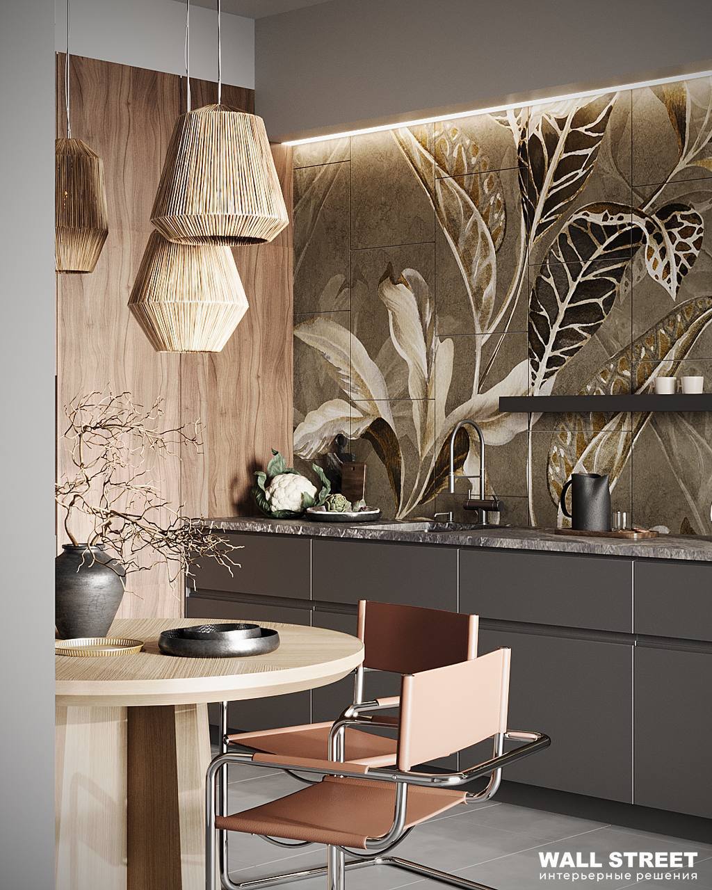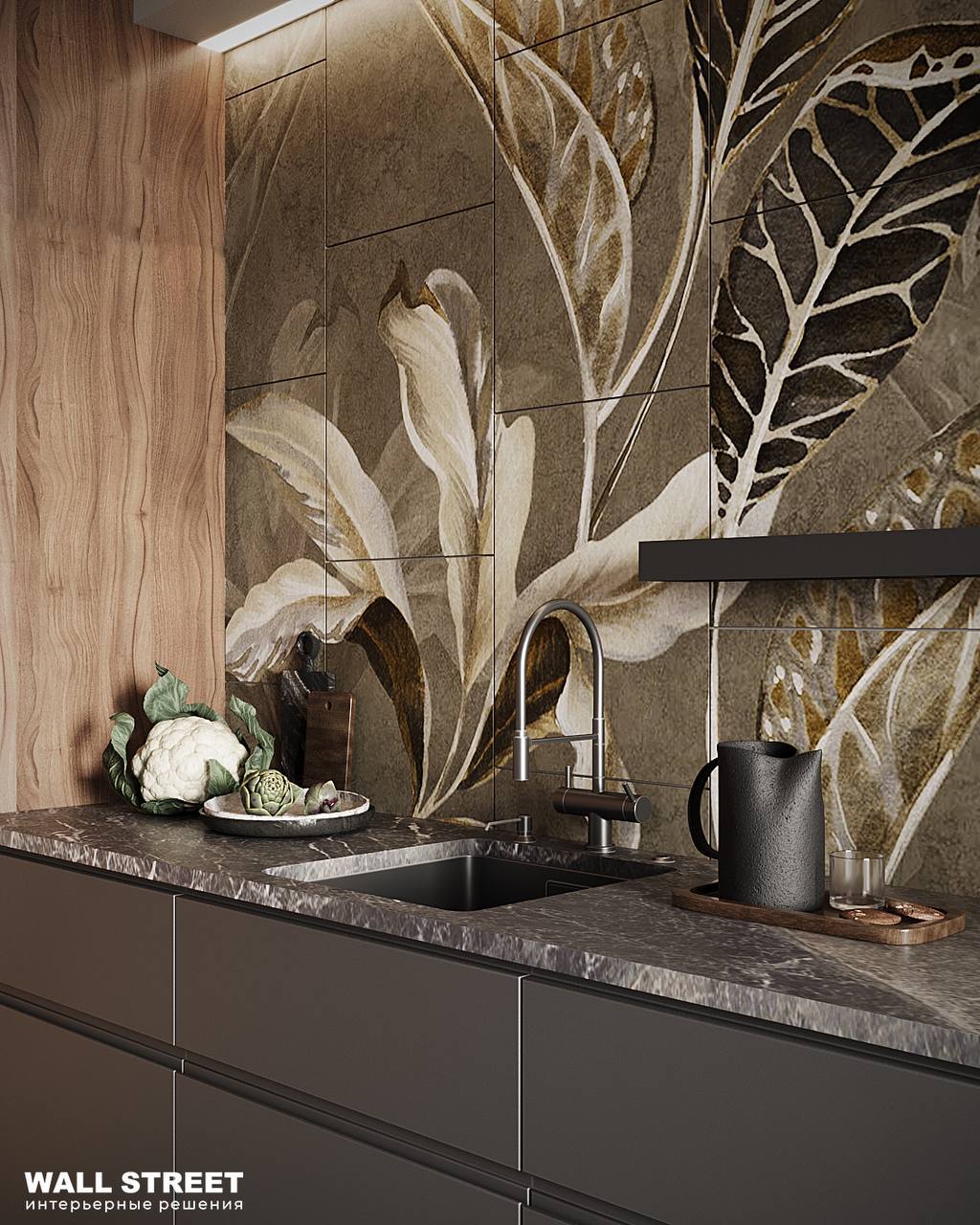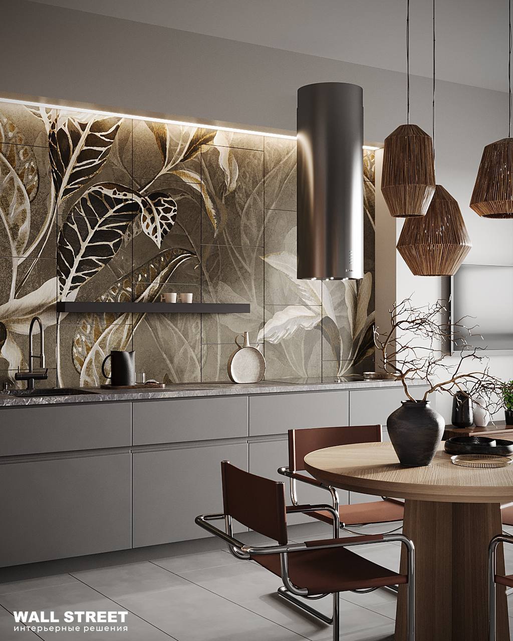 Проект кухни, в котором акцентом стала Неоплитка с сюжетом из коллекции SELVA. Нежные вручную прорисованные принты с тропическими растениями, созданные заботливыми руками наших дизайнеров, позволят создать в вашем интерьере настоящие тропики. Подарите себе вечное лето в пространстве вашего дома!