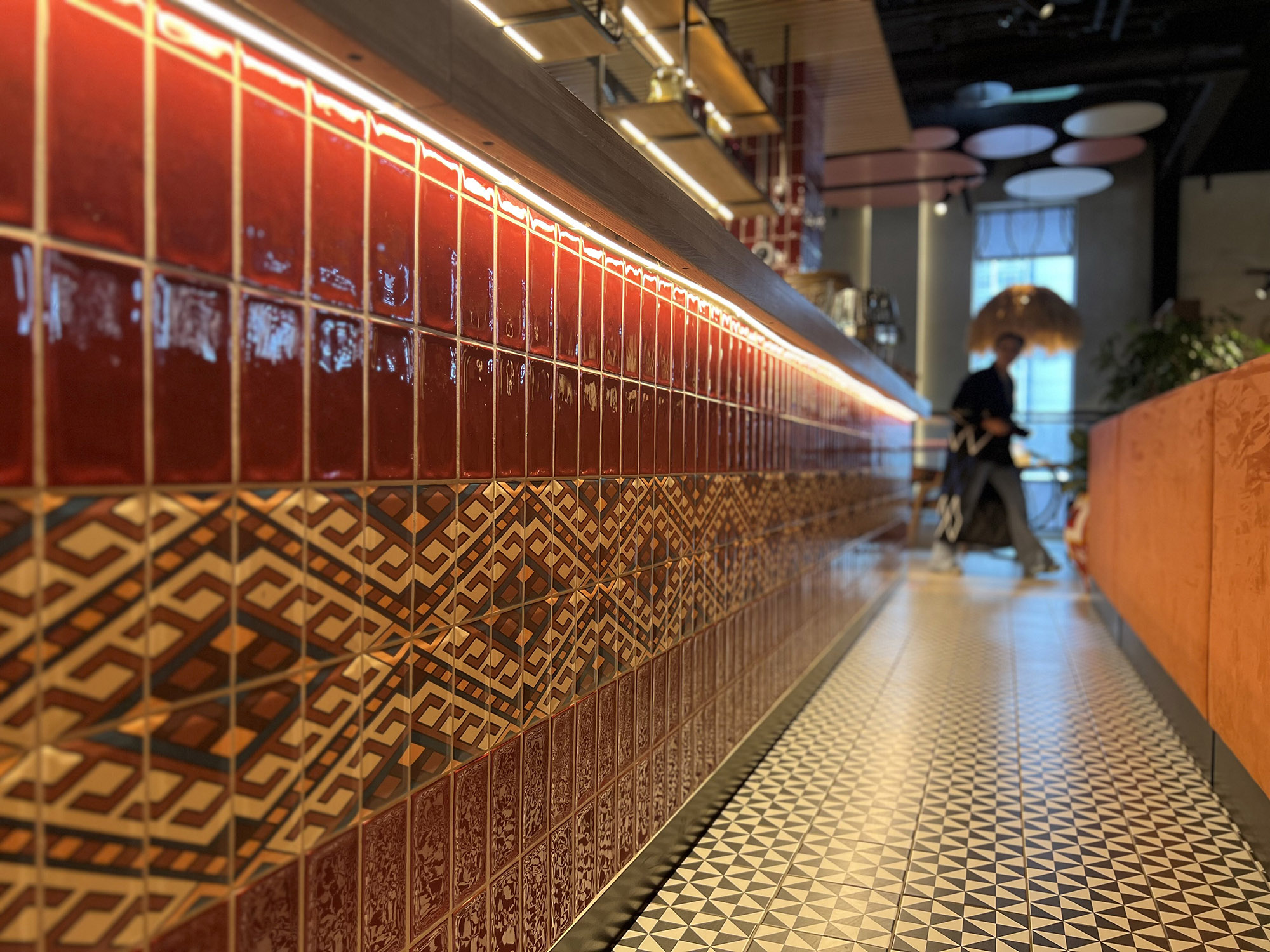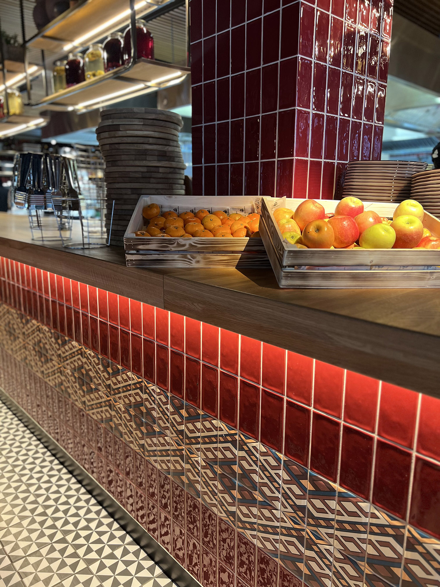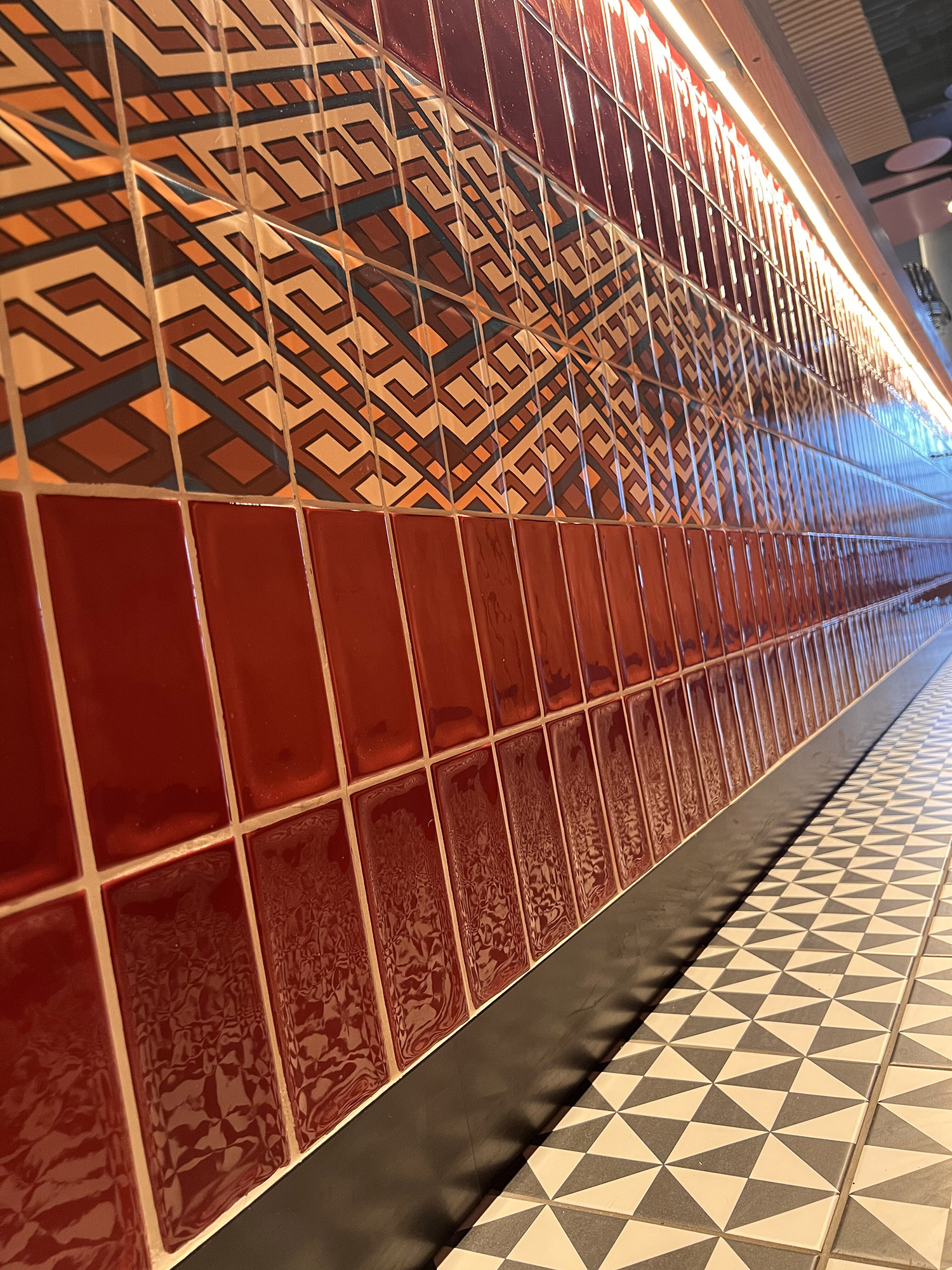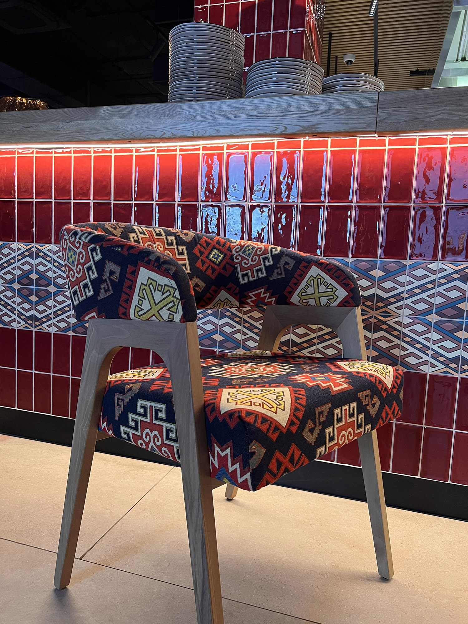 При выборе плитки для нового ресторана нашим дизайнерам пришлось столкнуться с непростой задачей: найти идеальный оттенок, который бы гармонично сочетался с текстилем и другими элементами интерьера. Особое внимание уделялось цвету кресел, которые имели мозаичный узор, напоминающий изображение на плитке. Дизайнеры вручную отрисовали вариант плитки, который идеально сочетается с цветом кресел и создает ощущение гармонии и завершенности в интерьере.