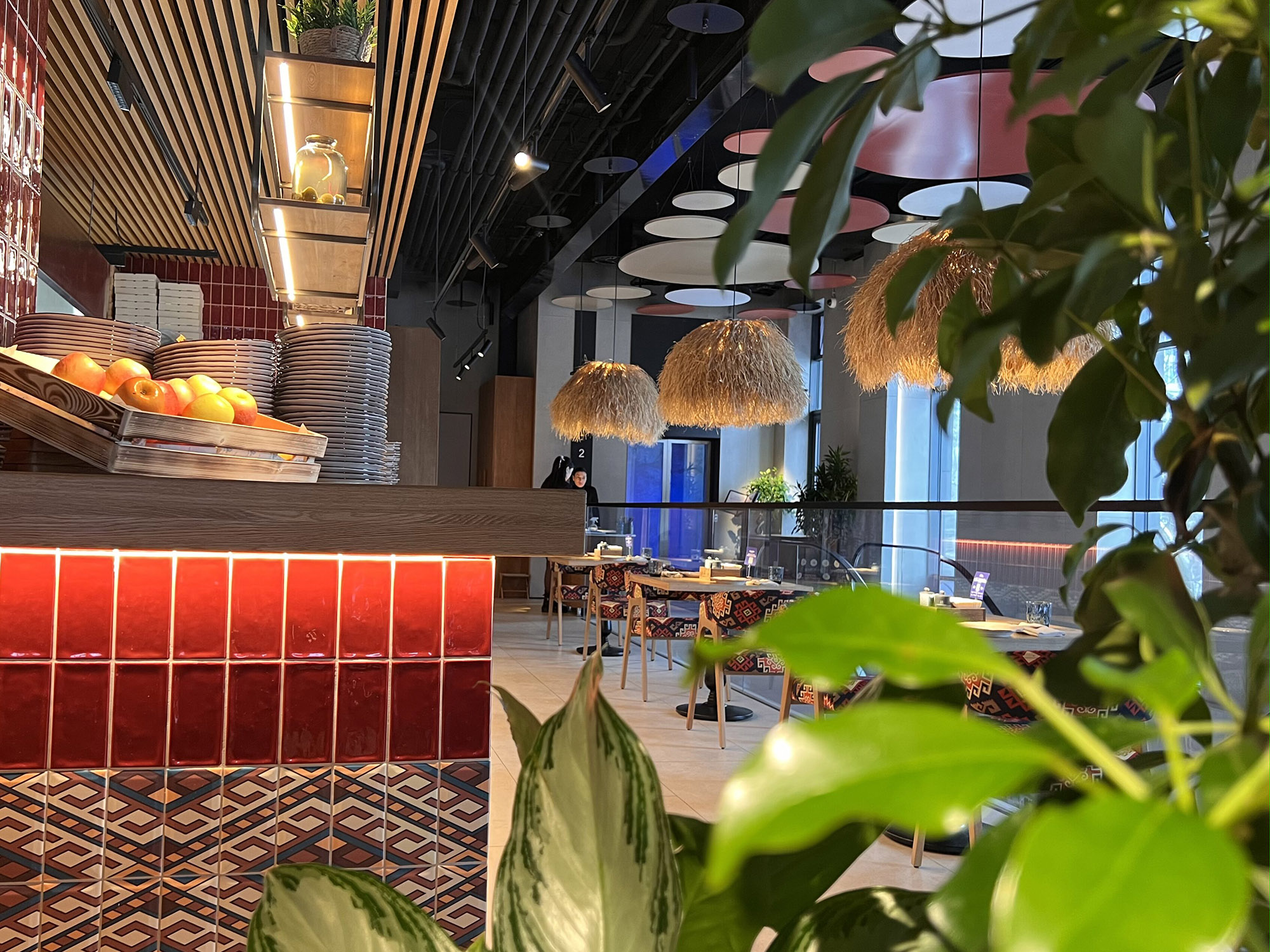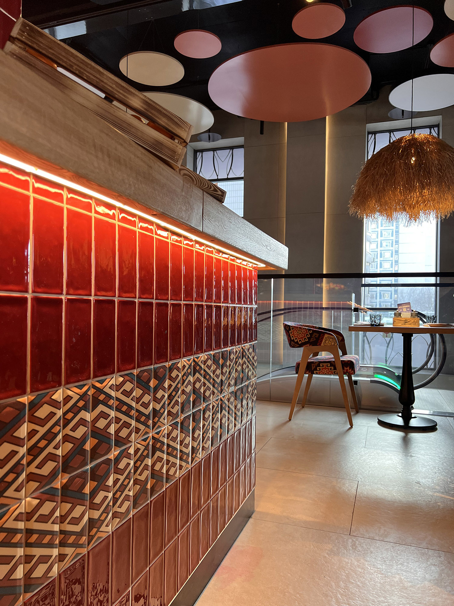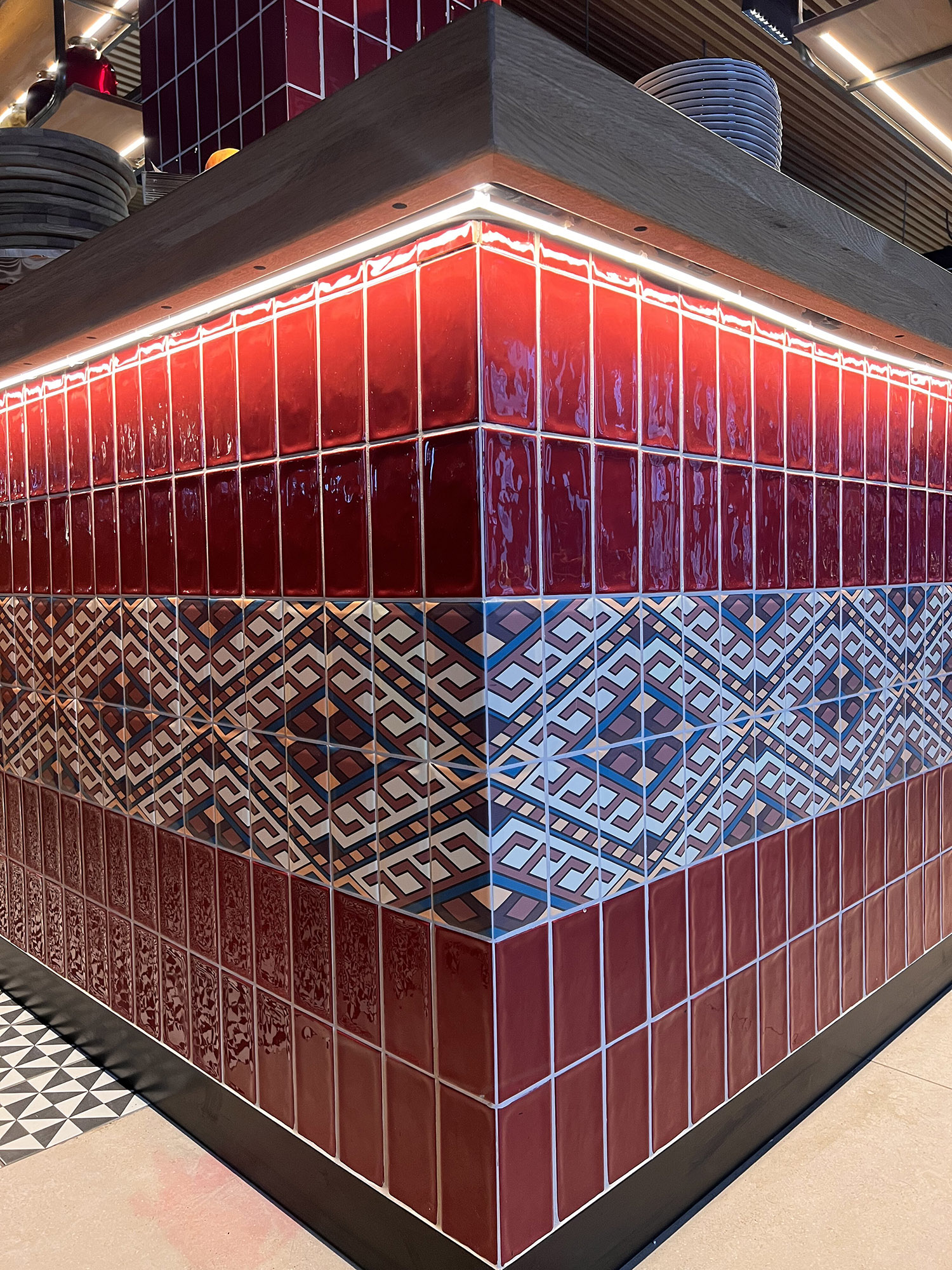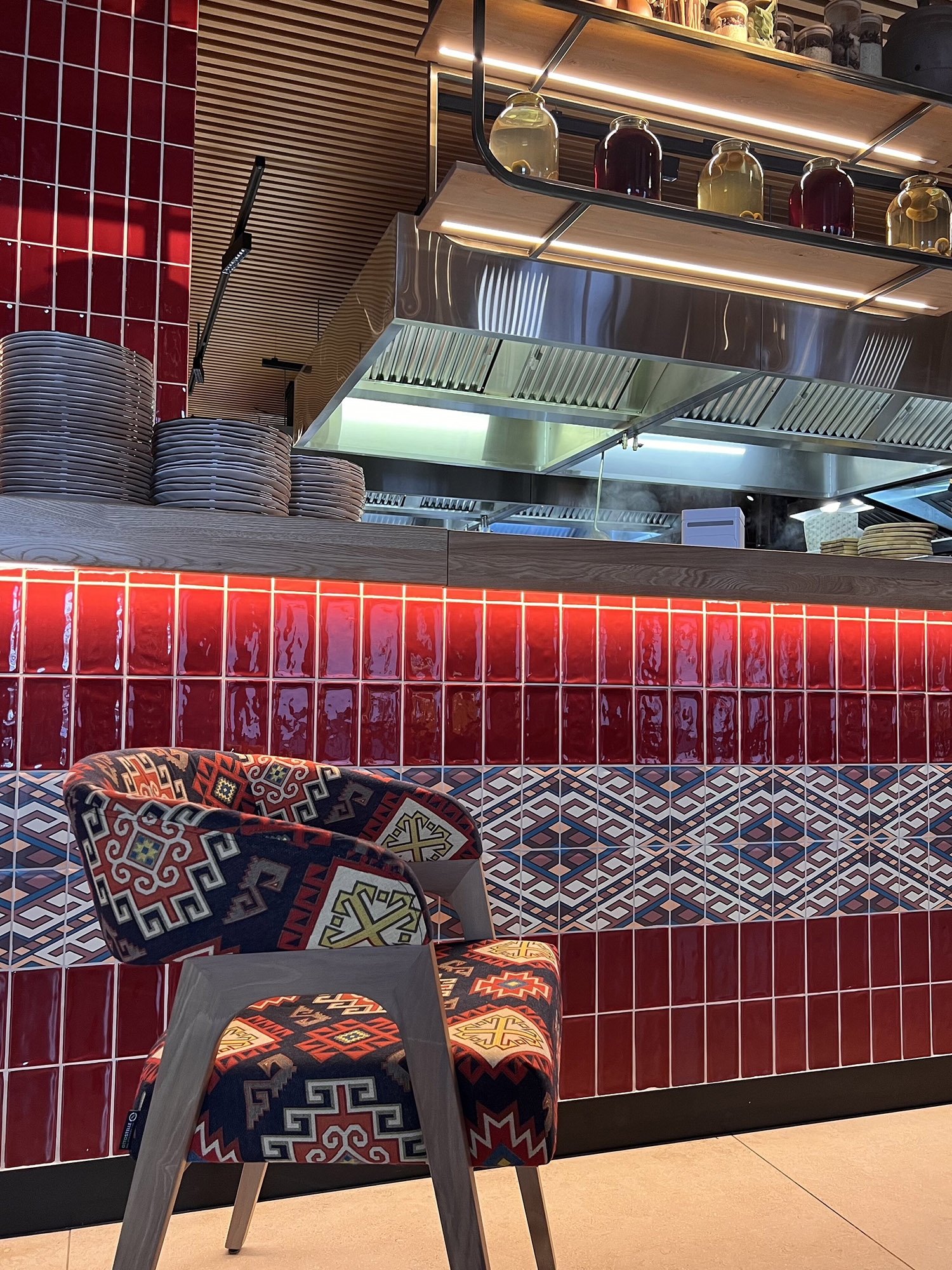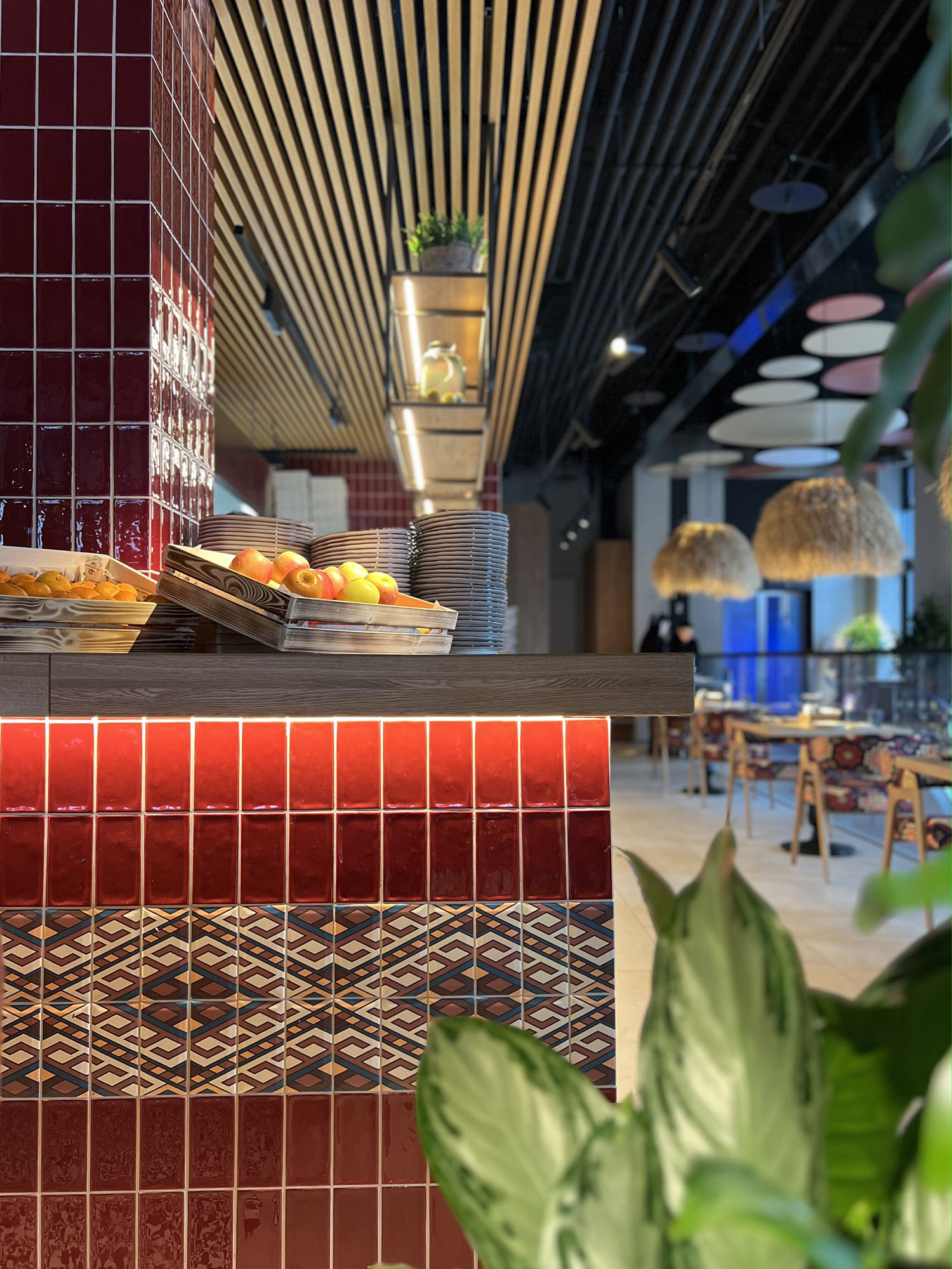 При выборе плитки для нового ресторана нашим дизайнерам пришлось столкнуться с непростой задачей: найти идеальный оттенок, который бы гармонично сочетался с текстилем и другими элементами интерьера. Особое внимание уделялось цвету кресел, которые имели мозаичный узор, напоминающий изображение на плитке. Дизайнеры вручную отрисовали вариант плитки, который идеально сочетается с цветом кресел и создает ощущение гармонии и завершенности в интерьере.