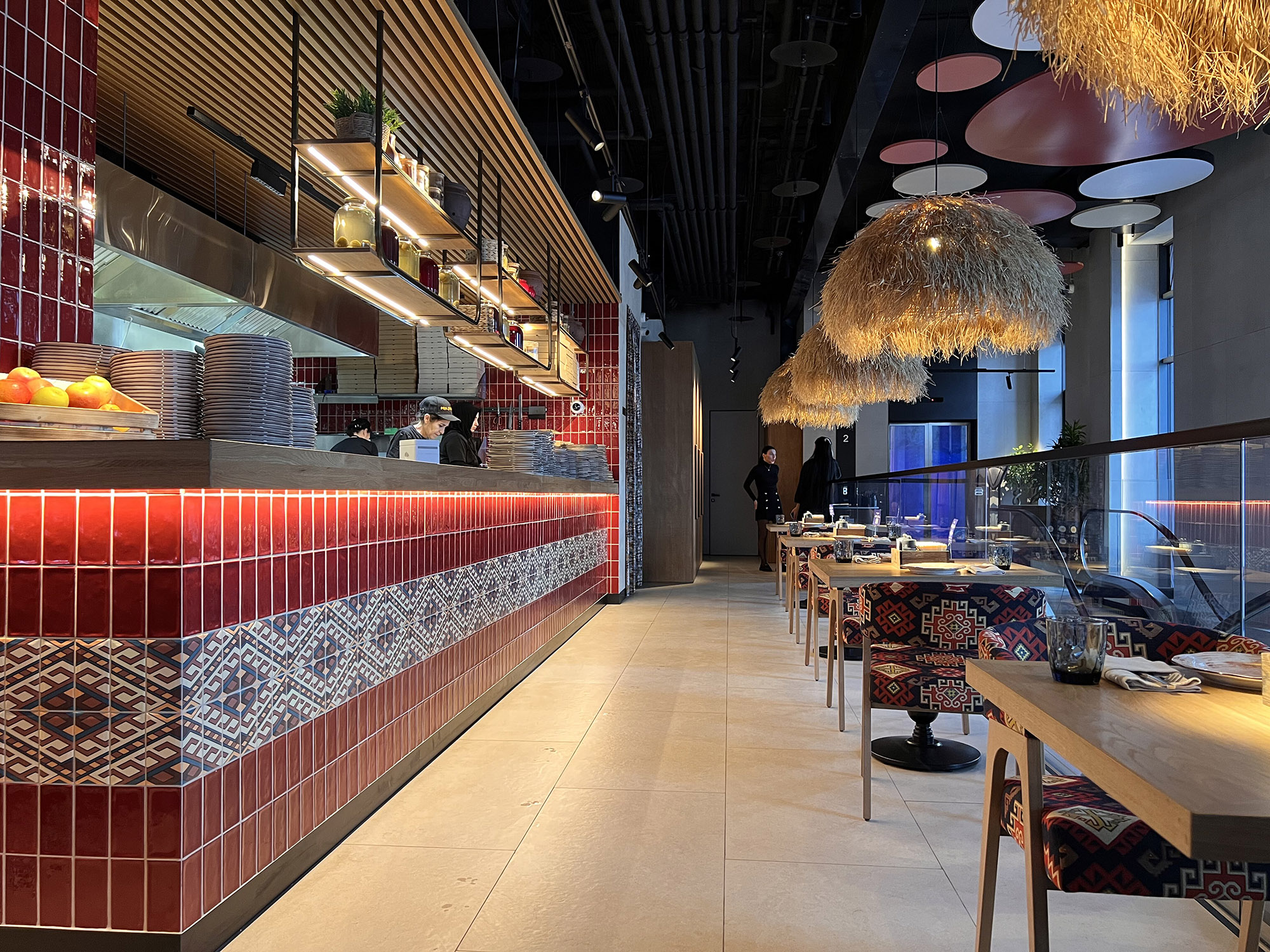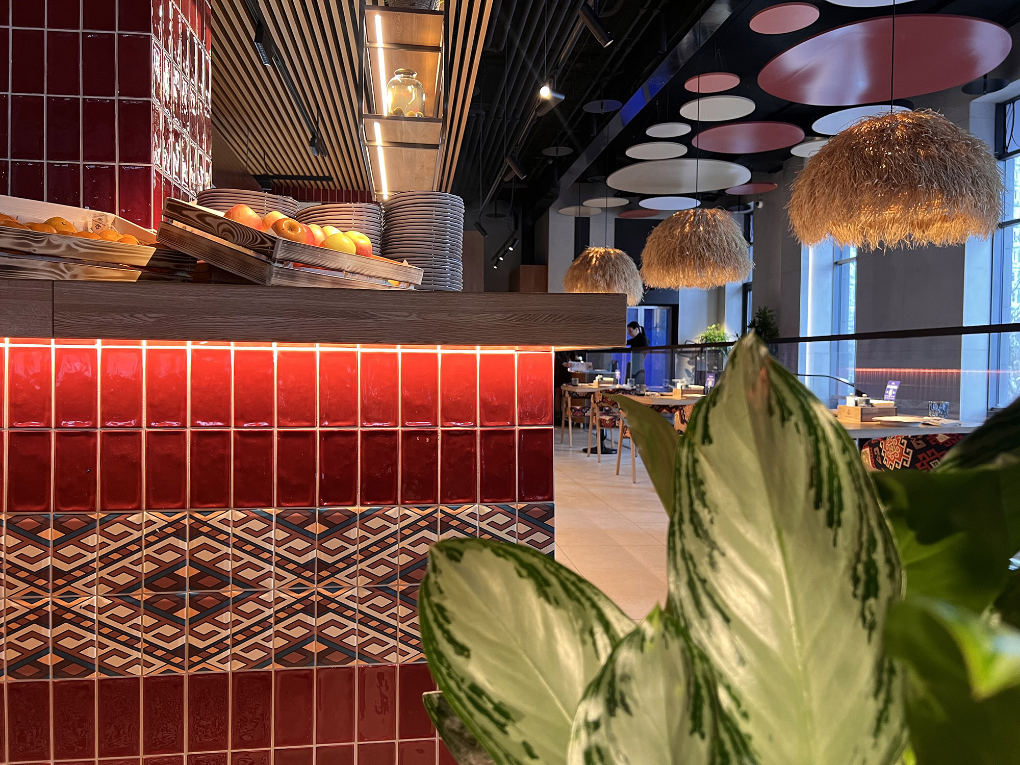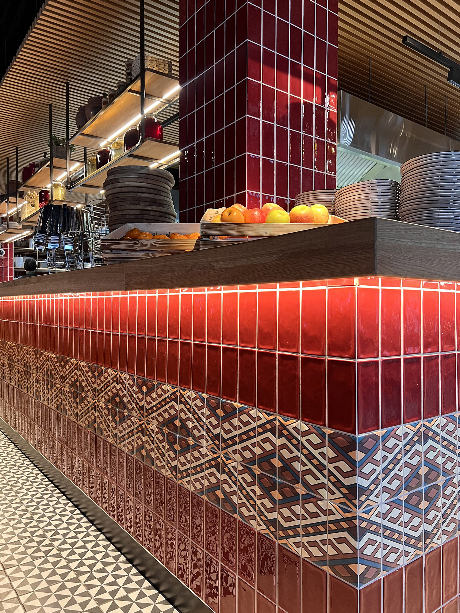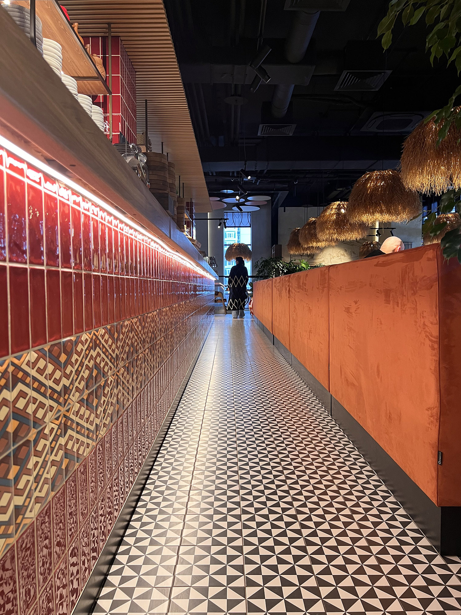 При выборе плитки для нового ресторана нашим дизайнерам пришлось столкнуться с непростой задачей: найти идеальный оттенок, который бы гармонично сочетался с текстилем и другими элементами интерьера. Особое внимание уделялось цвету кресел, которые имели мозаичный узор, напоминающий изображение на плитке. Дизайнеры вручную отрисовали вариант плитки, который идеально сочетается с цветом кресел и создает ощущение гармонии и завершенности в интерьере.
