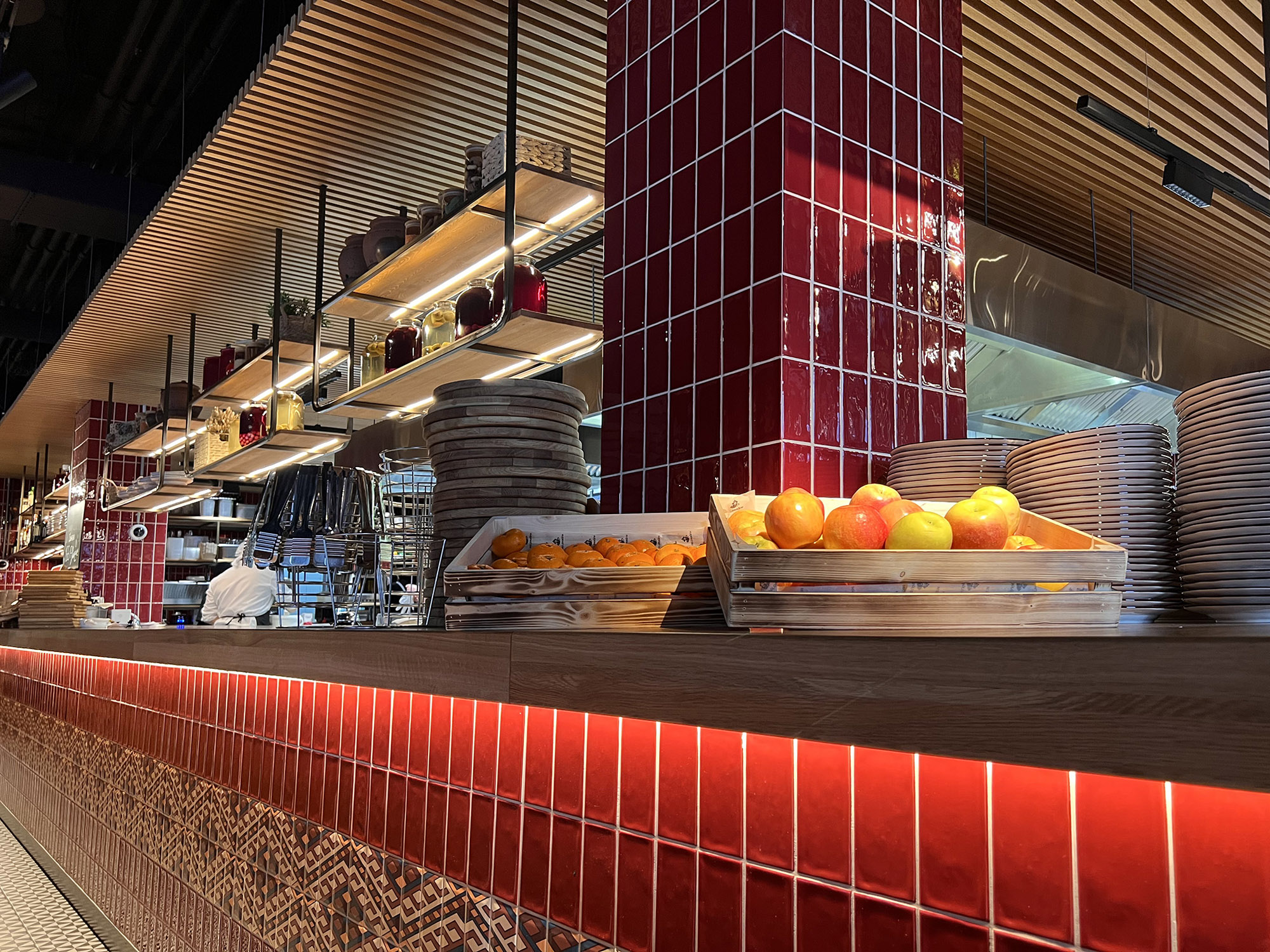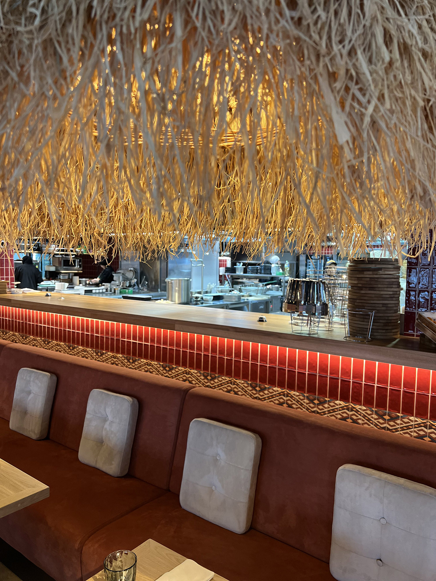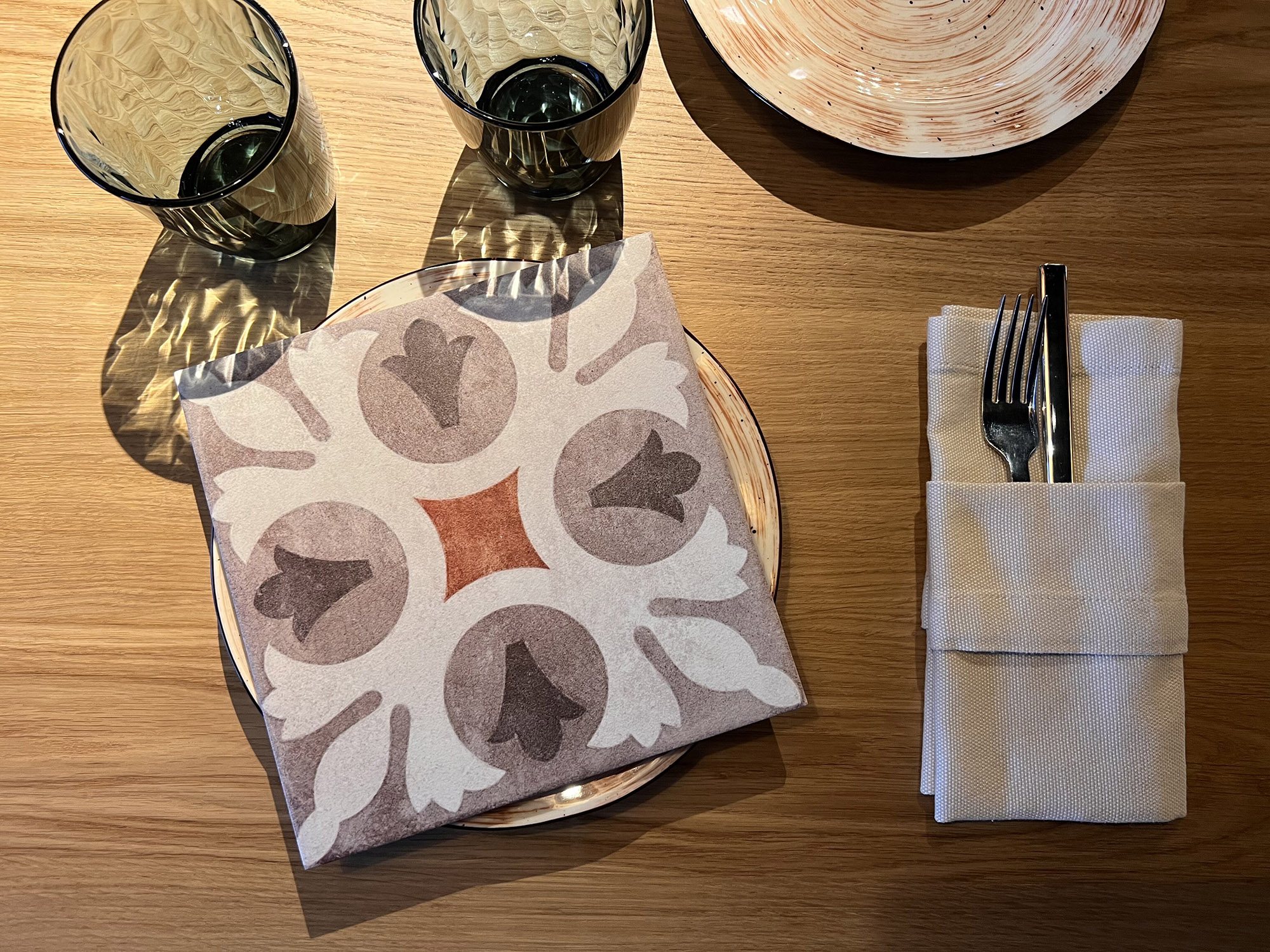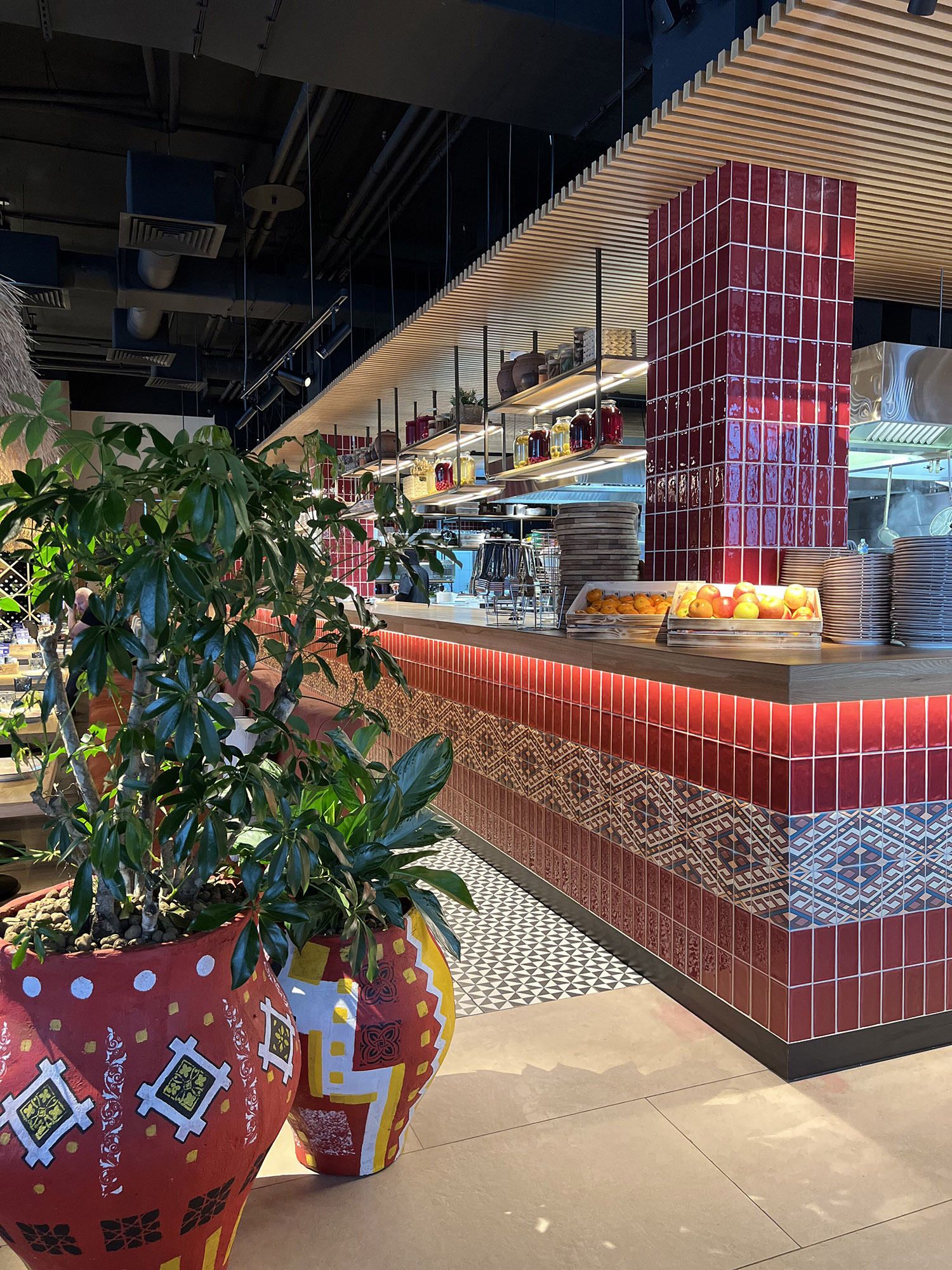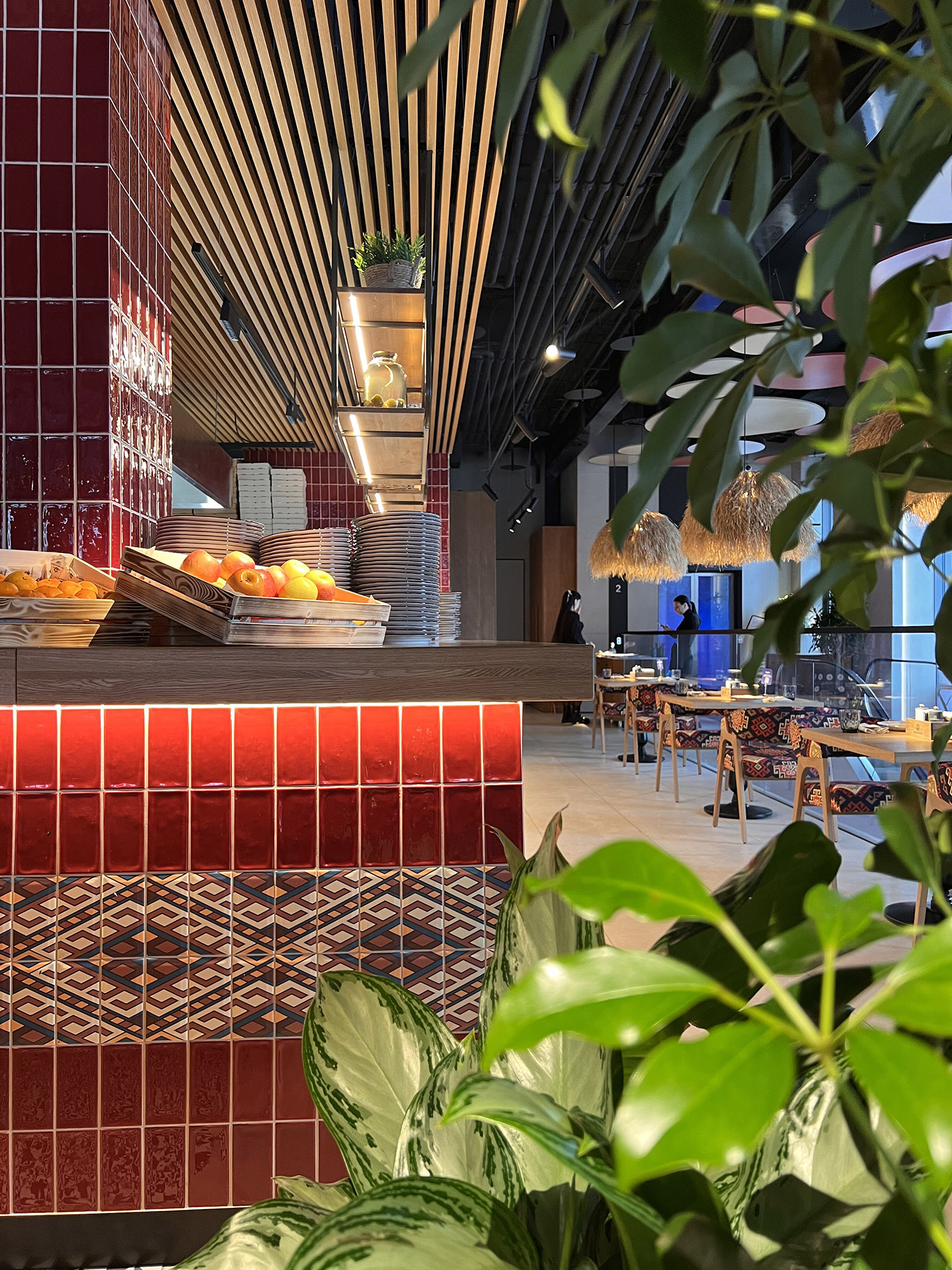 При выборе плитки для нового ресторана нашим дизайнерам пришлось столкнуться с непростой задачей: найти идеальный оттенок, который бы гармонично сочетался с текстилем и другими элементами интерьера. Особое внимание уделялось цвету кресел, которые имели мозаичный узор, напоминающий изображение на плитке. Дизайнеры вручную отрисовали вариант плитки, который идеально сочетается с цветом кресел и создает ощущение гармонии и завершенности в интерьере.