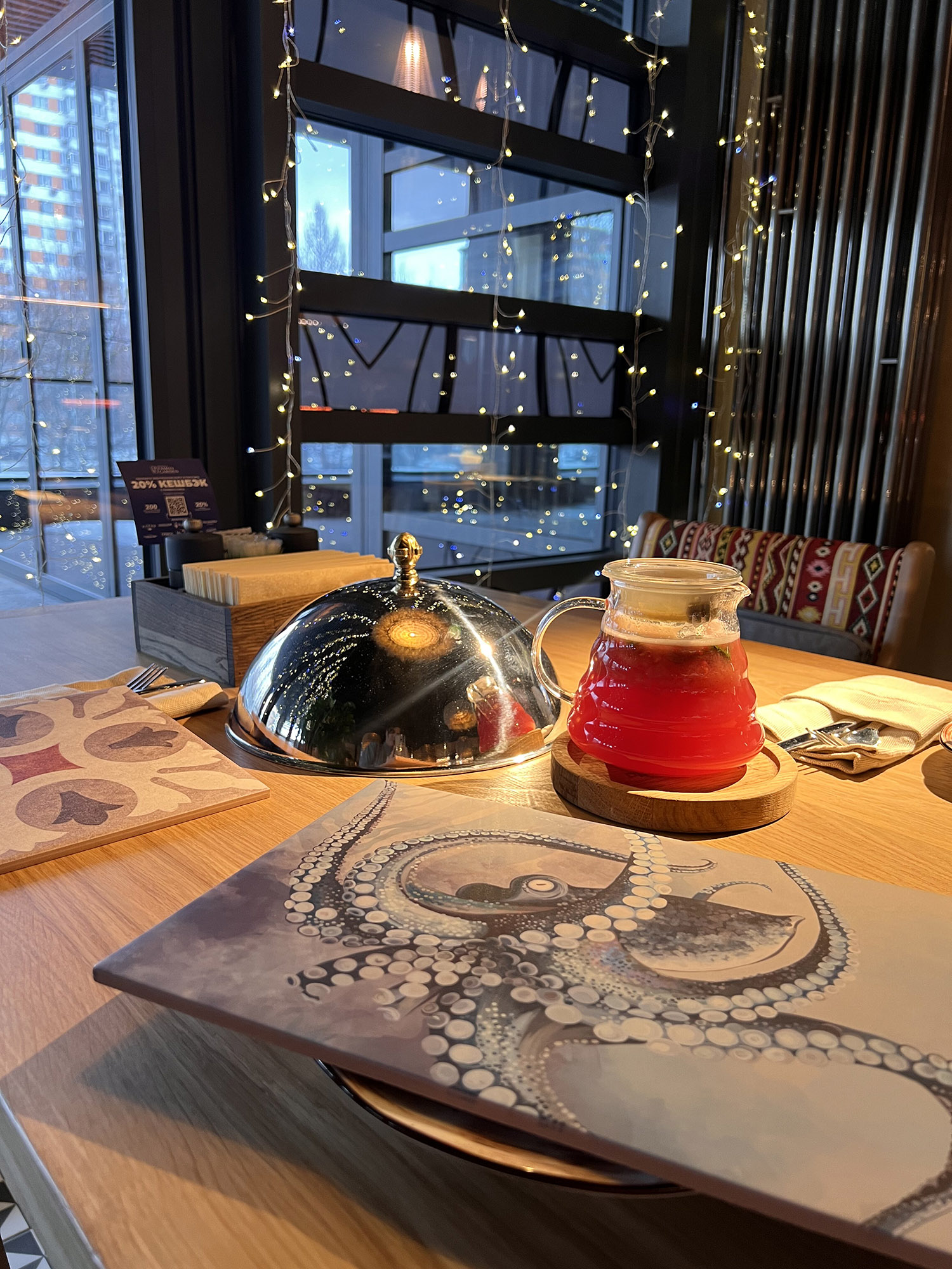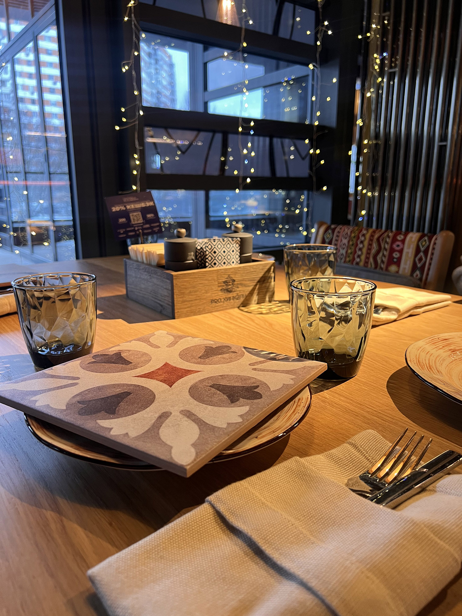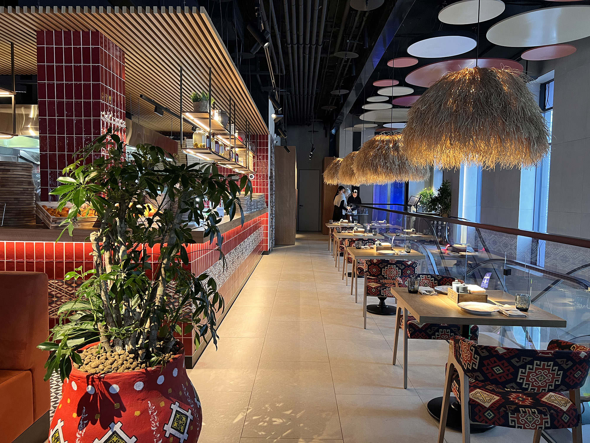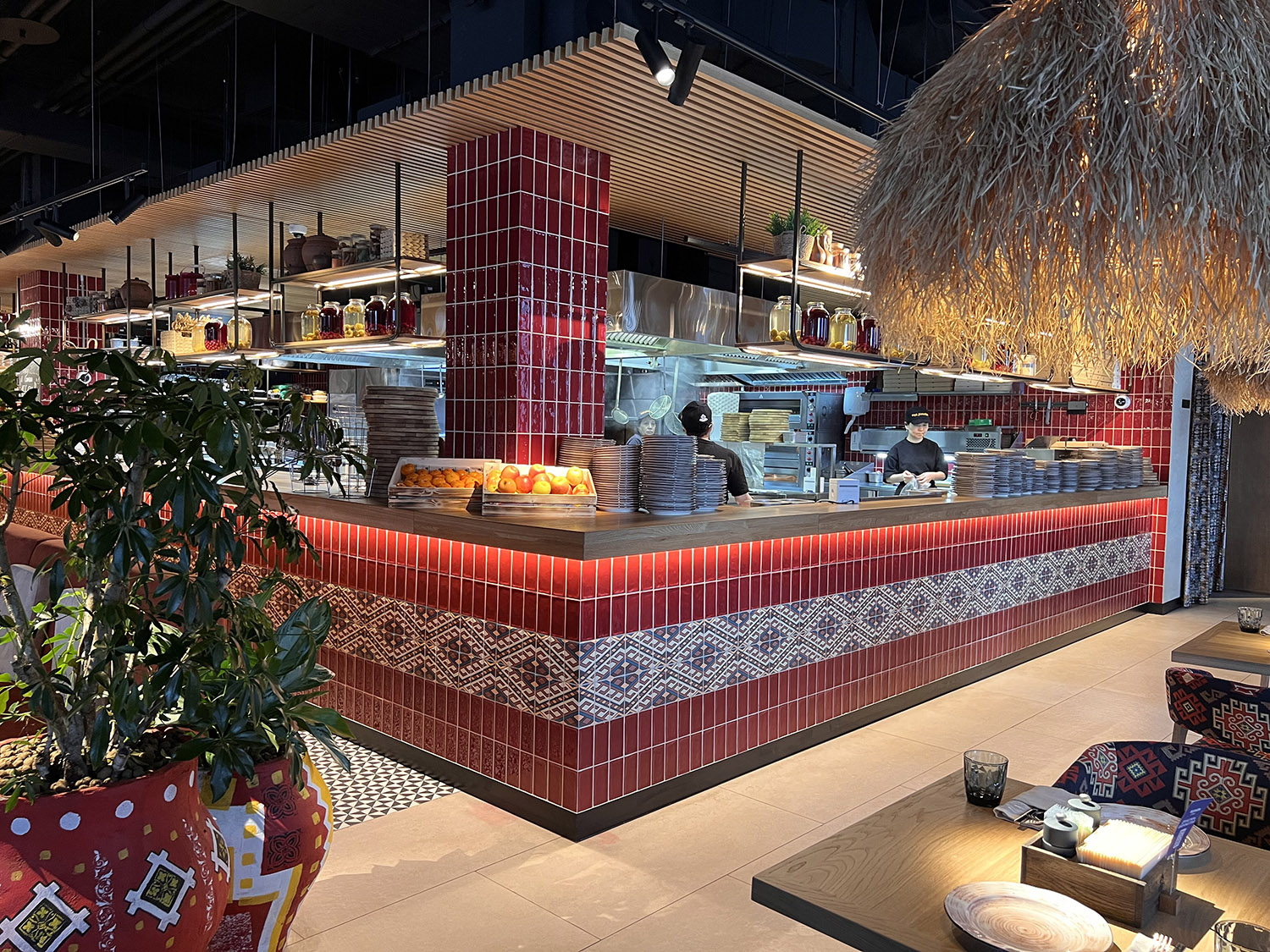При выборе плитки для нового ресторана нашим дизайнерам пришлось столкнуться с непростой задачей: найти идеальный оттенок, который бы гармонично сочетался с текстилем и другими элементами интерьера. Особое внимание уделялось цвету кресел, которые имели мозаичный узор, напоминающий изображение на плитке. Дизайнеры вручную отрисовали вариант плитки, который идеально сочетается с цветом кресел и создает ощущение гармонии и завершенности в интерьере.