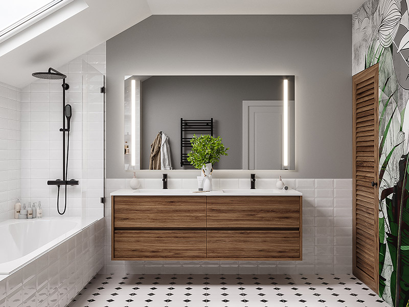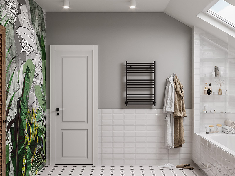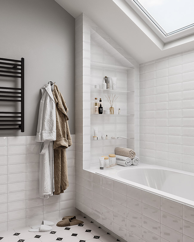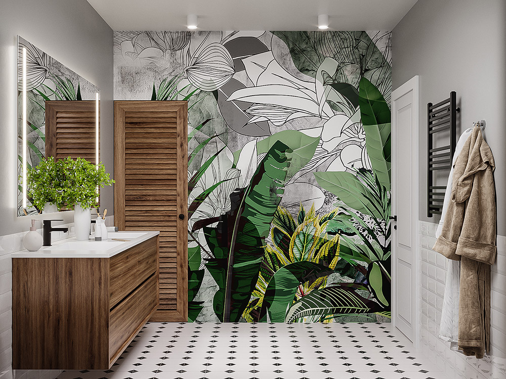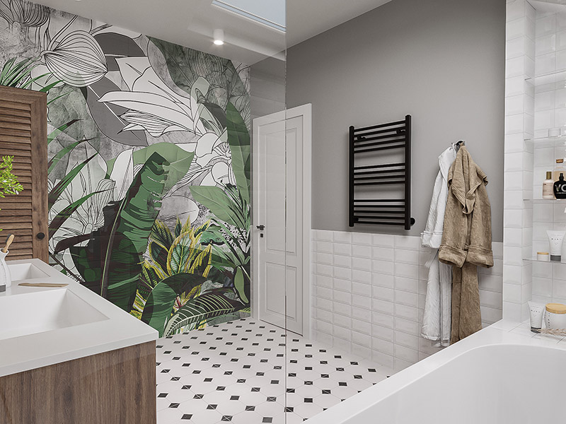 Большой плюс данных фресок в том, что их не страшно использовать во влажных помещениях. Интерьер получился с элементами Скандинавии. Графичности добавили чёрные детали: смесители, фурнитура, напольная плитка с геометрическим рисунком.