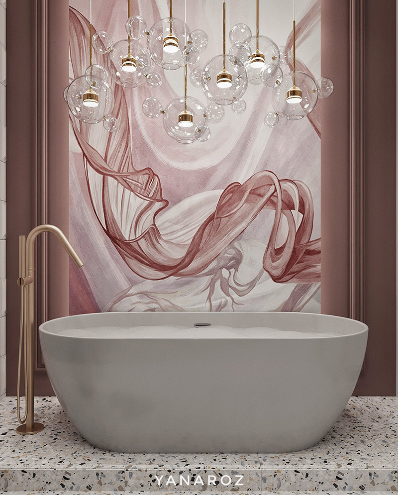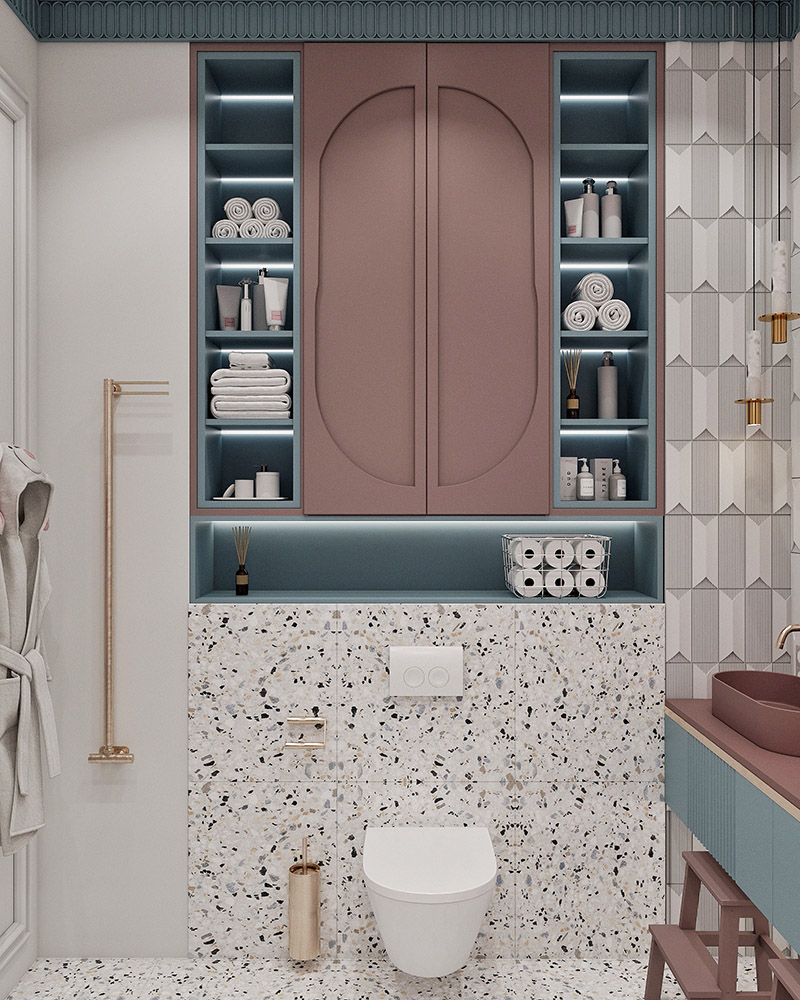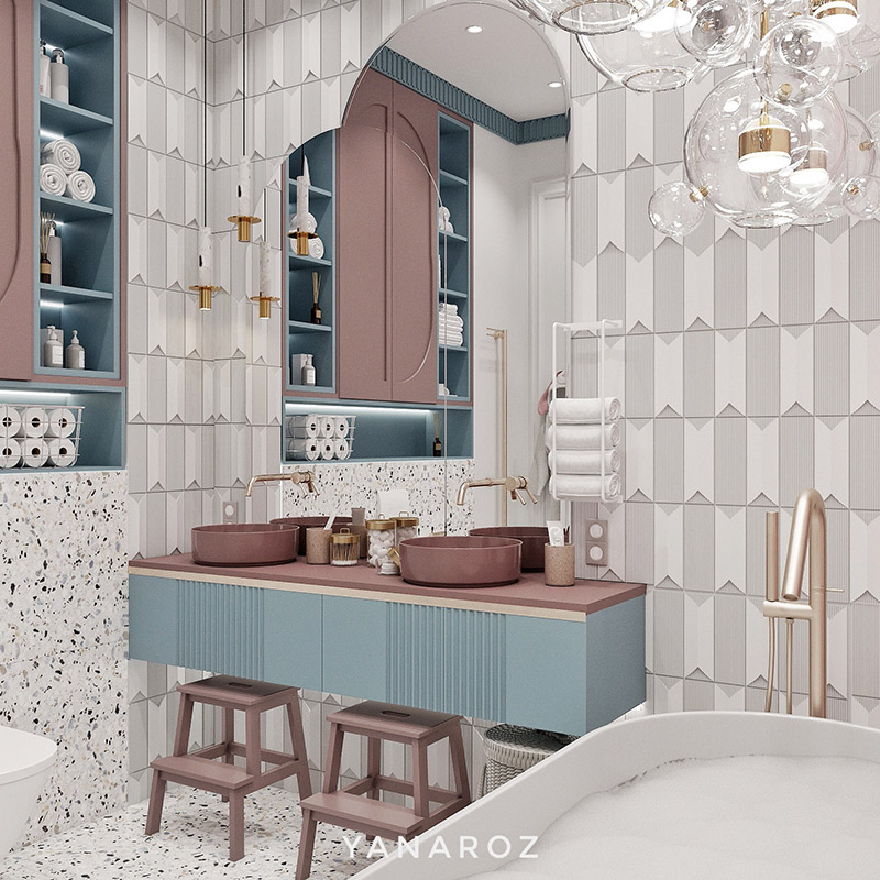 Проект ванной комнаты для двух дочек. Пожеланием мамы было: отдельностоящая ванна, 2 раковины, место для хранения, наличие любимого розового цвета девочек.