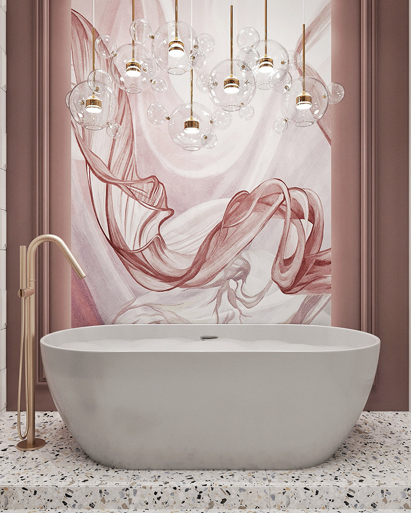 Получилось легкое пространство благодаря акцентной воздушной фреске «Breeze» и легкого освещения в виде шаров. Элементы ванной комнаты переплетаются с детской, что дает целостность композиции.