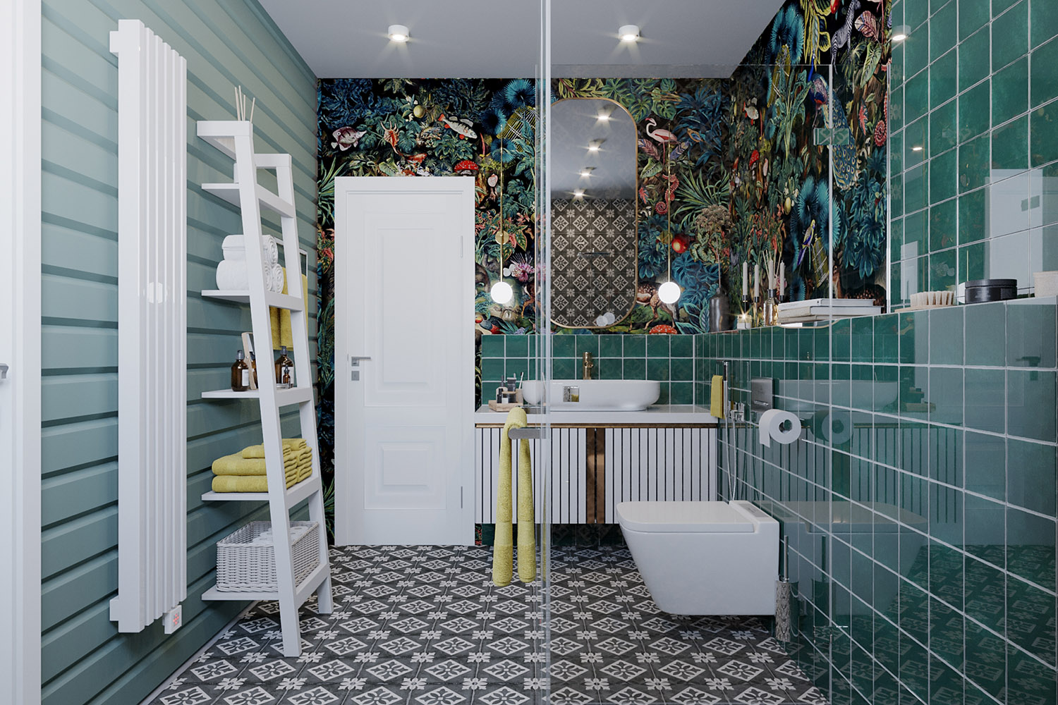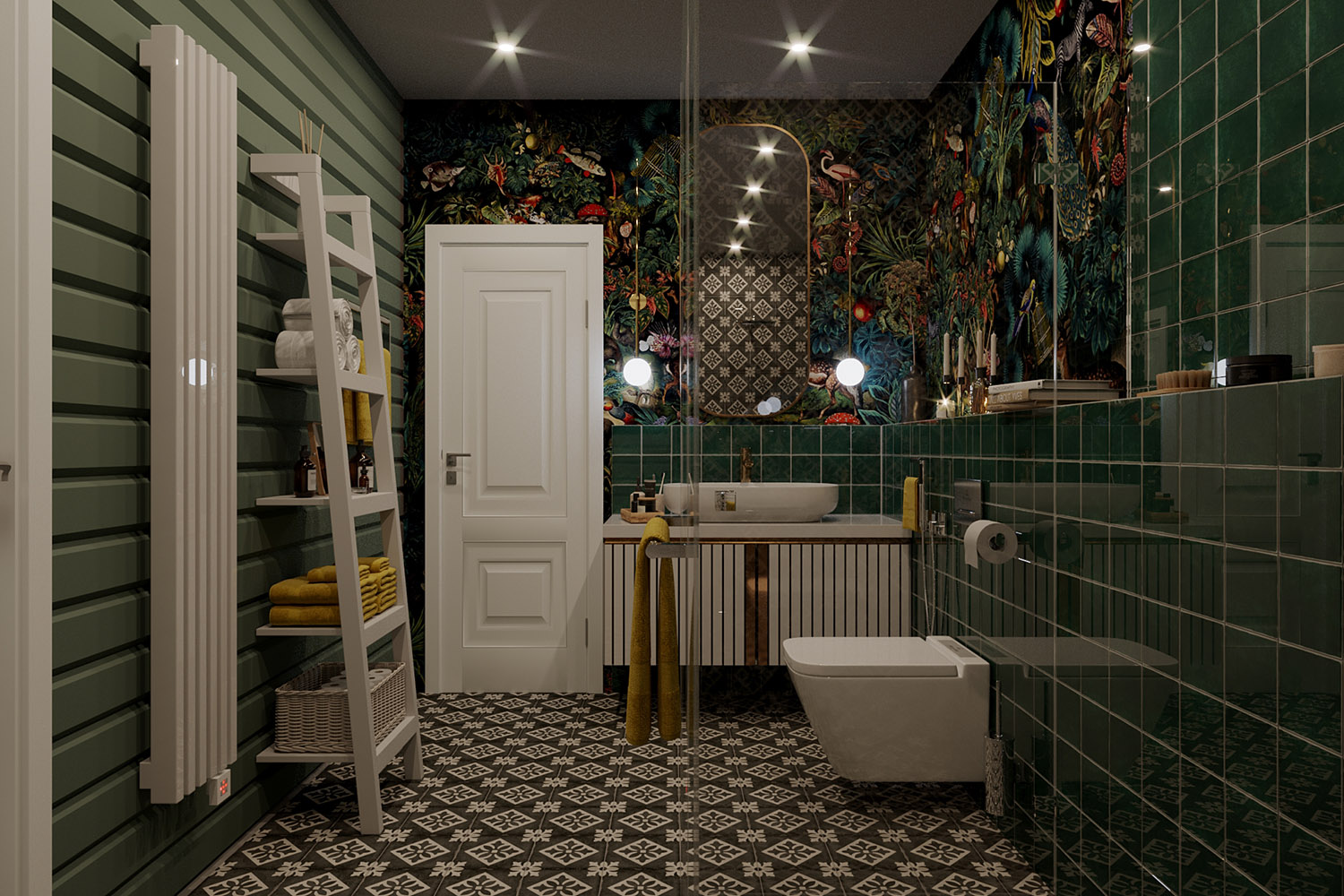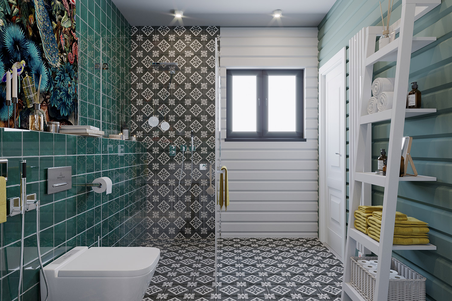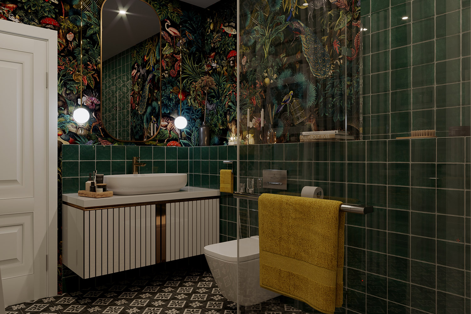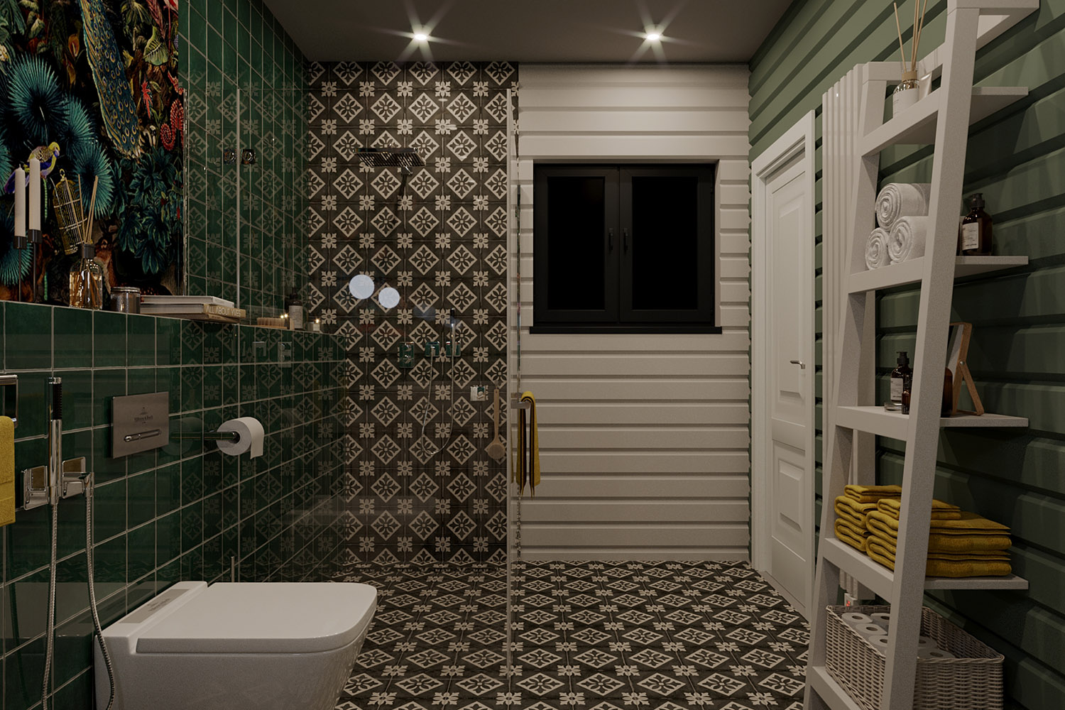 «Весь проект дома очень яркий, поэтому санузел не исключение. Так как заказчики были готовы к разным смелым решениям, я предложила добавить на две стены фрески из коллекции «Eden» вместо привычной плитки» — пишет автор этого проекта Кристина.
