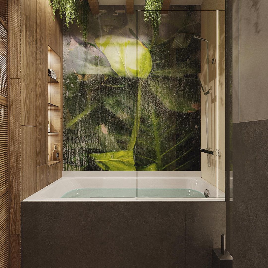 Для поддержания атмосферы были выбраны фоновые обои из коллекции «Frame-2019» с тропическими принтами и атмосферной подсветкой. Поскольку обои не боятся воды, при специальном монтаже они могут быть использованы даже в зоне ванны и душа!