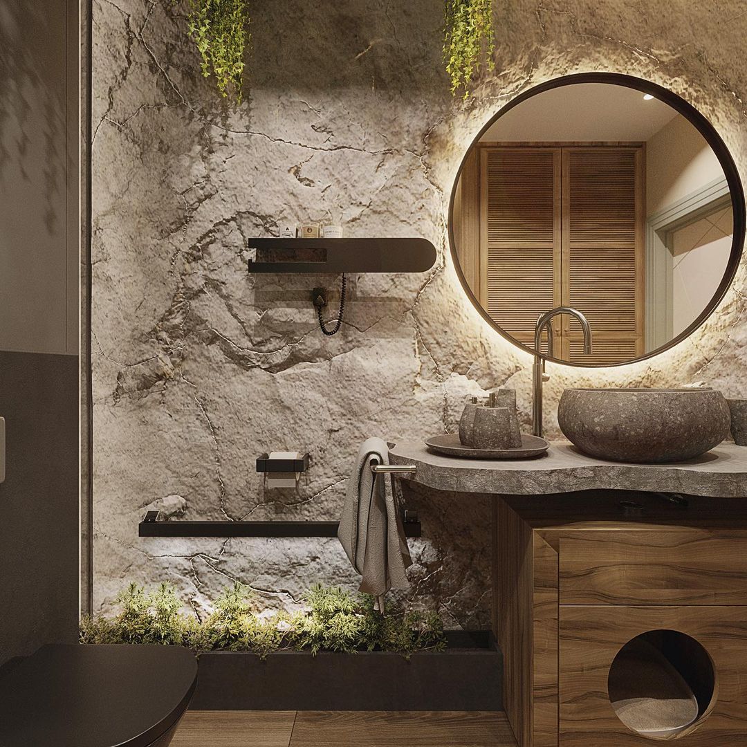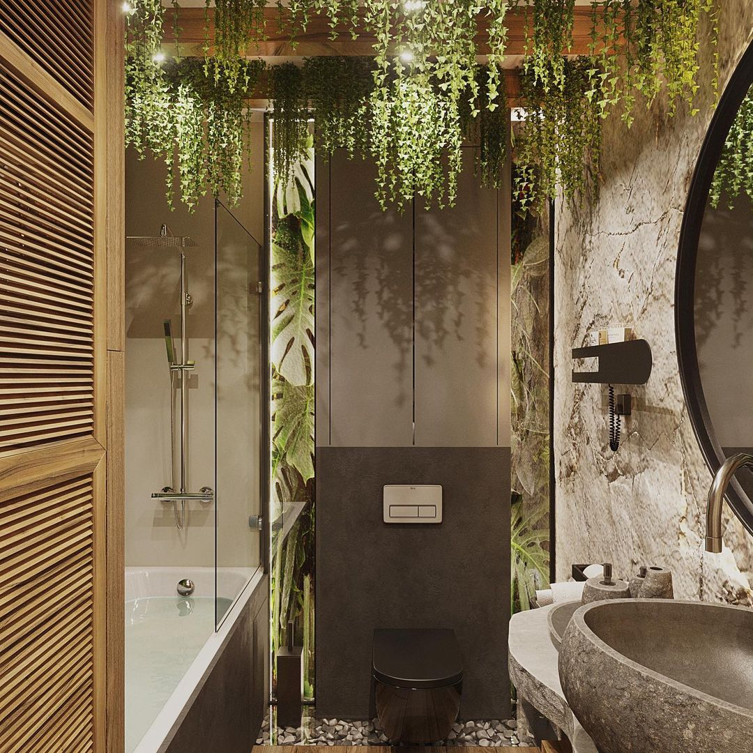Это проект ванной комнаты для ребят, влюблённых в пейзажи экваториальной и субтропической зоны: мягкий песок побережья, сочные струящиеся зеленью влажные леса, красивый древесный отлив, бирюза рифового океанического побережья, выступающие камни и скалы...