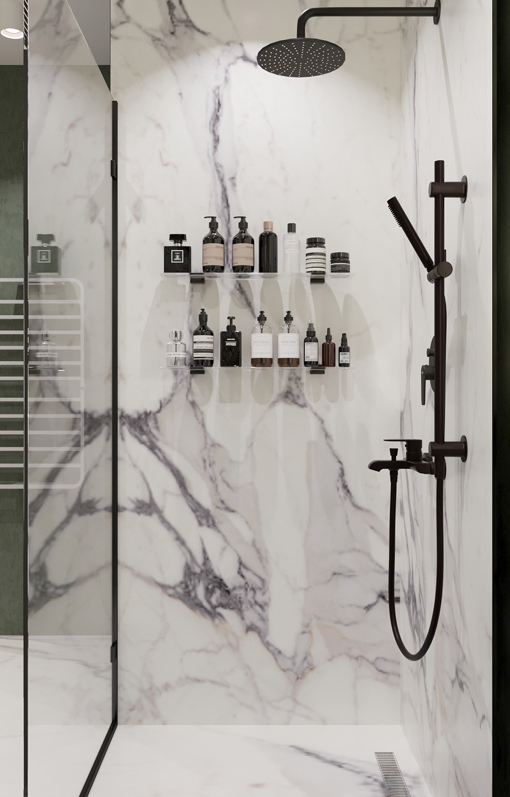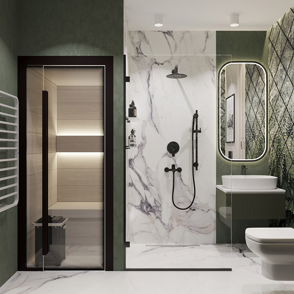 Это санузел из проекта однокомнатной квартиры в г. Москва, общей площадью 83 м². Задача стояла — из однушки сделать трешку. Спальня, объединенная кухня-гостиная, где вся семья будет собираться вместе, два санузла, и обязательно найти место для сауны на 2 персоны. Заказчики — молодая семья с 3 малышами: двумя дочками и сыночком.