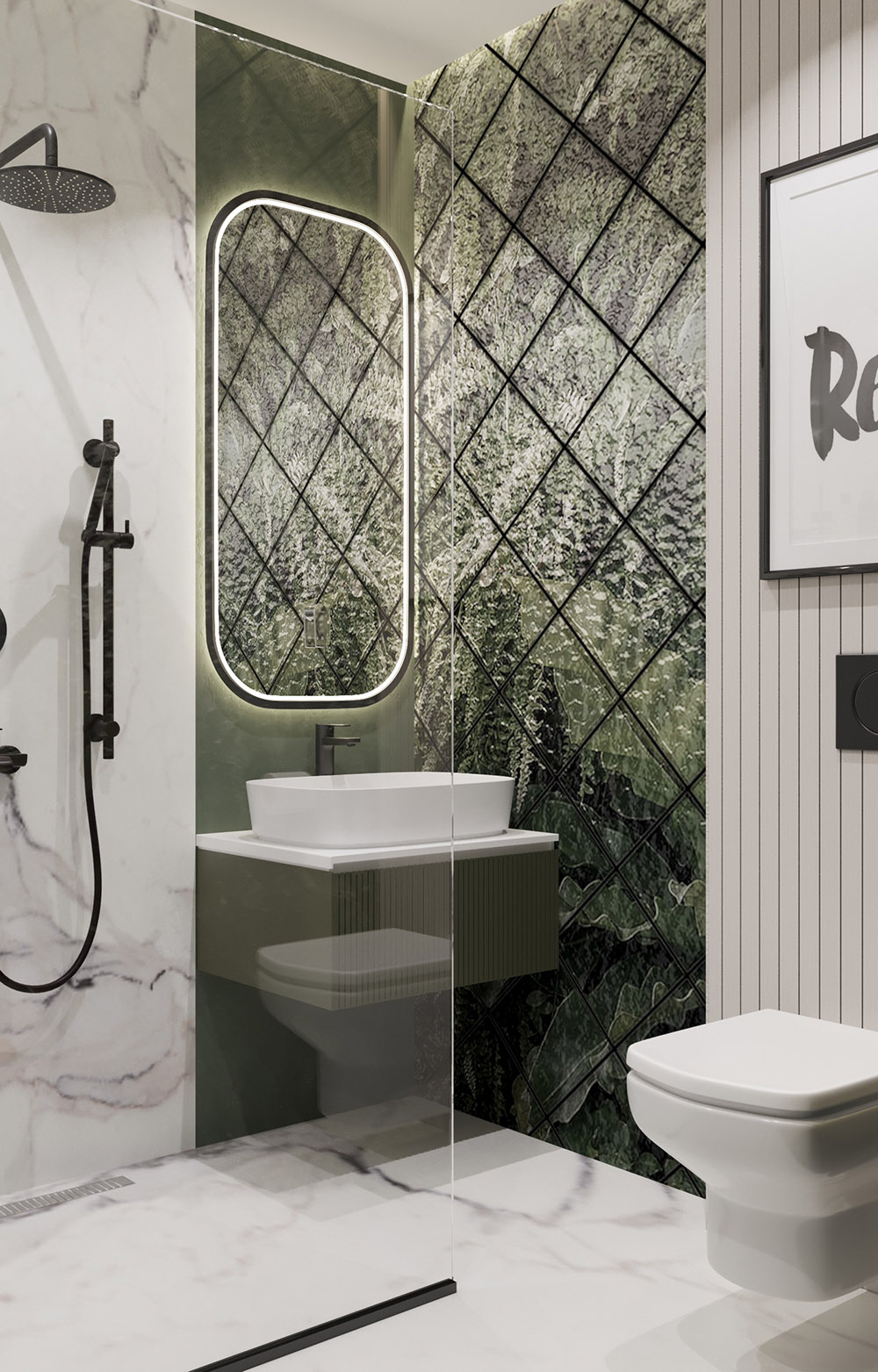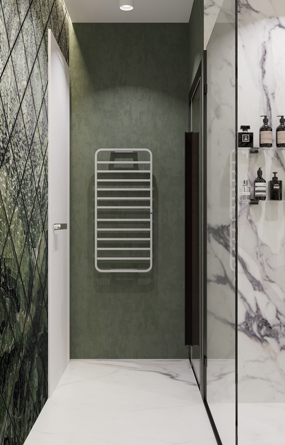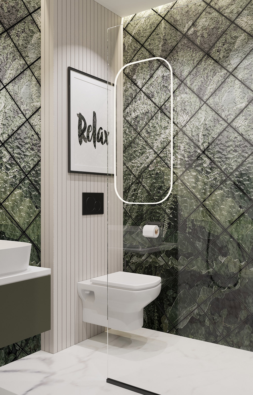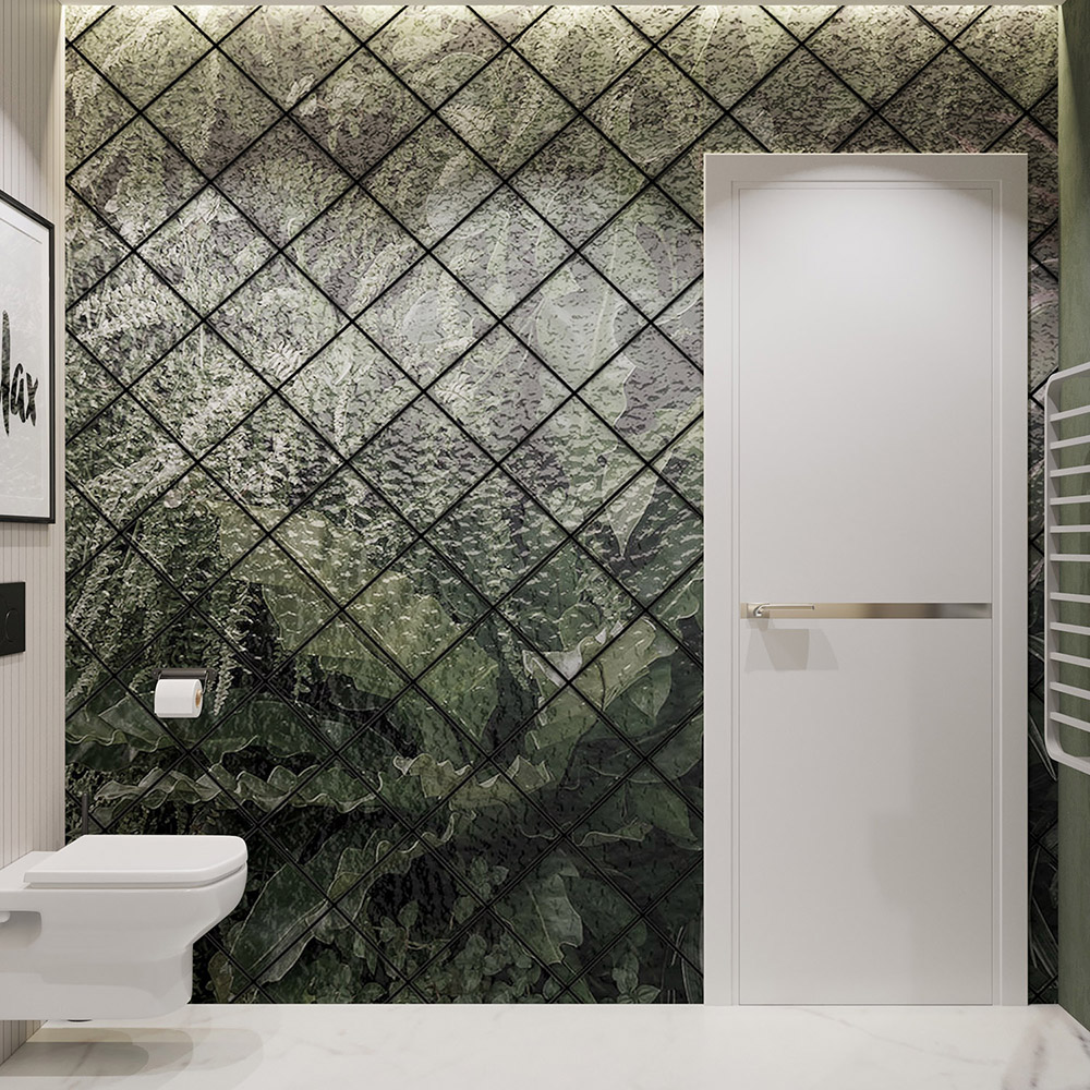 Заказчик не любит плитку, считает плиточные швы не эстетичными и портящими весь интерьер. Поэтому на стенах мы использовали влагостойки обои из коллекции «Frame-2019» в сочетании с декоративной штукатуркой. На полу — наливной пол.