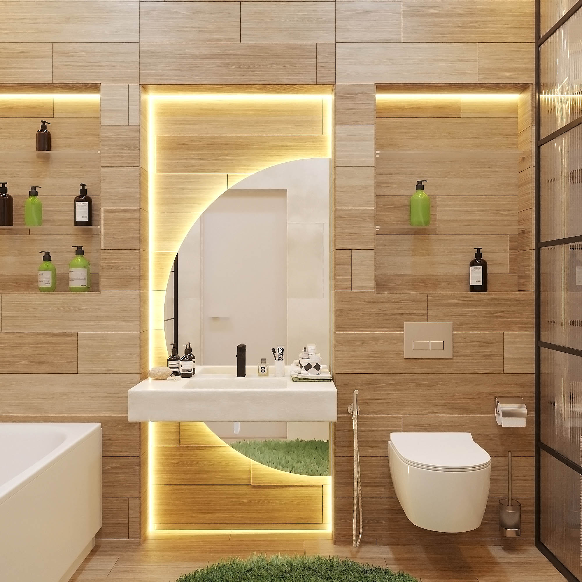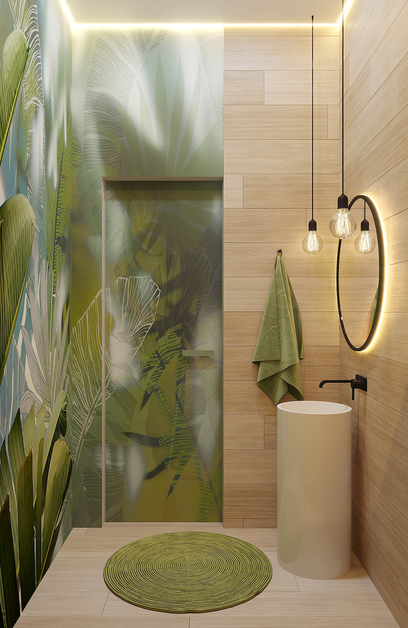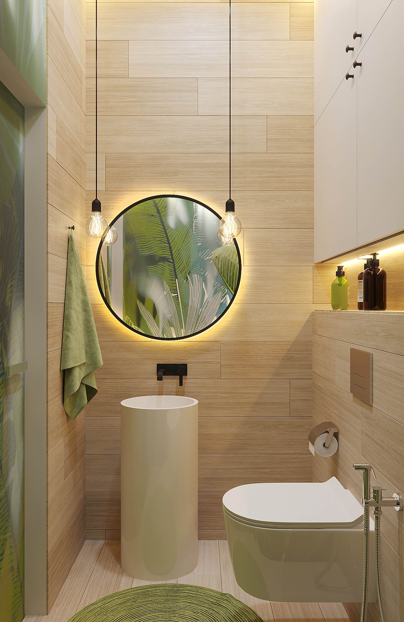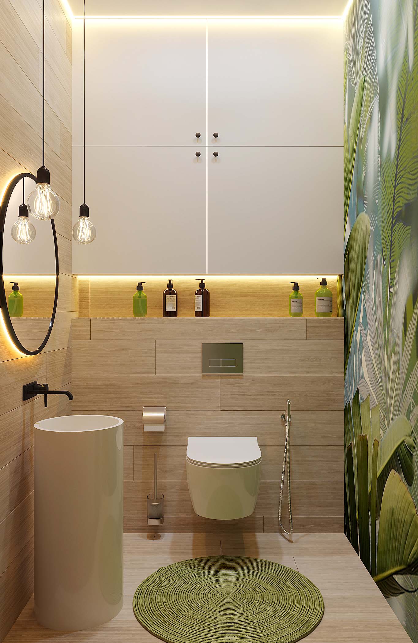Проект санузла в квартире общей площадью 90 квадратных метров. Квартира разрабатывалась для семьи с малышом. Требовалось заложить кухню-гостиную, детскую, спальную, кабинет, две гардеробных, ванную и санузел. Стиль — современный, лаконичный. В качестве акцентов выбраны пенополиуретановая рейка, стабилизированный мох, а также обои из коллекции «GREENDAY-21» в санузле.