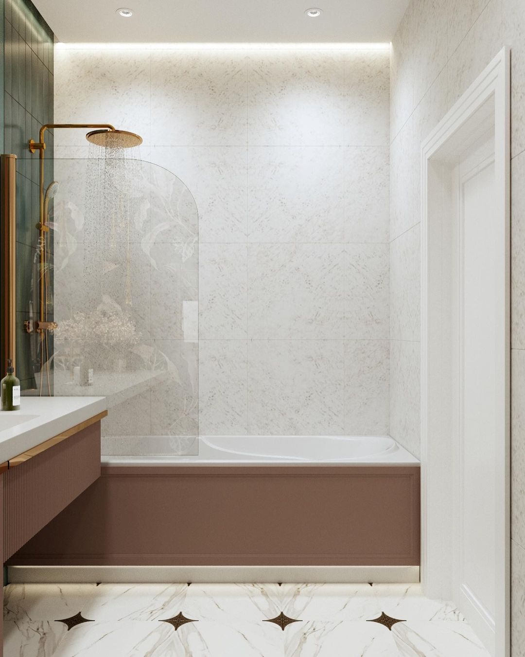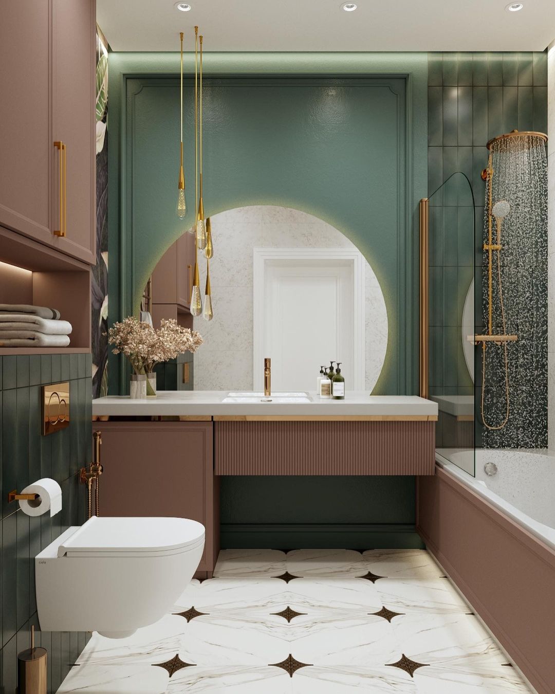 Ванная площадью 3,7 м². Хозяева хотели уютную и сочную ванную комнату, с изюминкой. Эту изюминку придала интерьеру фреска из коллекции «Selva».