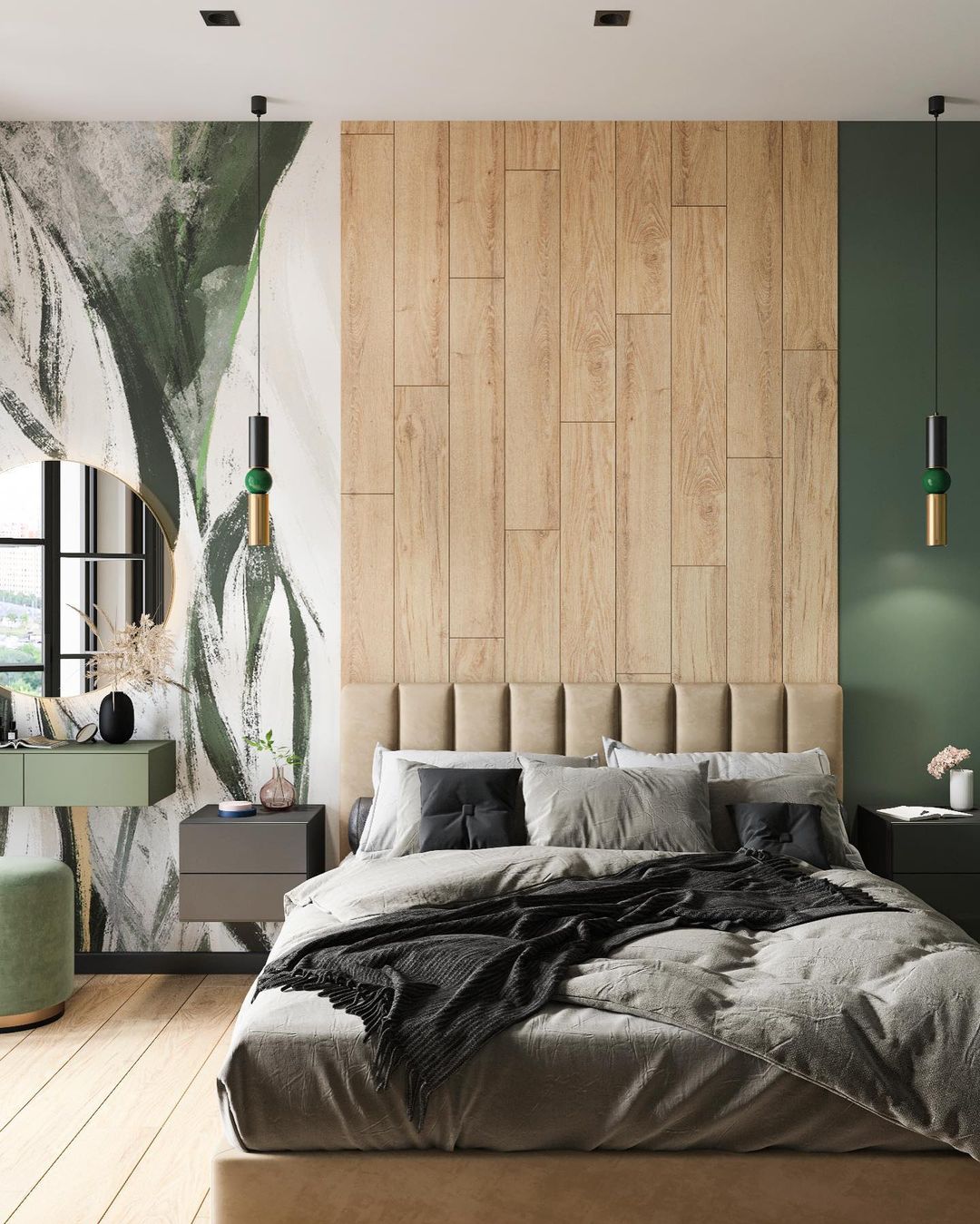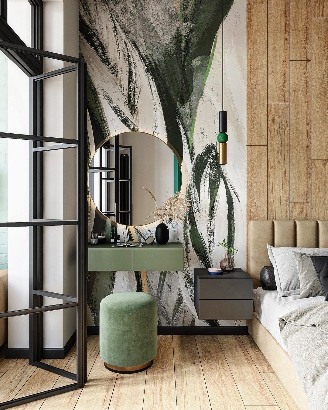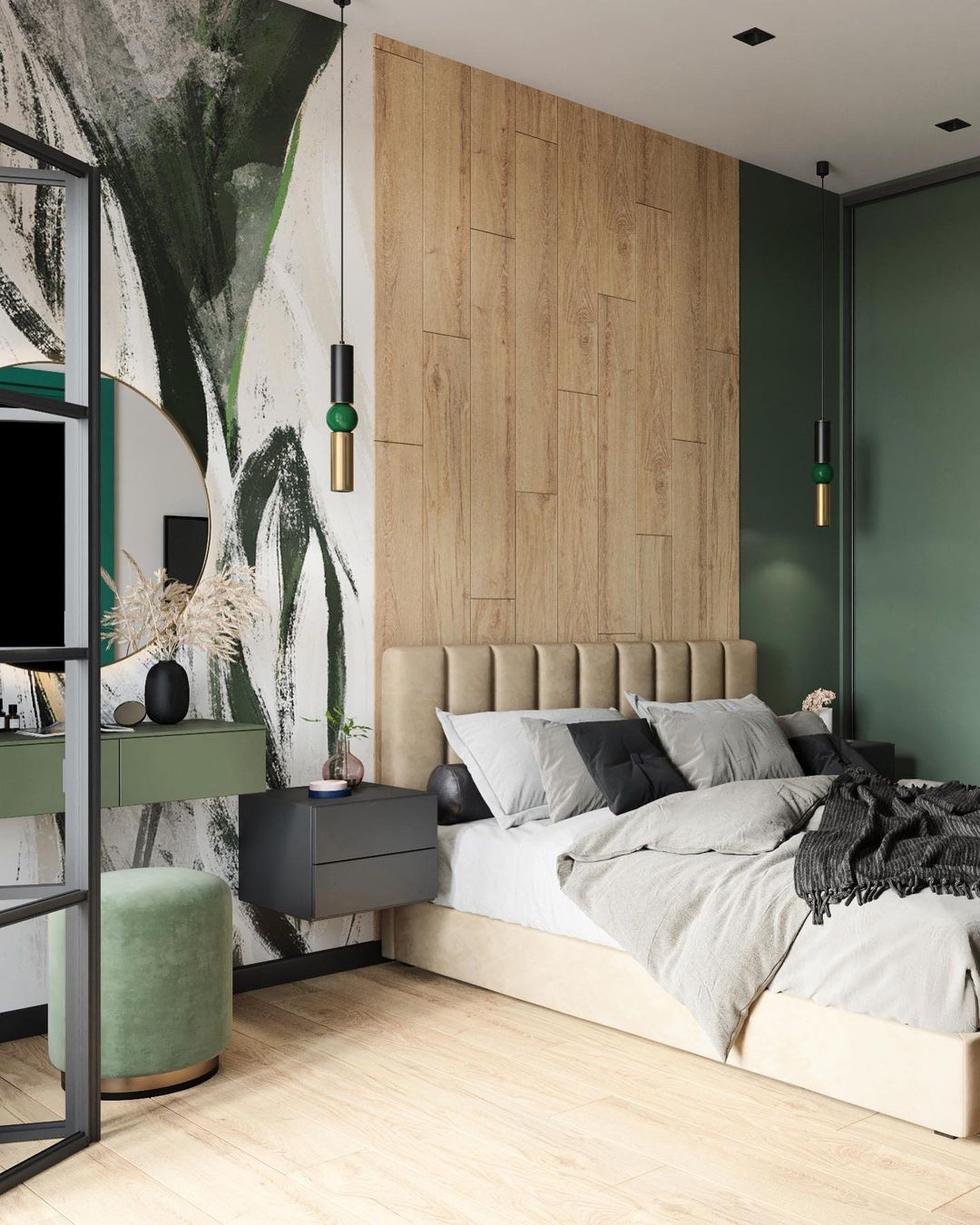 Стена за кроватью — самая видовая и поделена на функциональные зоны, за туалетным столиком расположены фотообои из коллекции «Alive», которые идеально подходят под цветовую гамму интерьера. За кроватью — вставка из кварцвинила того же цвета, что и на полу. Подвесные светильники в изумрудном цвете с золотом, расположенные над прикроватными тумбочками, могут подойти как в скандинавский стиль, так и в классику.