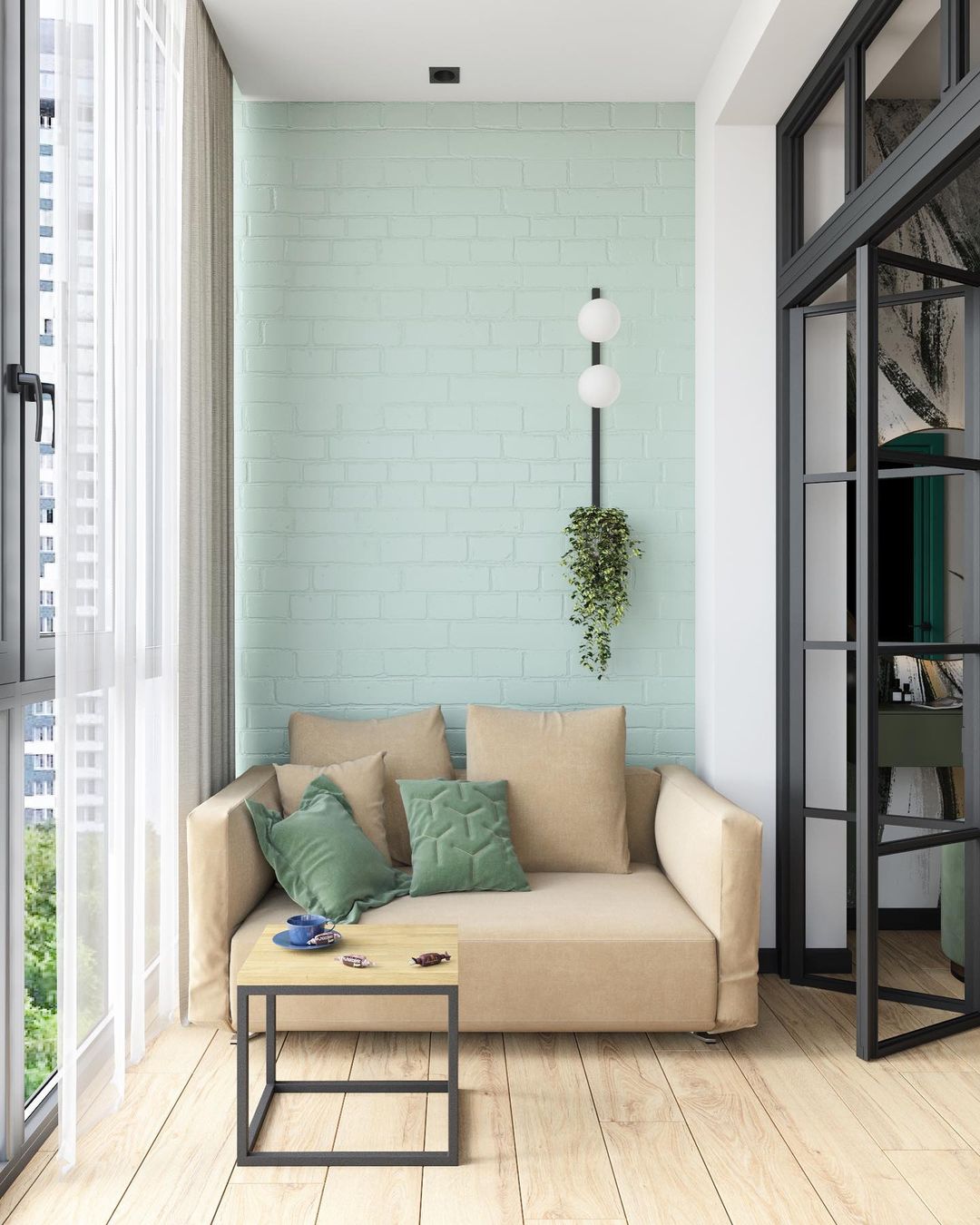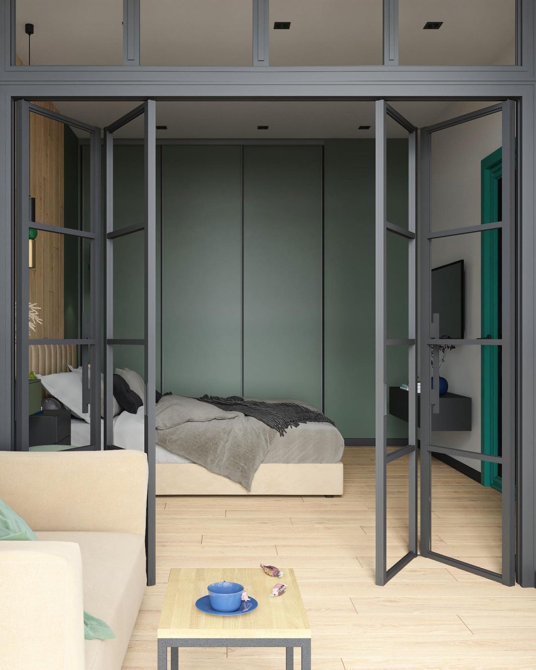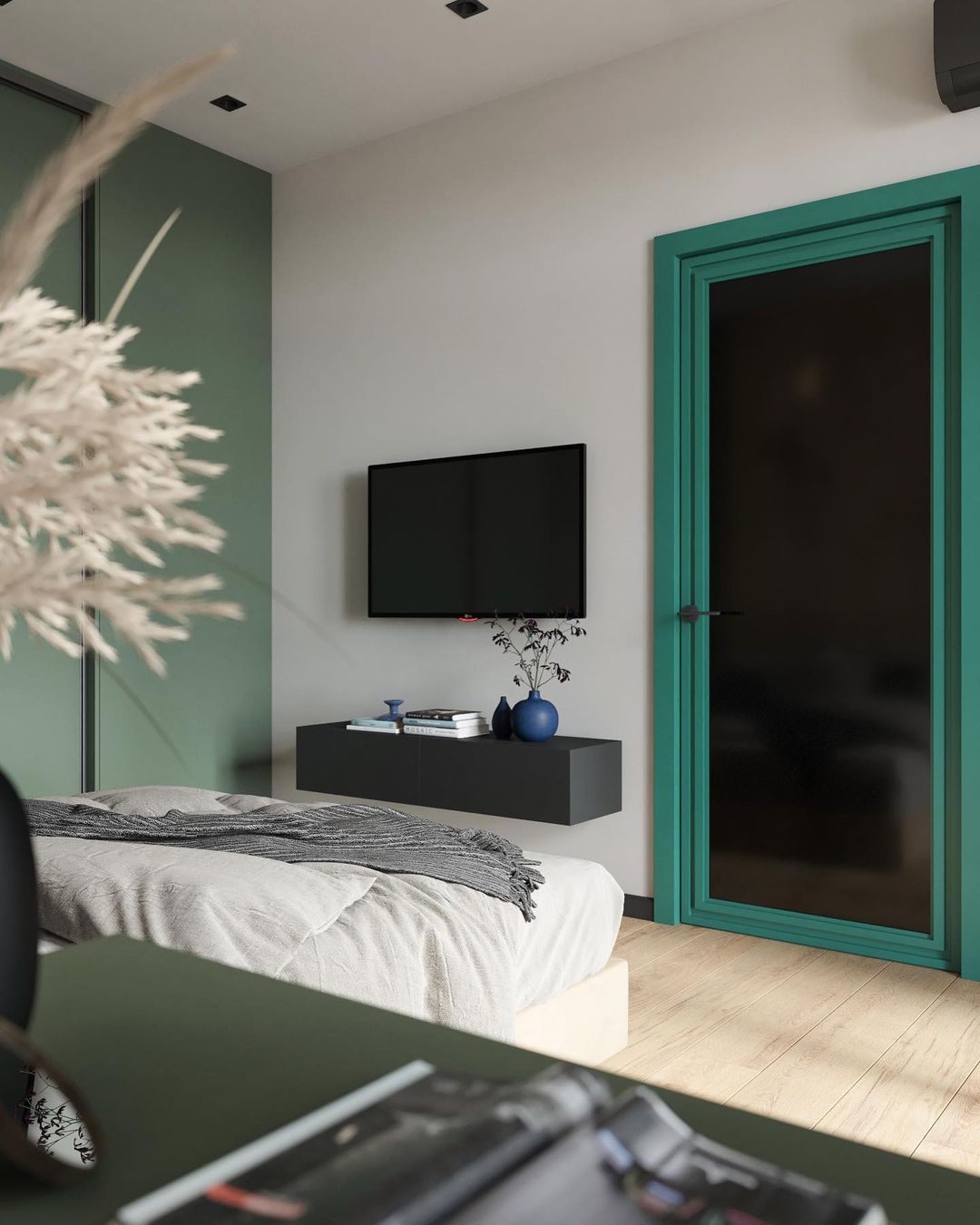 Стена за кроватью — самая видовая и поделена на функциональные зоны, за туалетным столиком расположены фотообои из коллекции «Alive», которые идеально подходят под цветовую гамму интерьера. За кроватью — вставка из кварцвинила того же цвета, что и на полу. Подвесные светильники в изумрудном цвете с золотом, расположенные над прикроватными тумбочками, могут подойти как в скандинавский стиль, так и в классику.