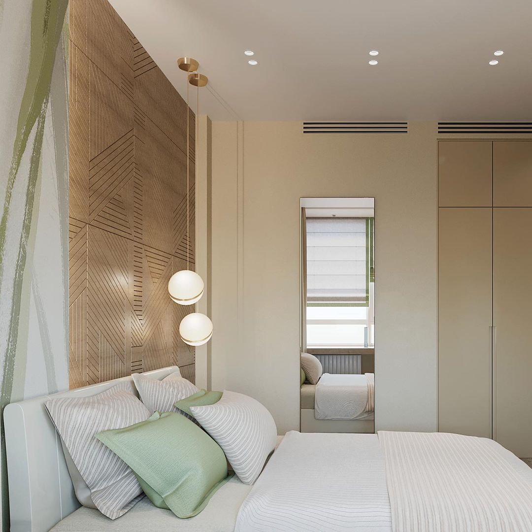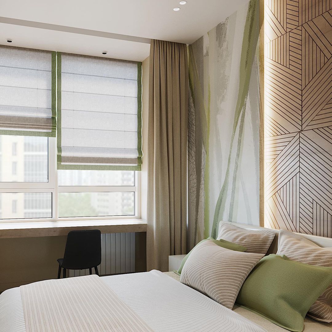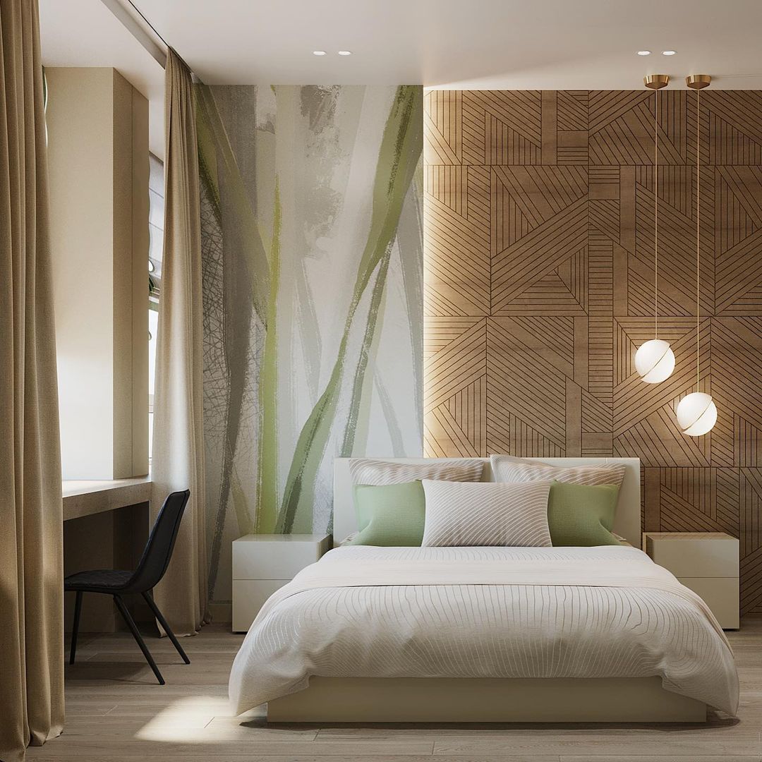 Это проект спальни в г. Москва, для молодой пары. Пожеланиями хозяев были: натуральные материалы, цвета, спокойные оттенки, расслабляющая атмосфера. Дизайнер этого проекта Юлия использовала для этого 3д панели, текстиль, а также необычные обои из коллекции «Alive».