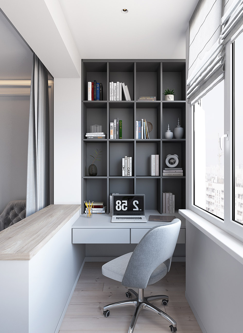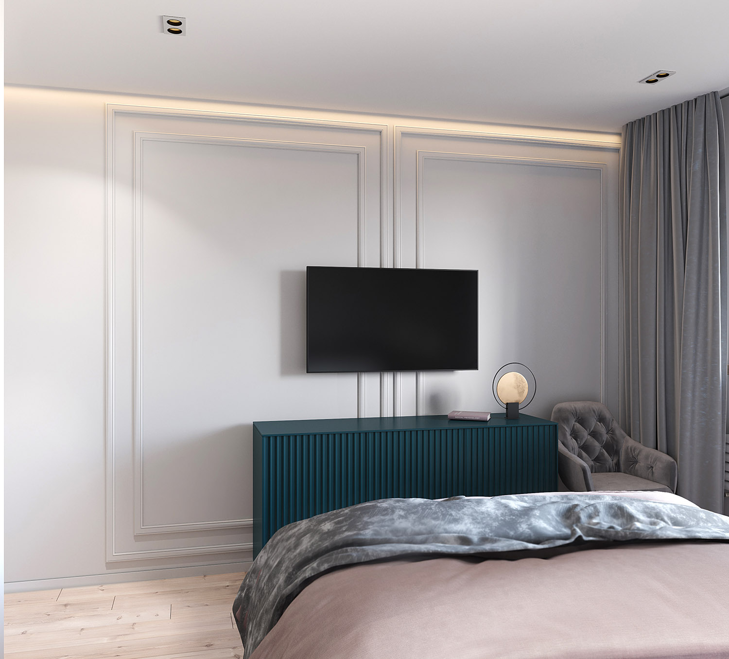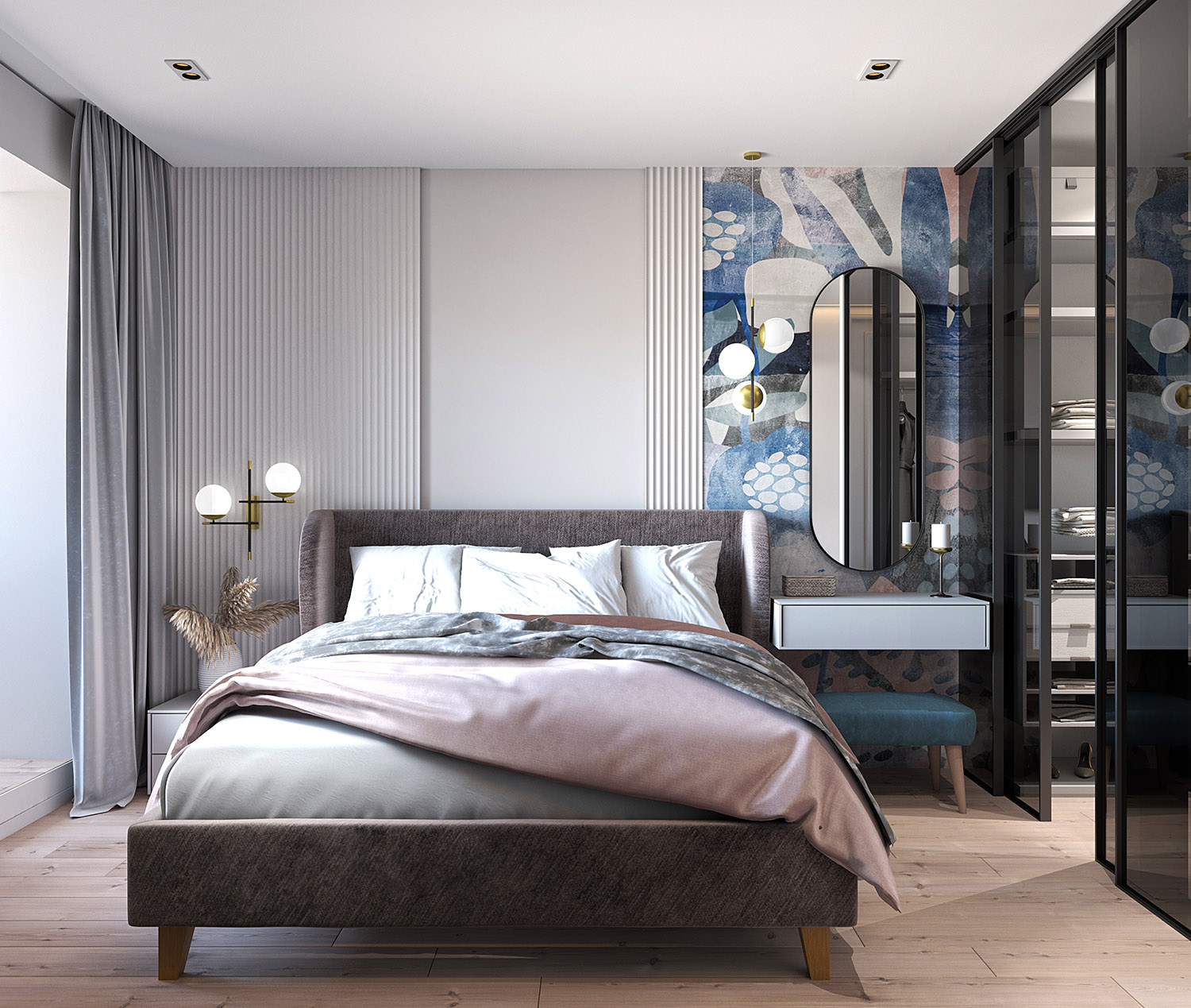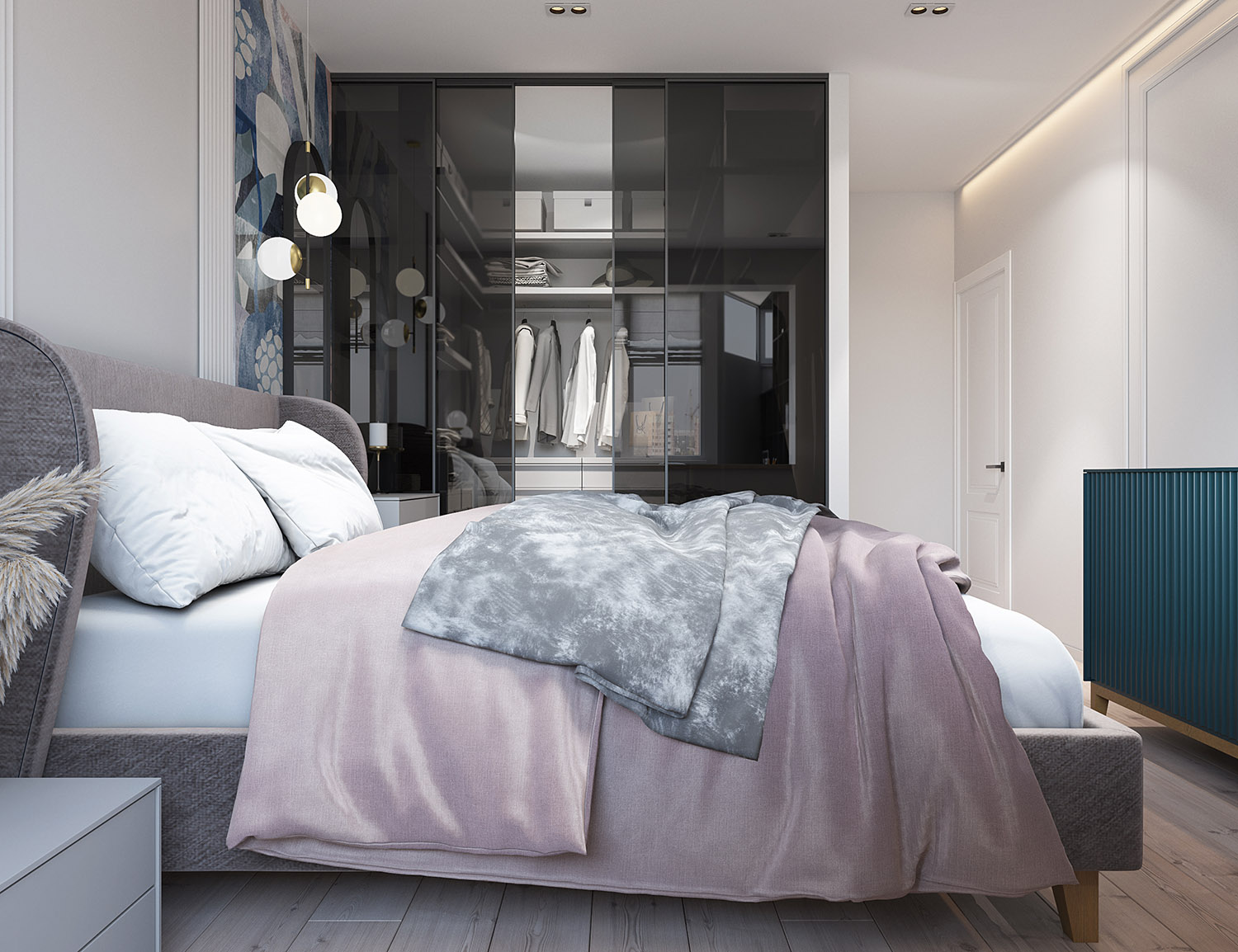 Квартира в Новопеределкино в панельном доме, для молодой семьи. Изначально комната была 18,7 м² с выходом на балкон. Уменьшили площадь спальни в пользу гардеробной, получилось 14,7 м² плюс 4 м² гардероб. Балконный блок убрали — теперь там полноценная рабочая зона. Пожеланием заказчиков было сделать светлую современную квартиру с яркими деталями.