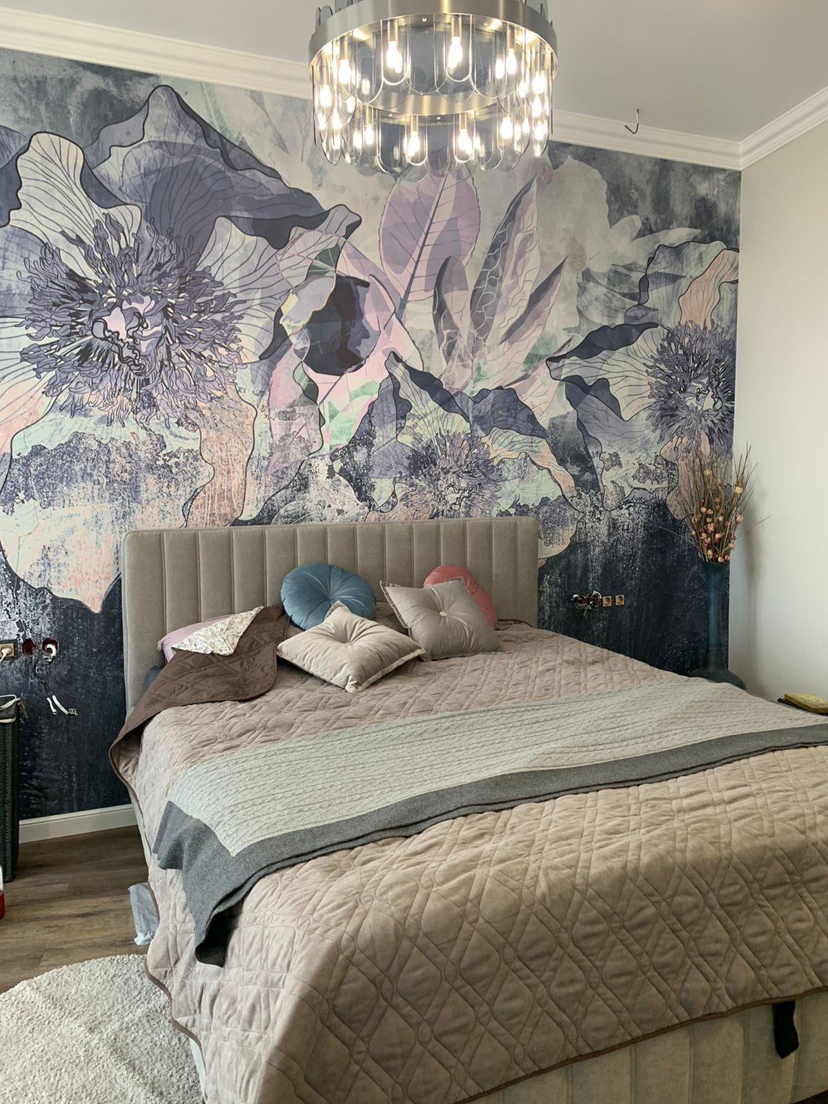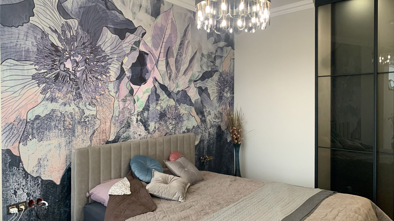 Заказчик проекта не первый раз выбирает у нас обои: в одной из комнат уже есть коллекция «Astral». Сейчас выбор упал на растительные изображения «Alive». Материал предложили Фрост — он легко сочетается с любой отделкой в интерьере и абсолютно экологичен.
