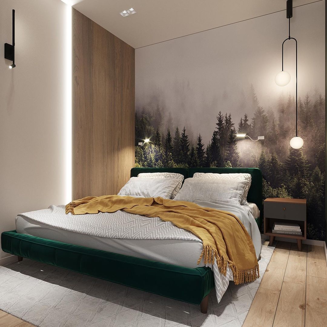 «Для спальни был выбран принт с лесом из коллекции «Frame-2019», подчёркивающий отсылку к природе и экологичности. Шпонированное панно у изголовья кровати придаёт интерьеру уютную атмосферу».