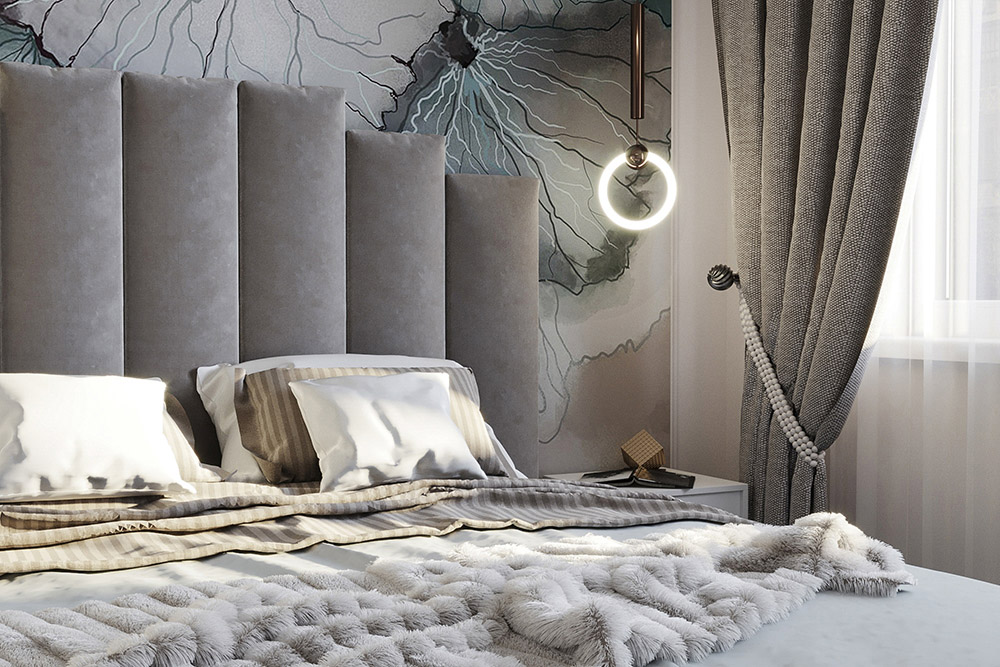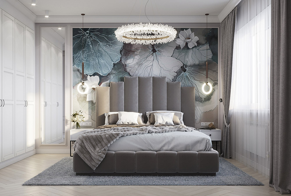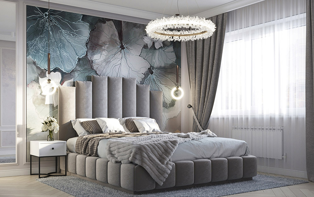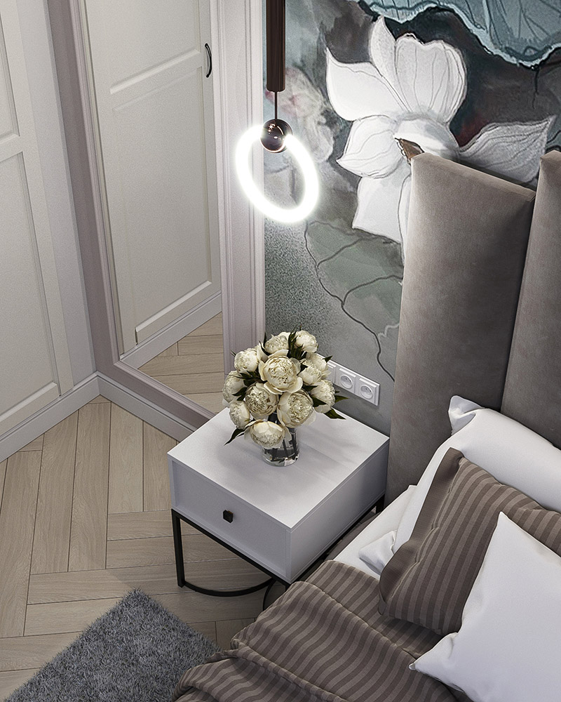 Спальня площадью 15 м² выполнена в классическом стиле. Очень хотелось создать теплую и уютную атмосферу, но со своей изюминкой. Основная палитра — это нейтральные серо-бежевые оттенки. В качестве главного акцента выбраны бесшовные обои «La Prima».