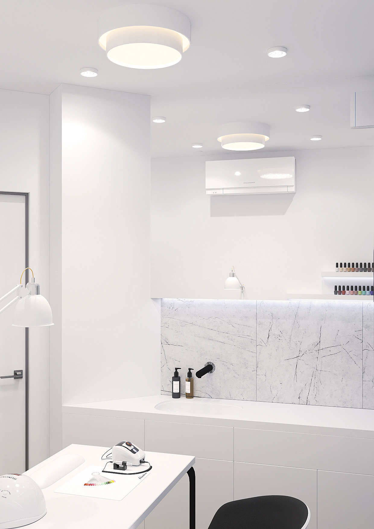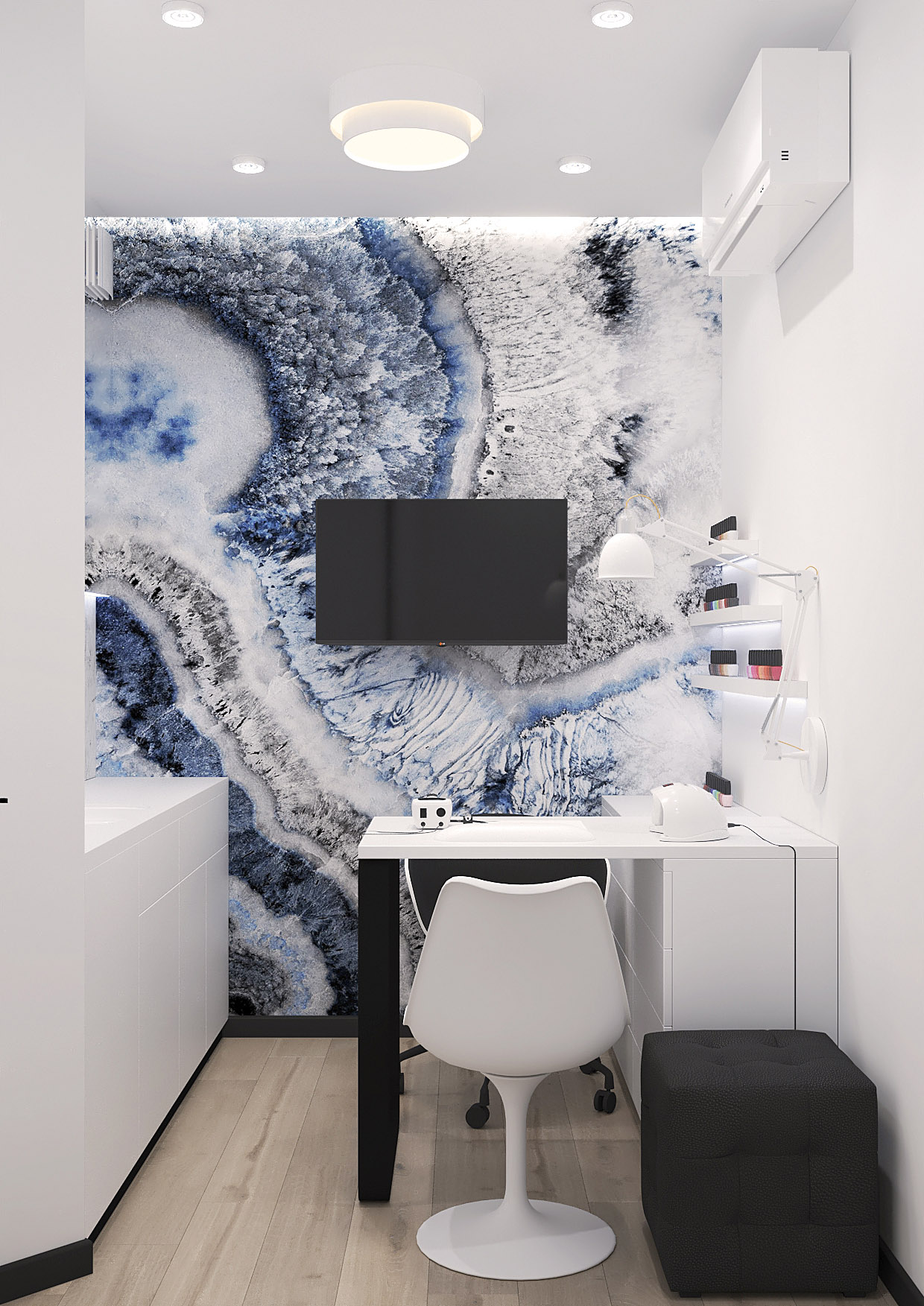 Интерьер маникюрного кабинета в квартире молодой семьи. Общая площадь квартиры 100 квадратных метров, расположена в городе Ростов-на-Дону. Изначально в планировке было предусмотрено два санузла, один из которых площадью 5,7 м² дизайнер Екатерина @kalashnikova.designer трансформировала в рабочий кабинет.