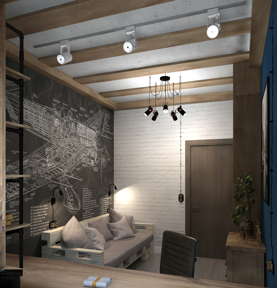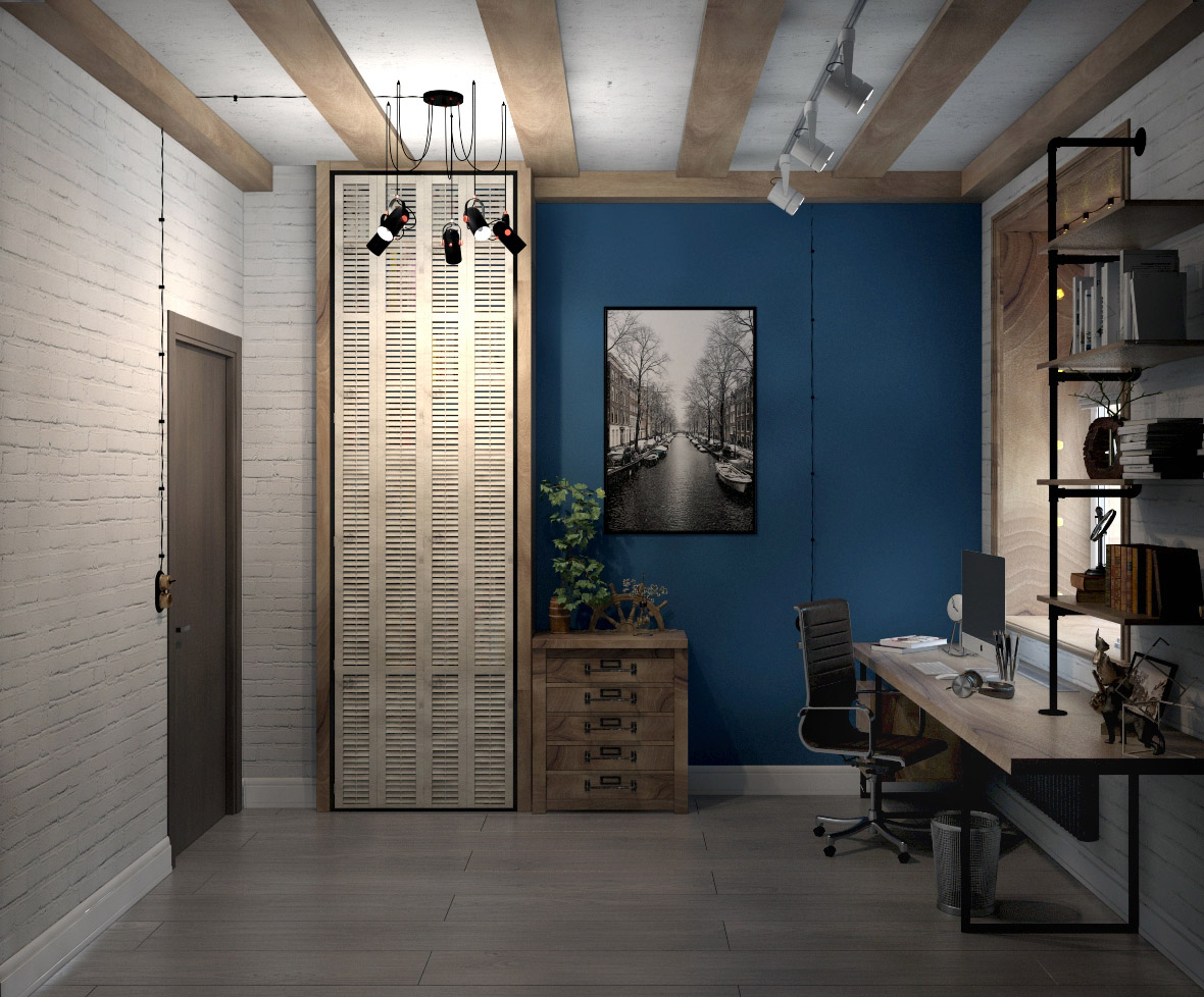 Кабинет в частном доме в Подмосковье для главы семейства. Заказчику нравится стиль лофт. В результате всё внутреннее пространство дома было выполнено в этом стиле, в том числе и кабинет. На данном этапе объект практически реализован.