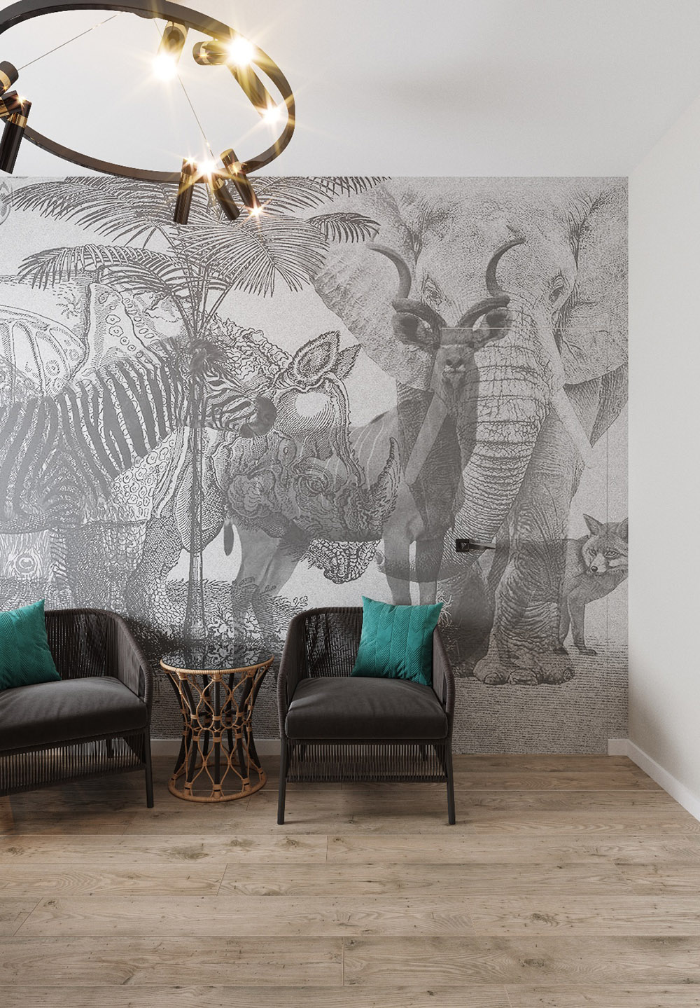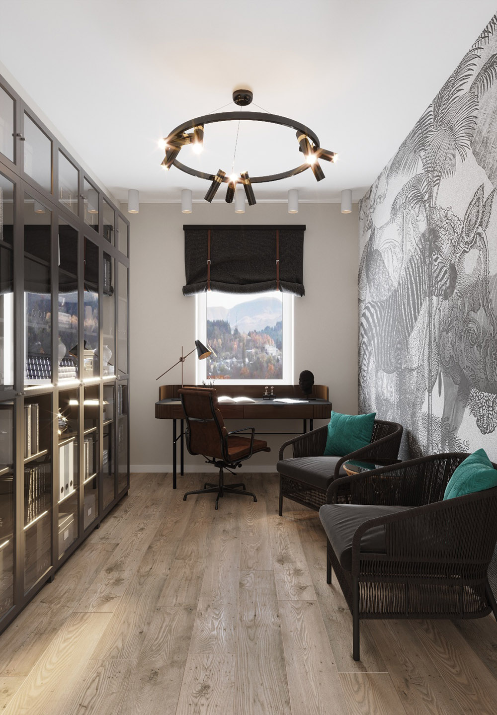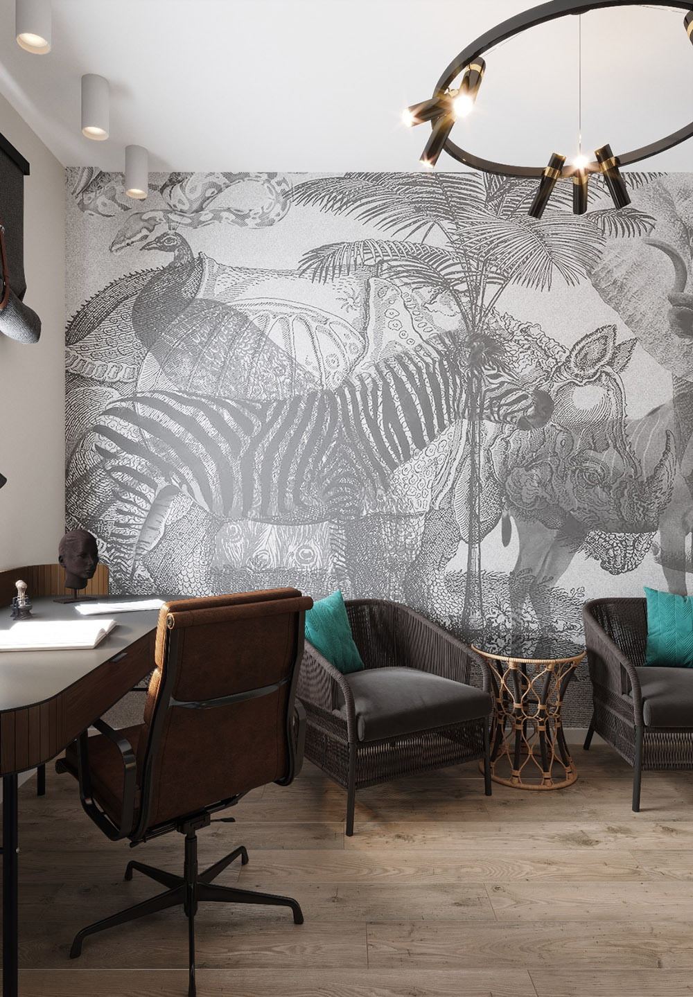 В данном проекте выбрана фреска с дикой природой из коллекции «Zenith» не просто так. Заказчик любит экзотических животных и много путешествует, эта коллекция понравилась ему сразу же. Кабинет небольшого размера, но благодаря лёгкому принту интерьер смотрится очень стильно.
