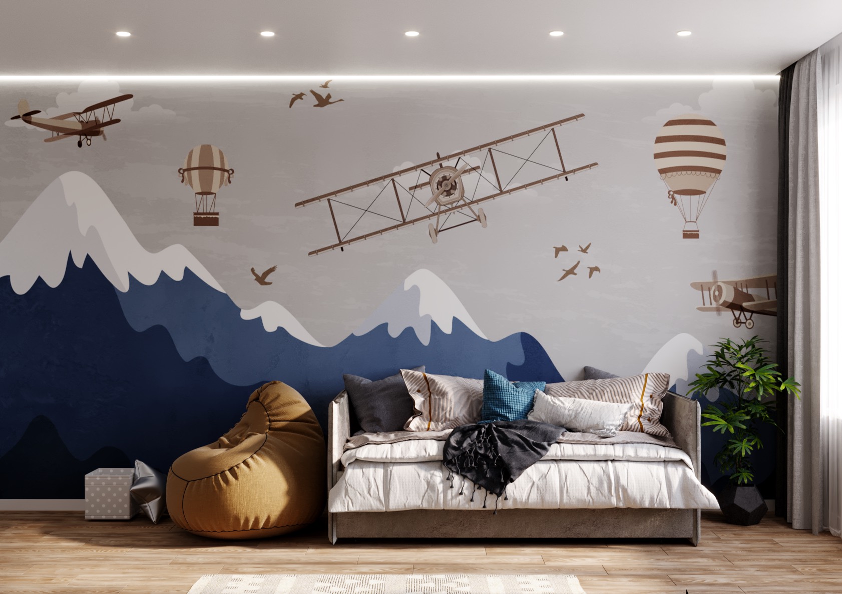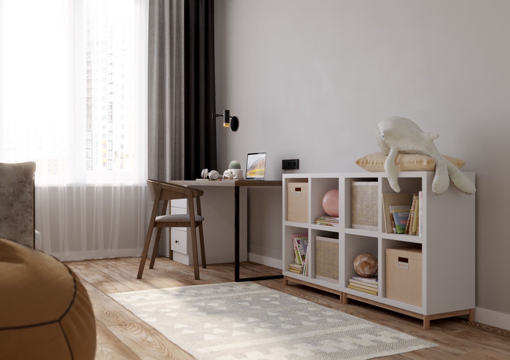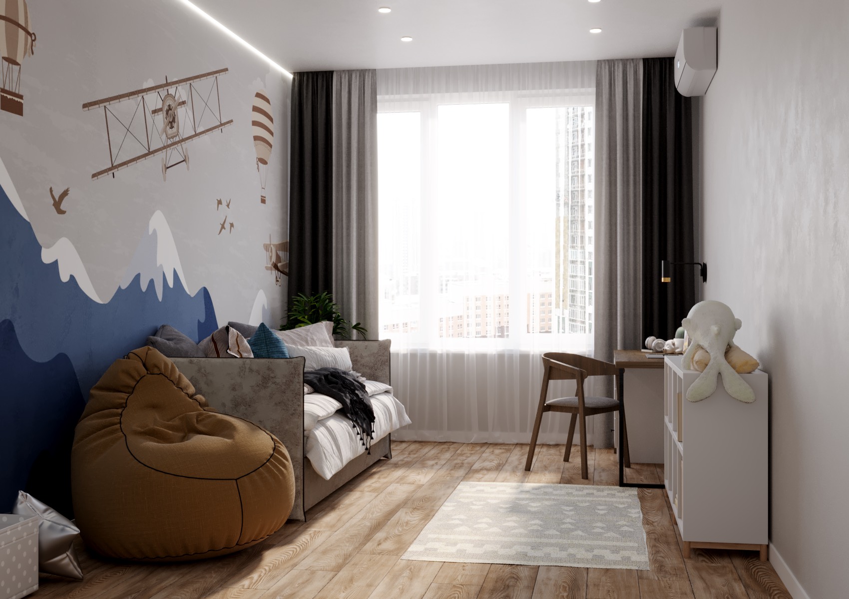 Детская 18,3 м² из проекта квартиры на ул. Некрасова, г. Новосибирск. Детская проектировалась для мальчика, в будущем школьника, с пространством для игр. Ярким акцентом послужила стена, оформленная фреской из детской коллекции «Big Little».