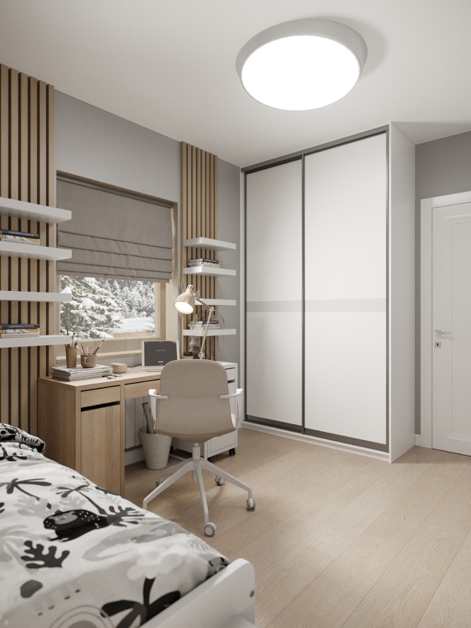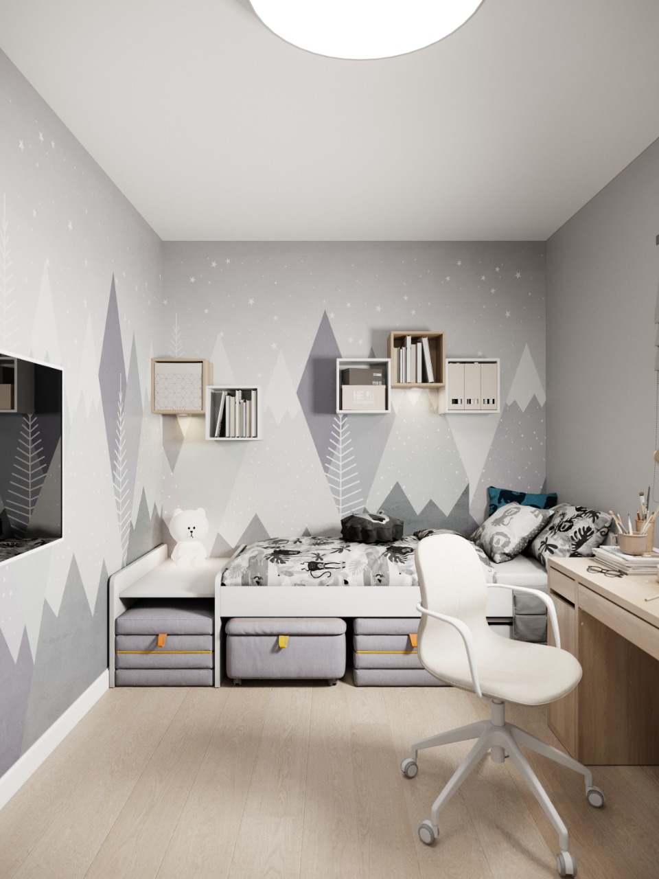 Вот такая комната для будущего первоклассника у нас получилась. Учебную зону сделали рядом с окном: естественное освещение не напрягает глаза, а вид неба и деревьев снимет эмоциональное напряжение. В проекте использовались обои из коллекции «Big Little».