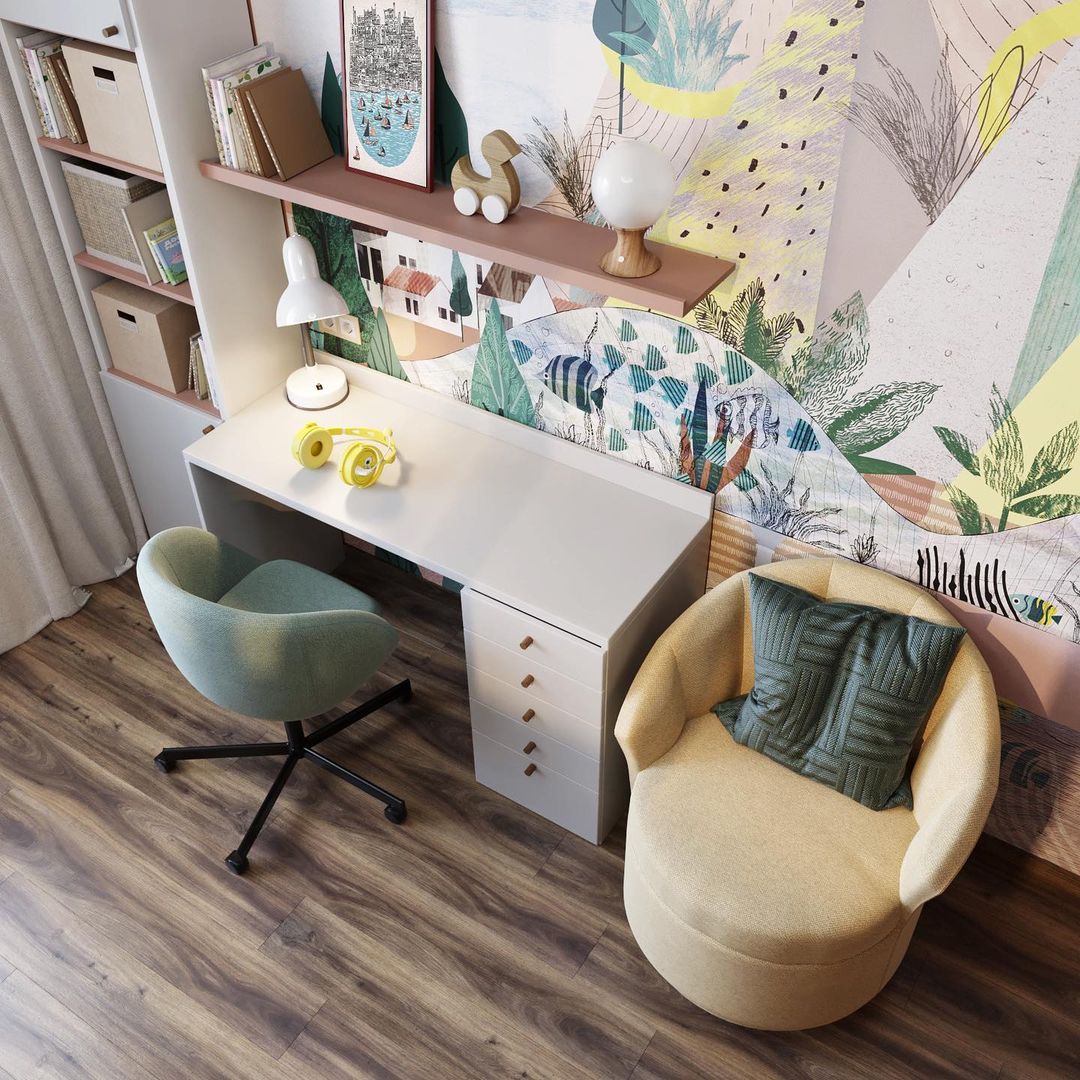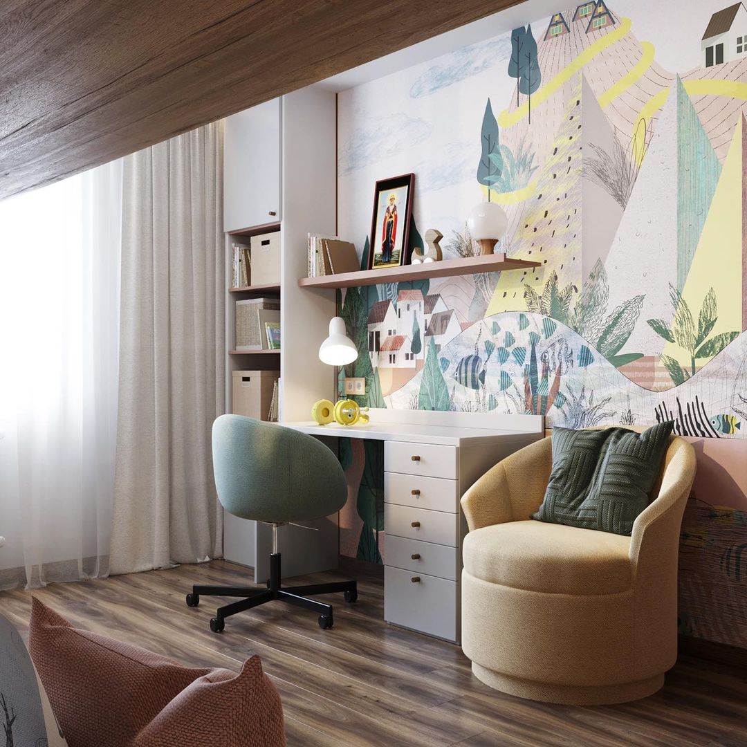 Это проект детской комнаты площадью 16 м² в г. Тюмень для девочки 9 лет. Задачей было создать уютное пространство, в котором можно играть, учиться, а также весело проводить время и даже оставить подружку с ночёвкой. В проекте использовались обои из коллекции «City Garden».