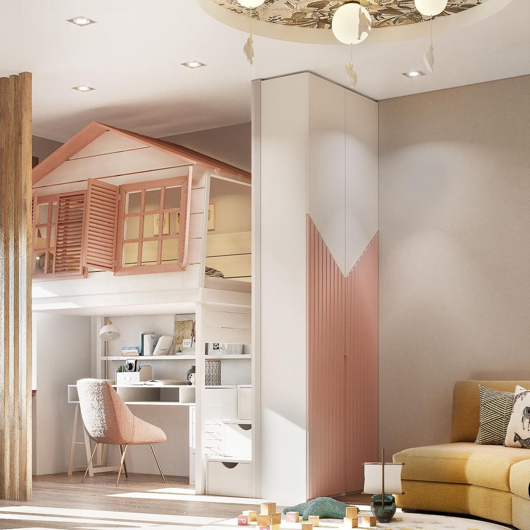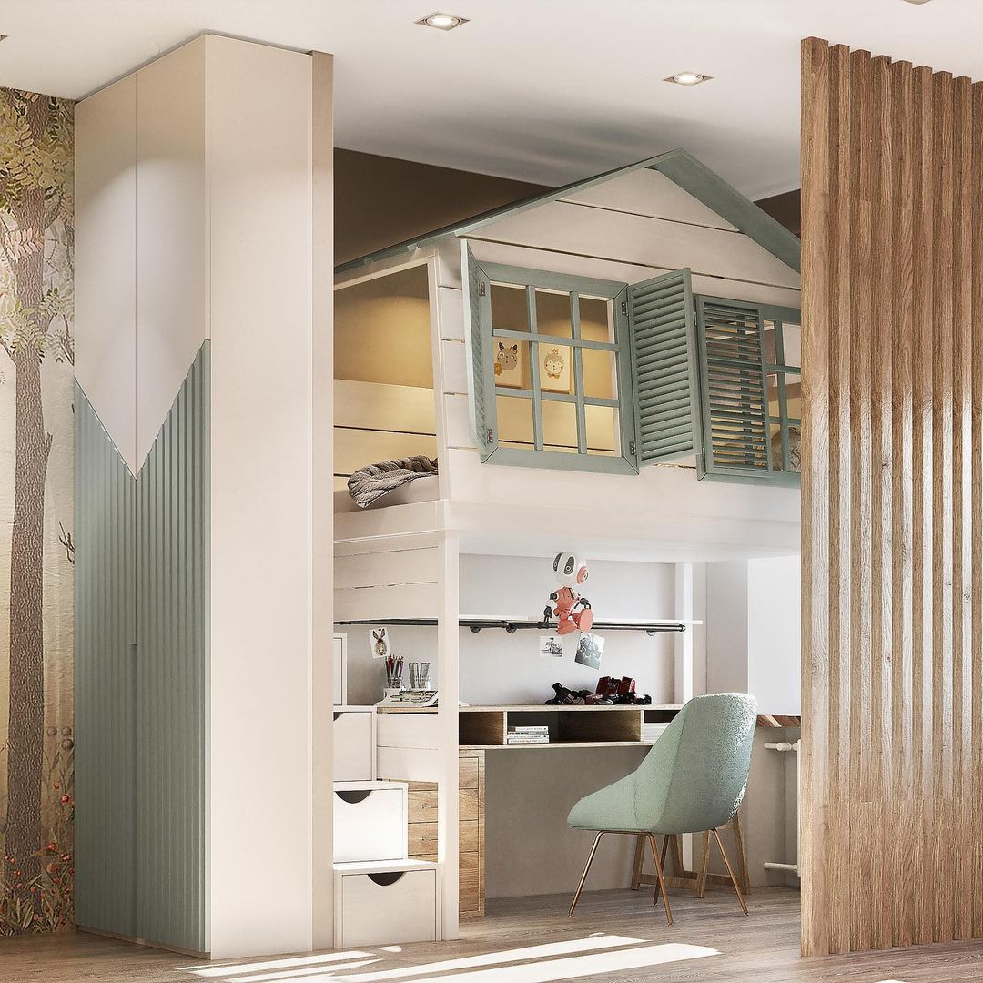«Это детская комната для маленьких брата и сестры в квартире старого фонда в Санкт-Петербурге, — рассказывает дизайнер этого проекта Анна, — Нужно было предусмотреть как личные рабочие места, так и общую игровую зону».