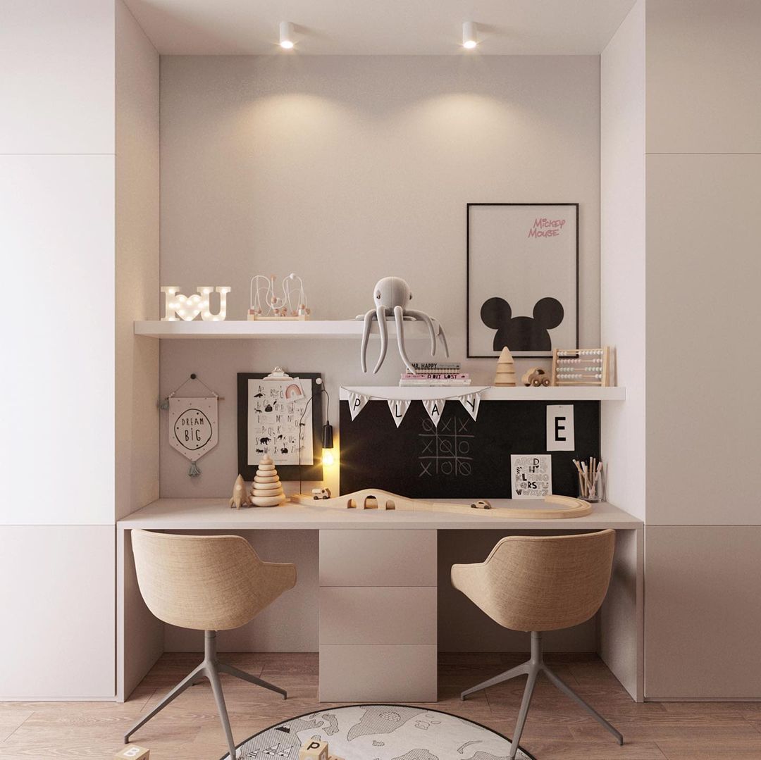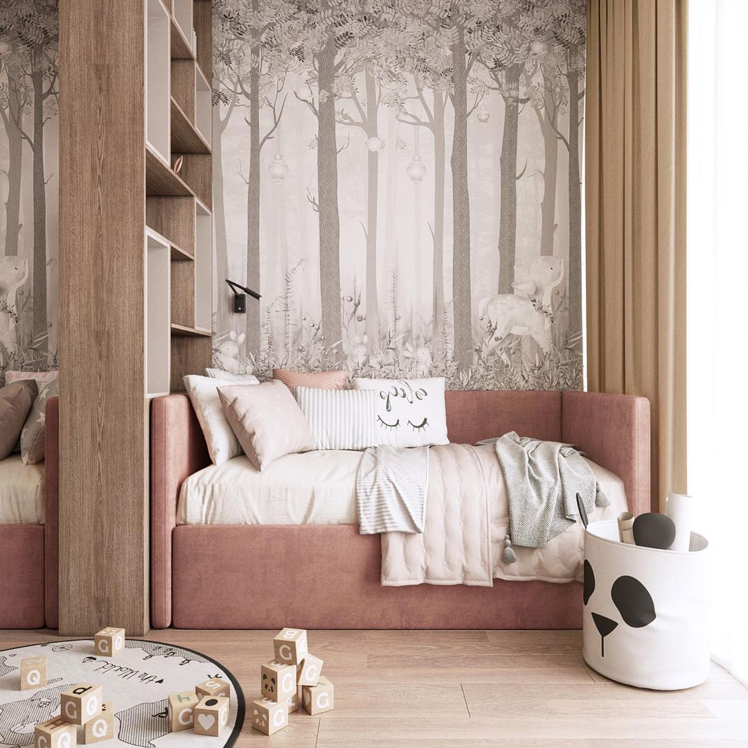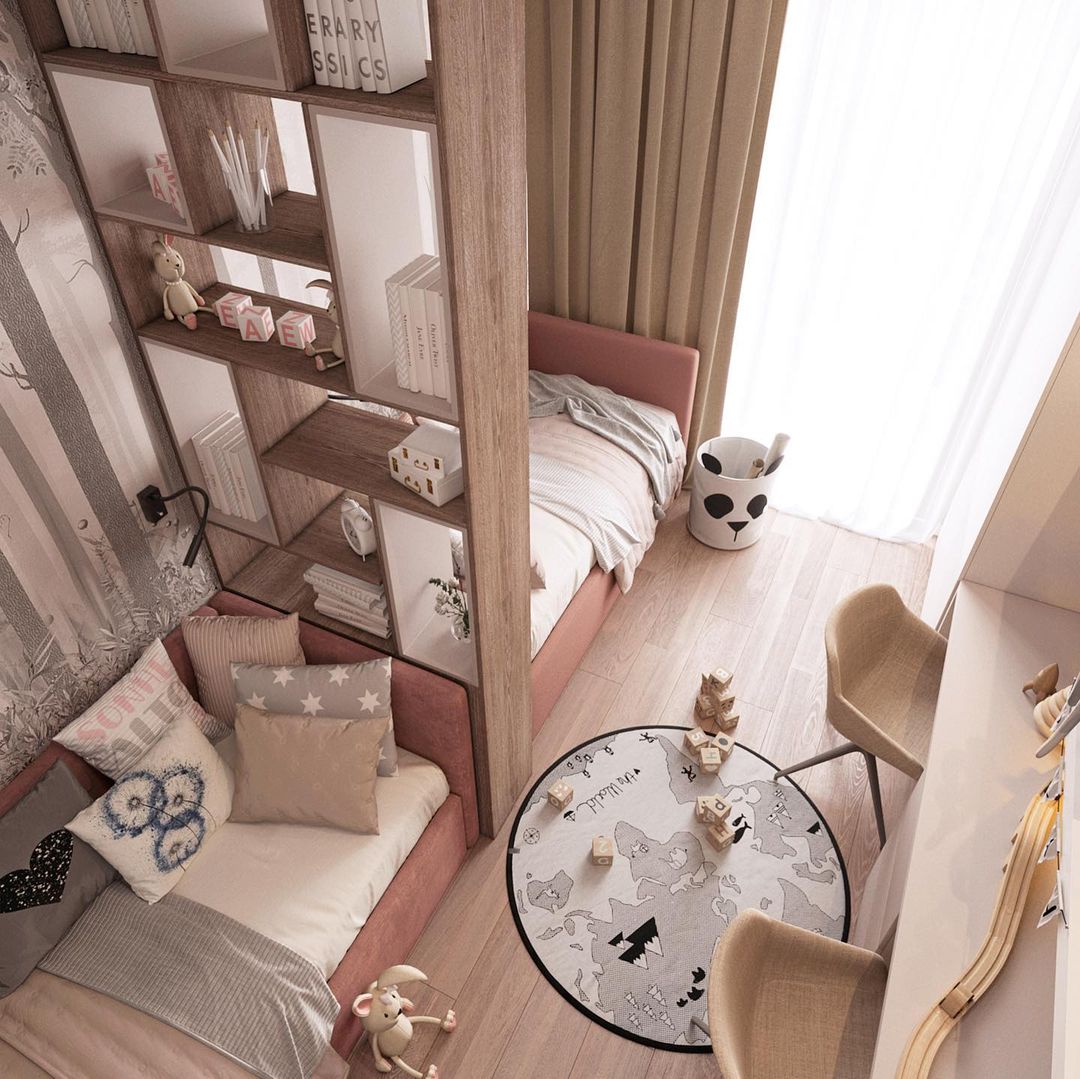 Комната 14 квадратных метров для двух девочек из проекта в г. Всеволожск. Основным пожеланием было: разместить полноразмерные кровати, общий стол для игр и учёбы девочек. И главное пожелание — чтобы наполнение комнаты было максимально одинаковым и не возникало споров по этому поводу)
