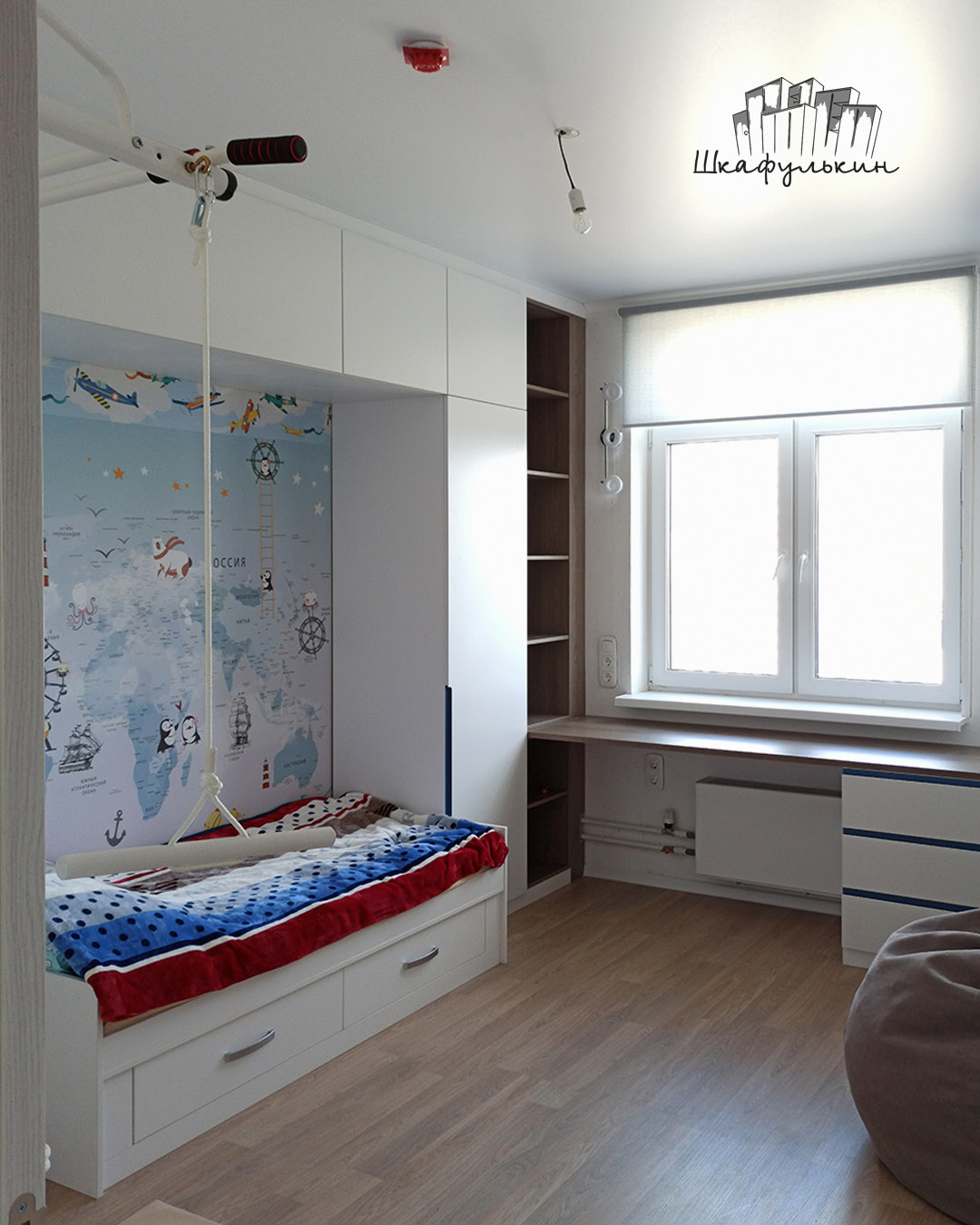 Это проект детской комнаты с обоями из коллекции «Funny Tour». Всем детям хочется иметь свой волшебный мир, где удивительные и забавные существа оживали бы прямо на стенах. Детская коллекция «Funny Tour» отправляет юных мечтателей навстречу ярким приключениям в компании сказочных героев.