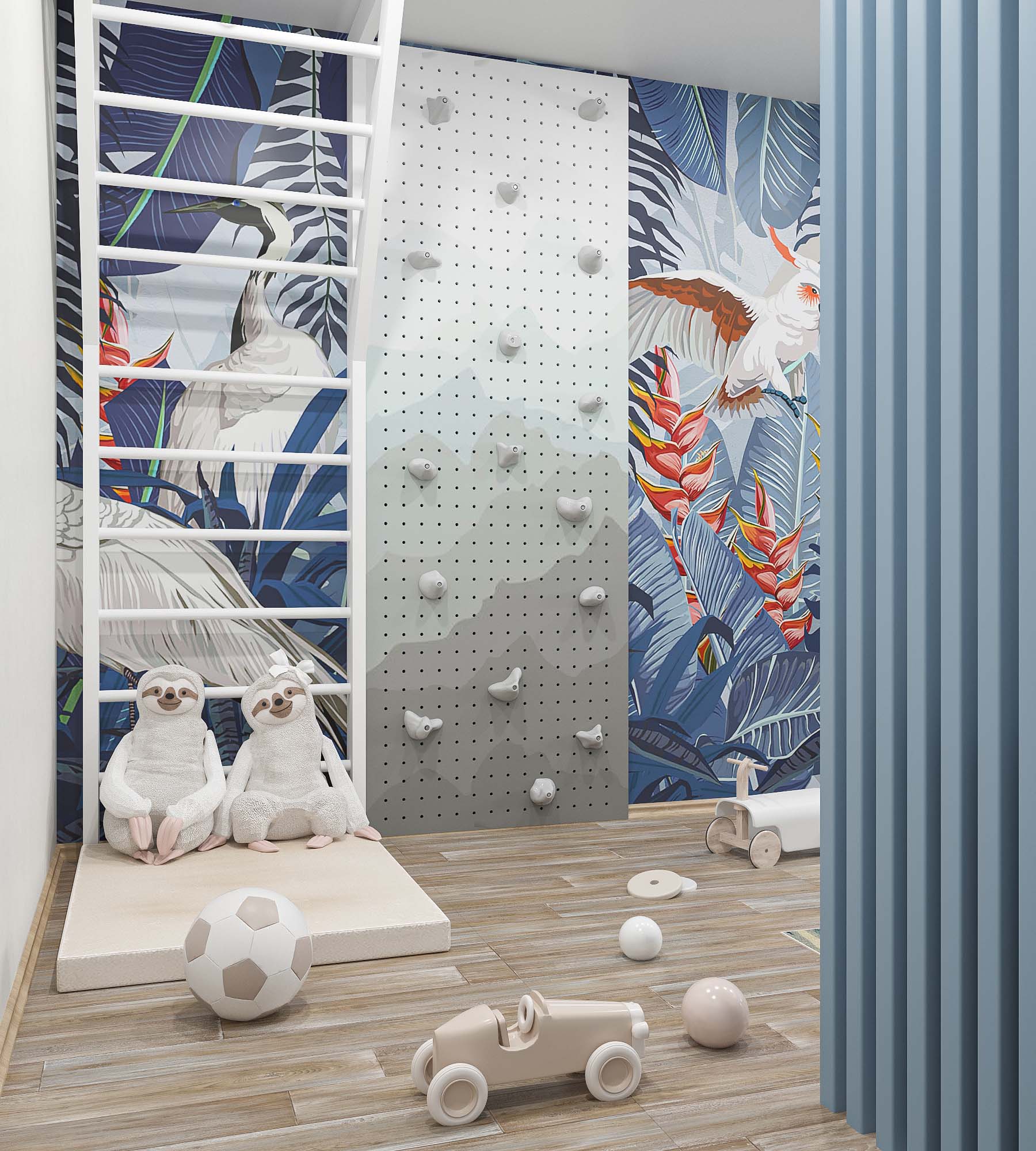 Детская для мальчика с большой игровой зоной: шведская стенка и скалодром! Из пожеланий — голубой цвет, отсылки к провансу в кухне-гостиной и много игрового места в детской. Обои для детской выбрали из коллекции Green Tropez.