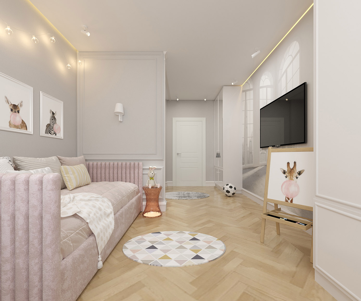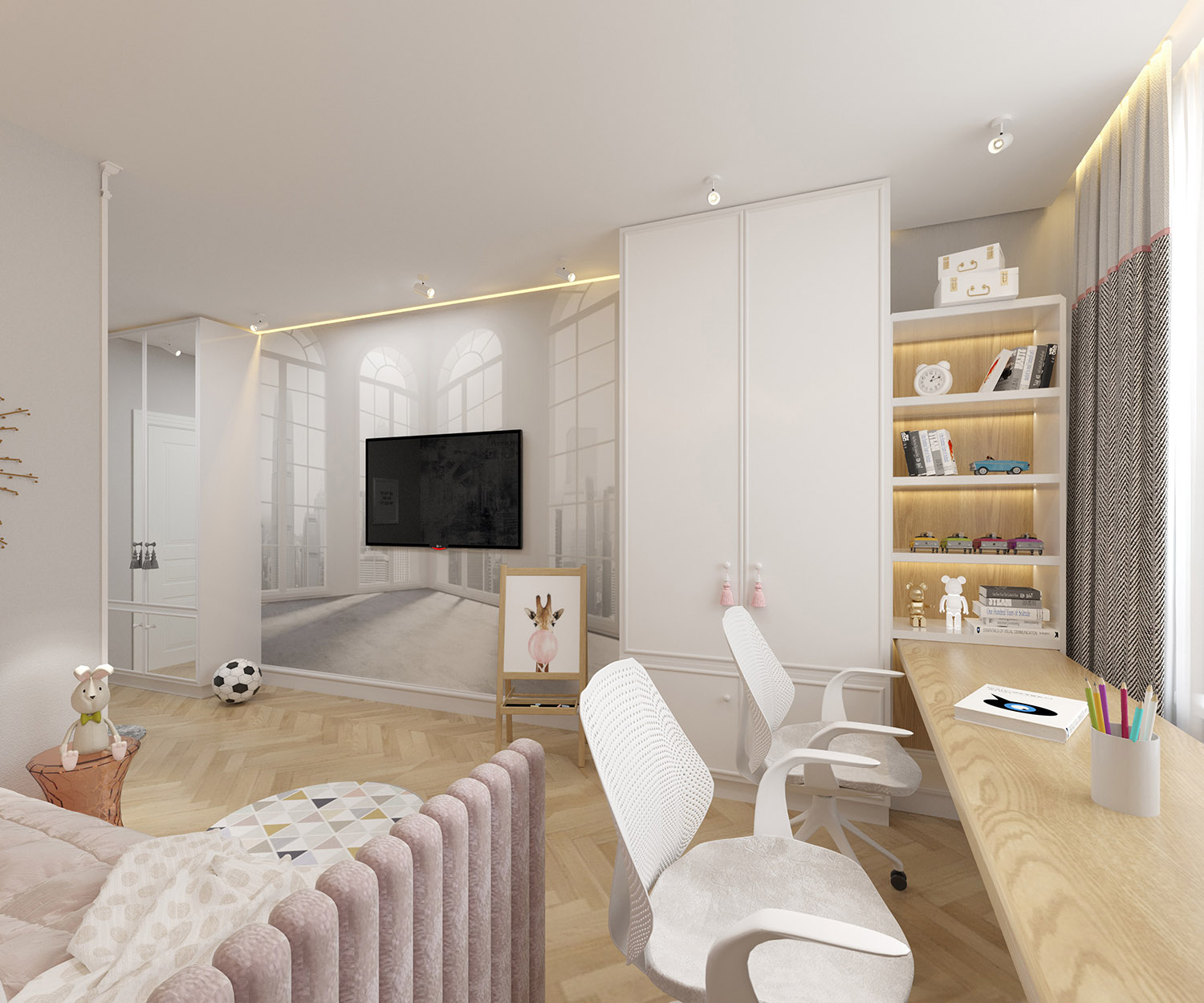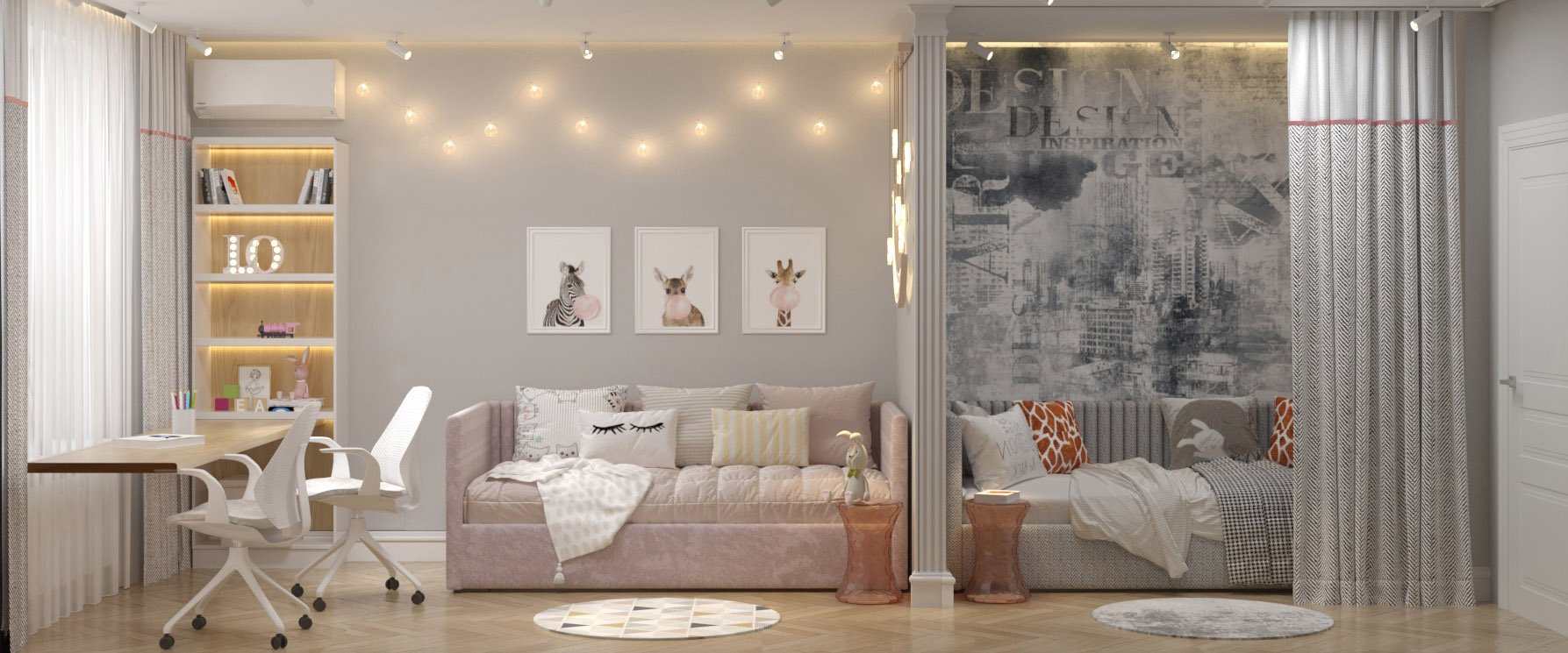 Это детская с фреской «Grunge», из проекта «Белые росы» в г. Краснодар. Комната для двух разнополых деток: мальчика 10 лет и девочки 3 лет. Площадь 20 м². Единственным пожеланием заказчика было «разграничить и в то же время объединить».