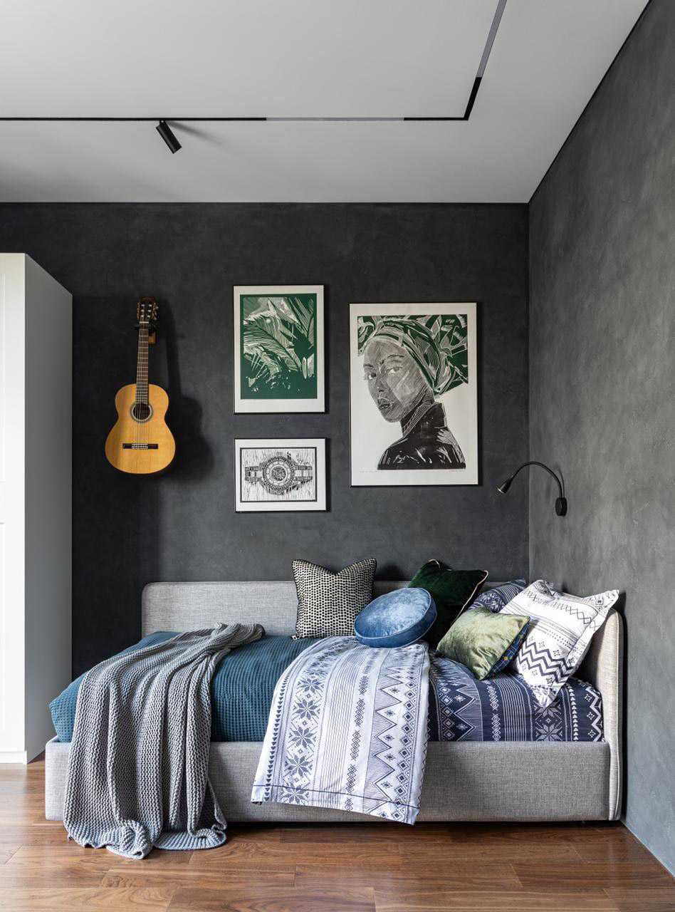 Оксана решила это вопрос светлой мебелью и текстилем, а необходимую «мрачность» комнате придали темные стены.
