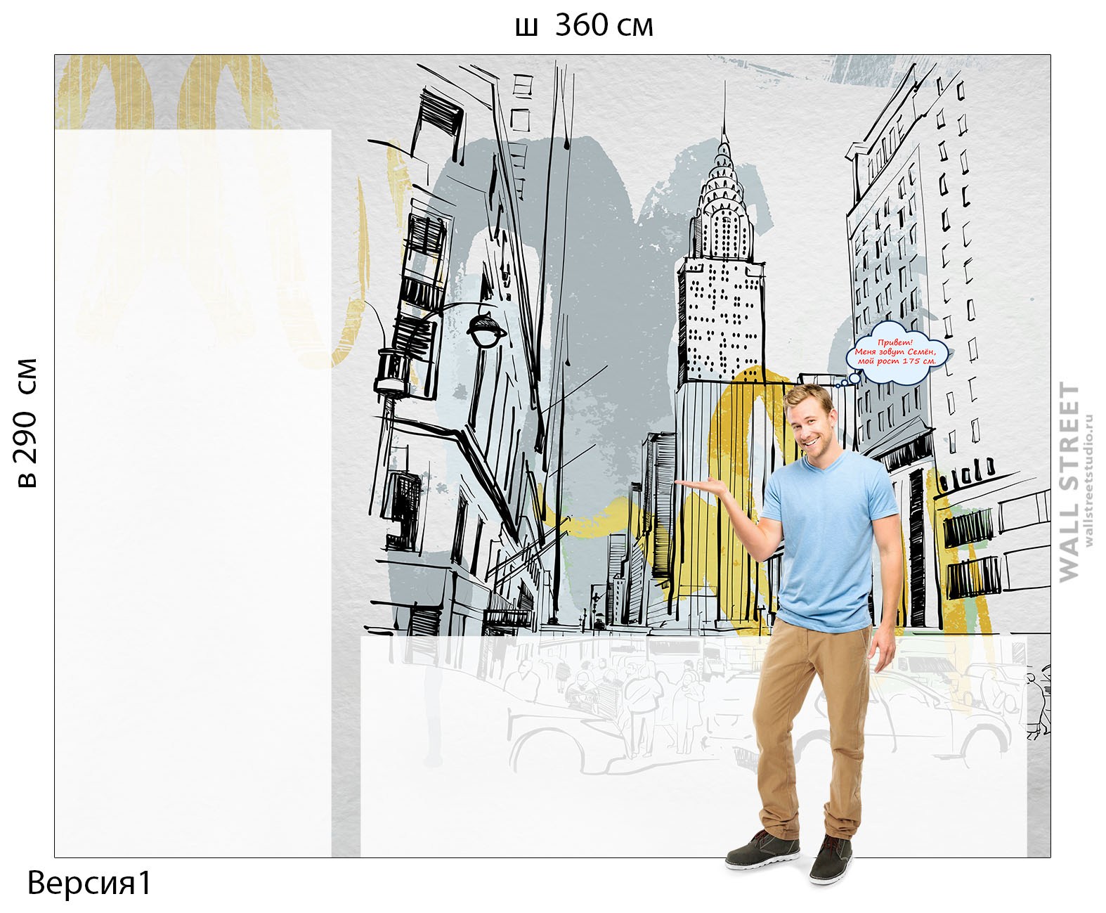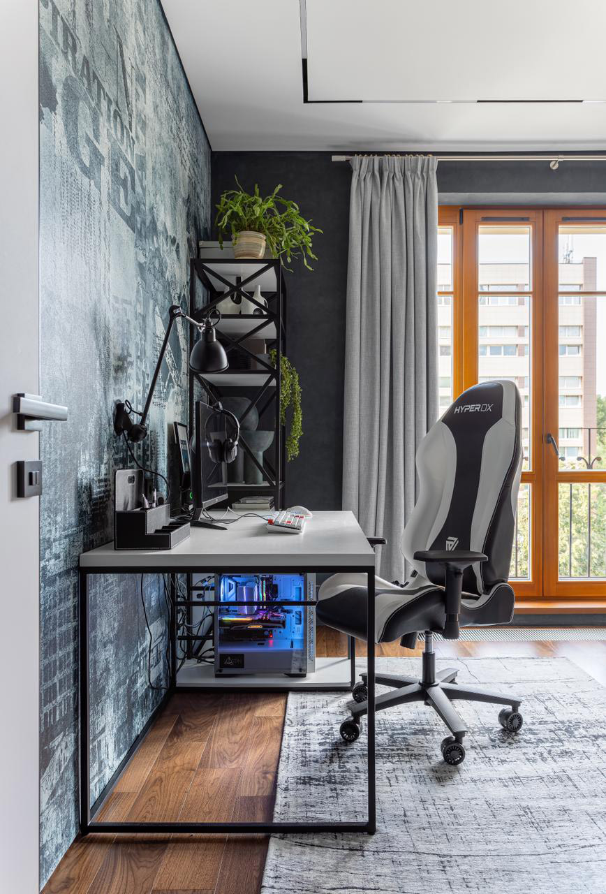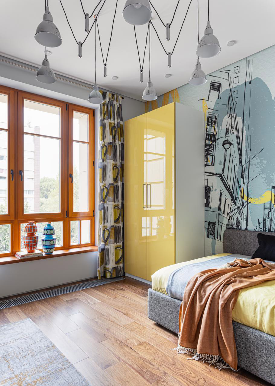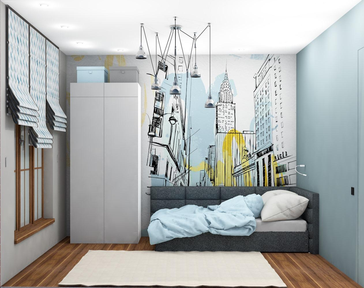 Эта комната полностью передает атмосферу большого города: контуры многоэтажных зданий, серые и мокрые оттенки, свободное пространство.