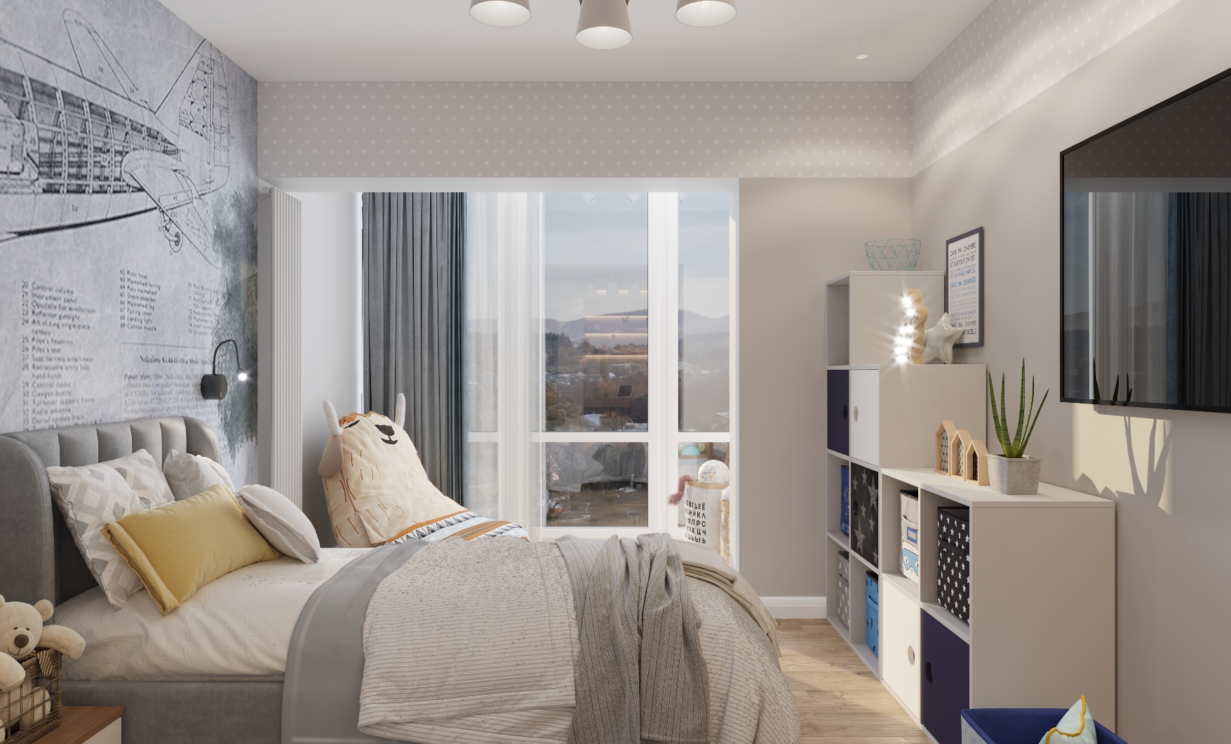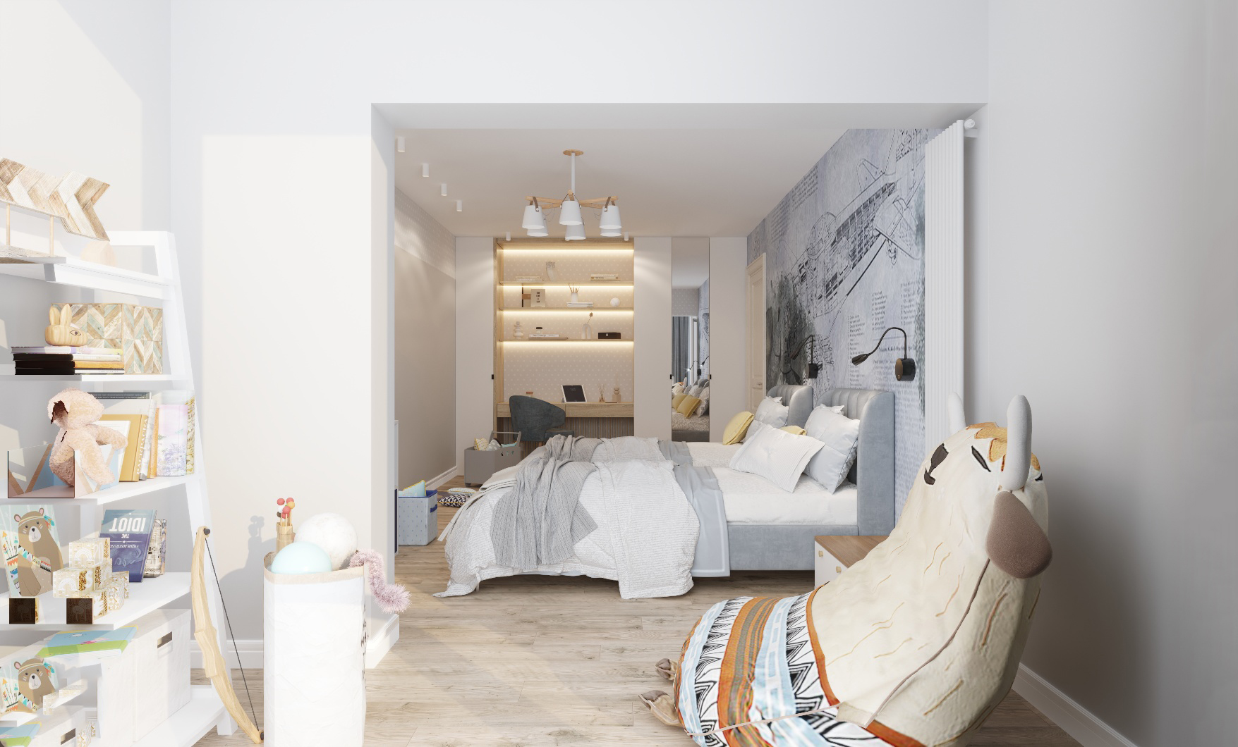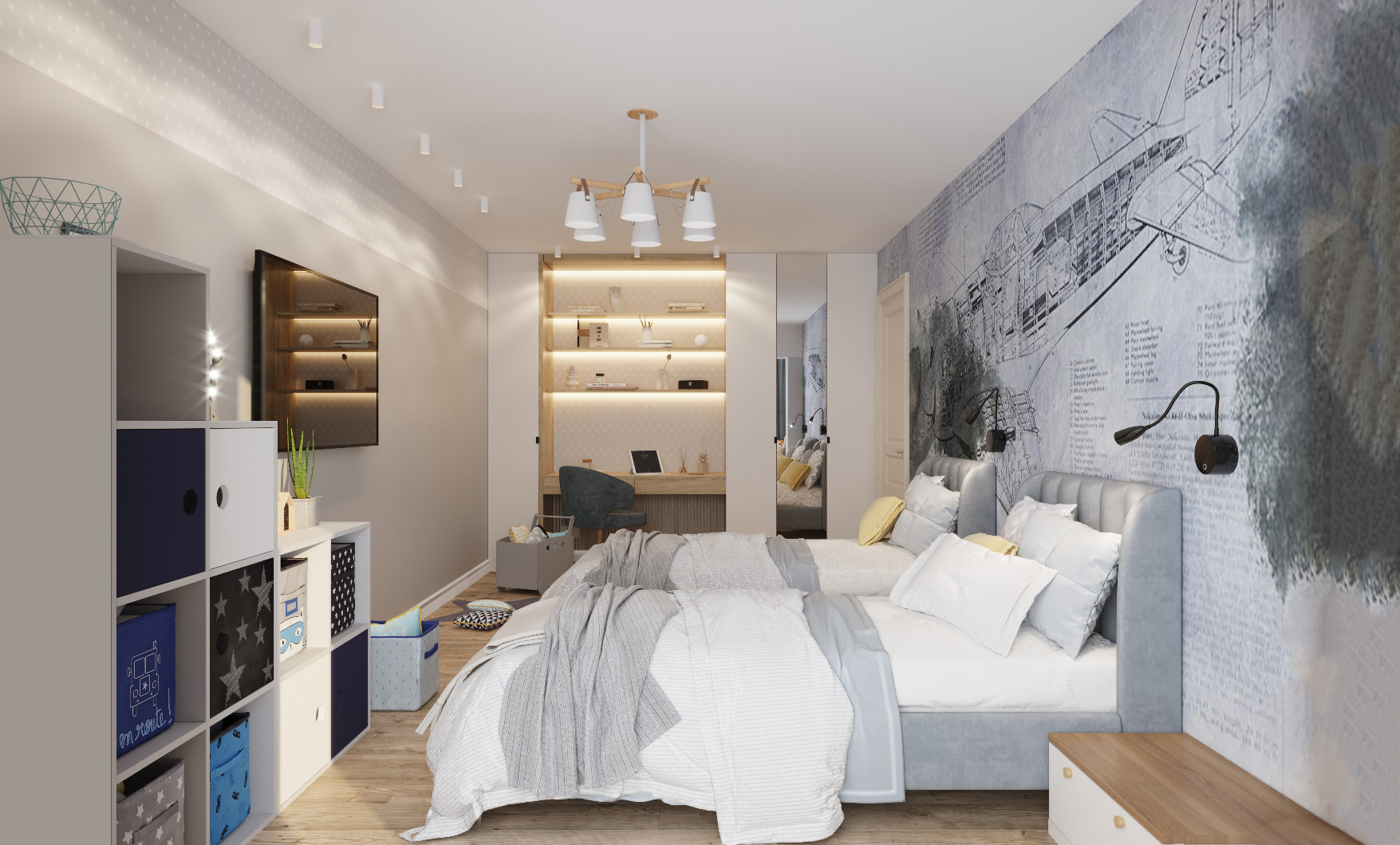 Эта детская комната выполнена в современном стиле. На случай смены мебели с учётом возраста детей был предусмотрен актуальный и современный дизайн стен. Мальчики очень любят самолеты и всё, что с ними связано. Обои из коллекции «Induction» смотрятся эффектно, создавая особую атмосферу в комнате для детей.