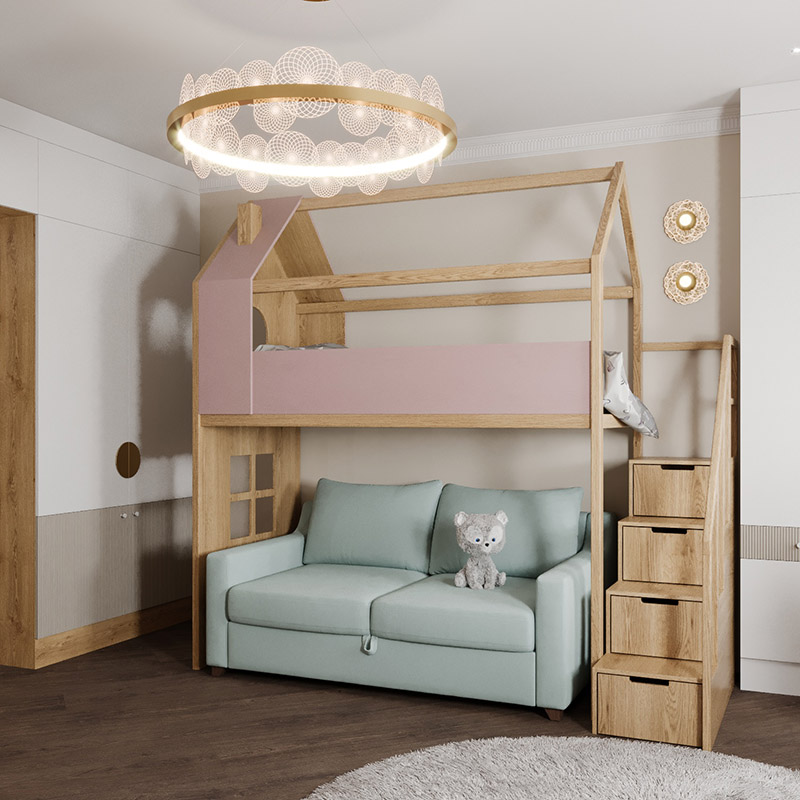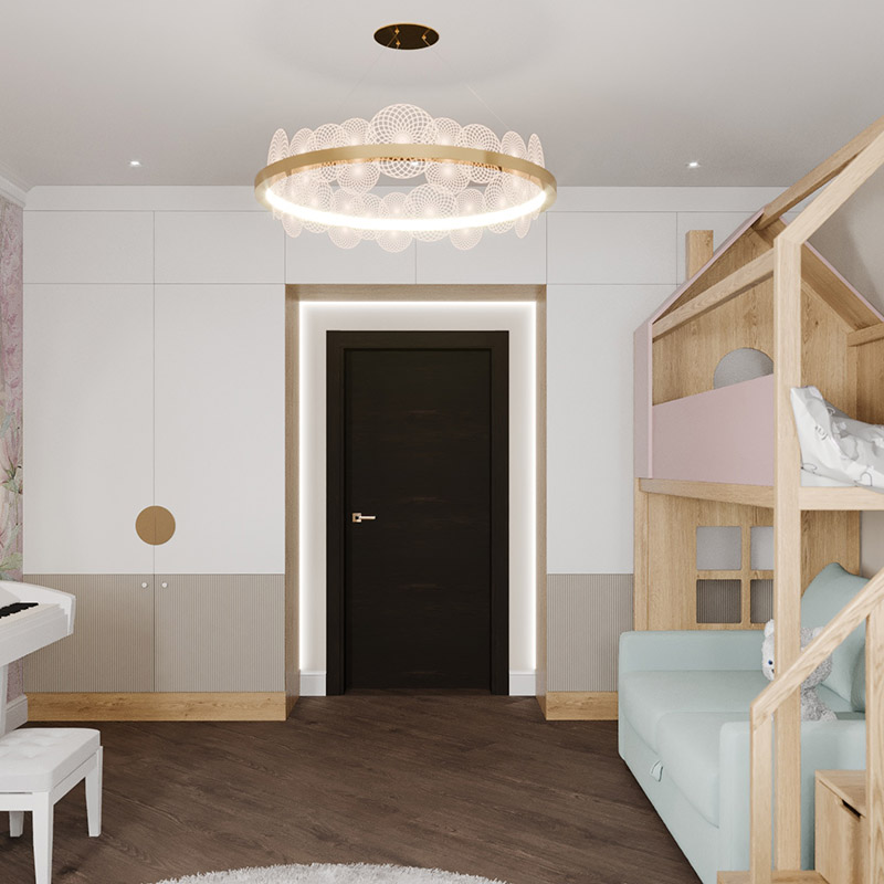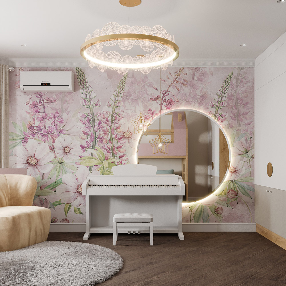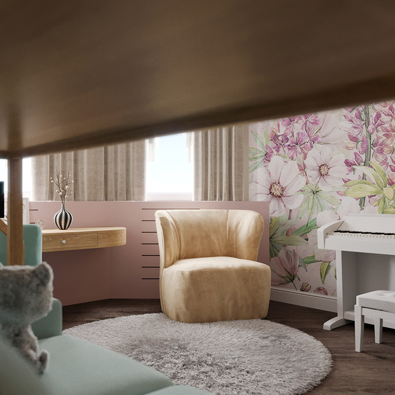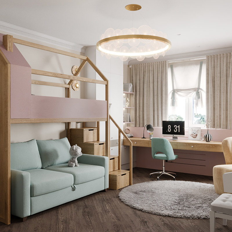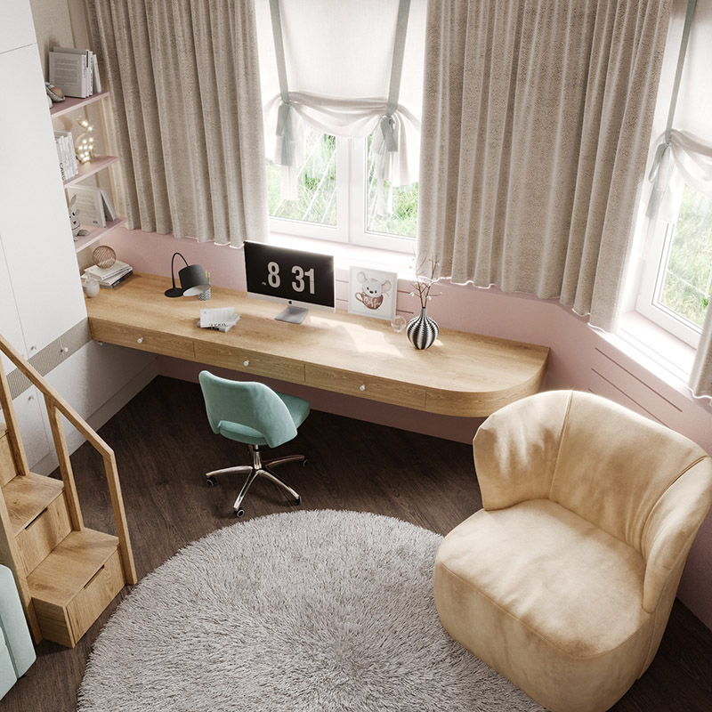 Детская комната для девочки младшего школьного возраста. Запросом заказчиков была светлая нежная атмосфера для учёбы и отдыха.