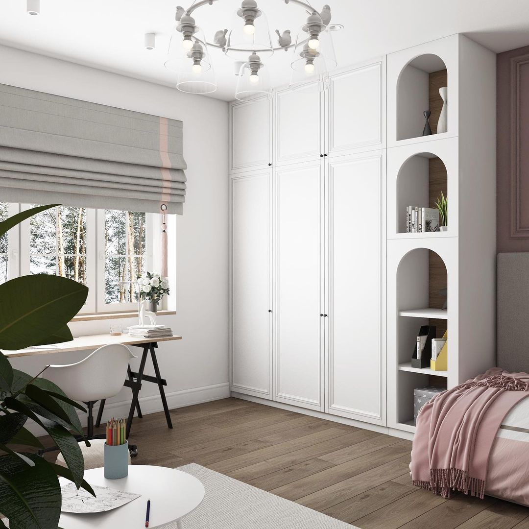 - для хранения предусмотрели вместительный шкаф, комод и стеллаж.