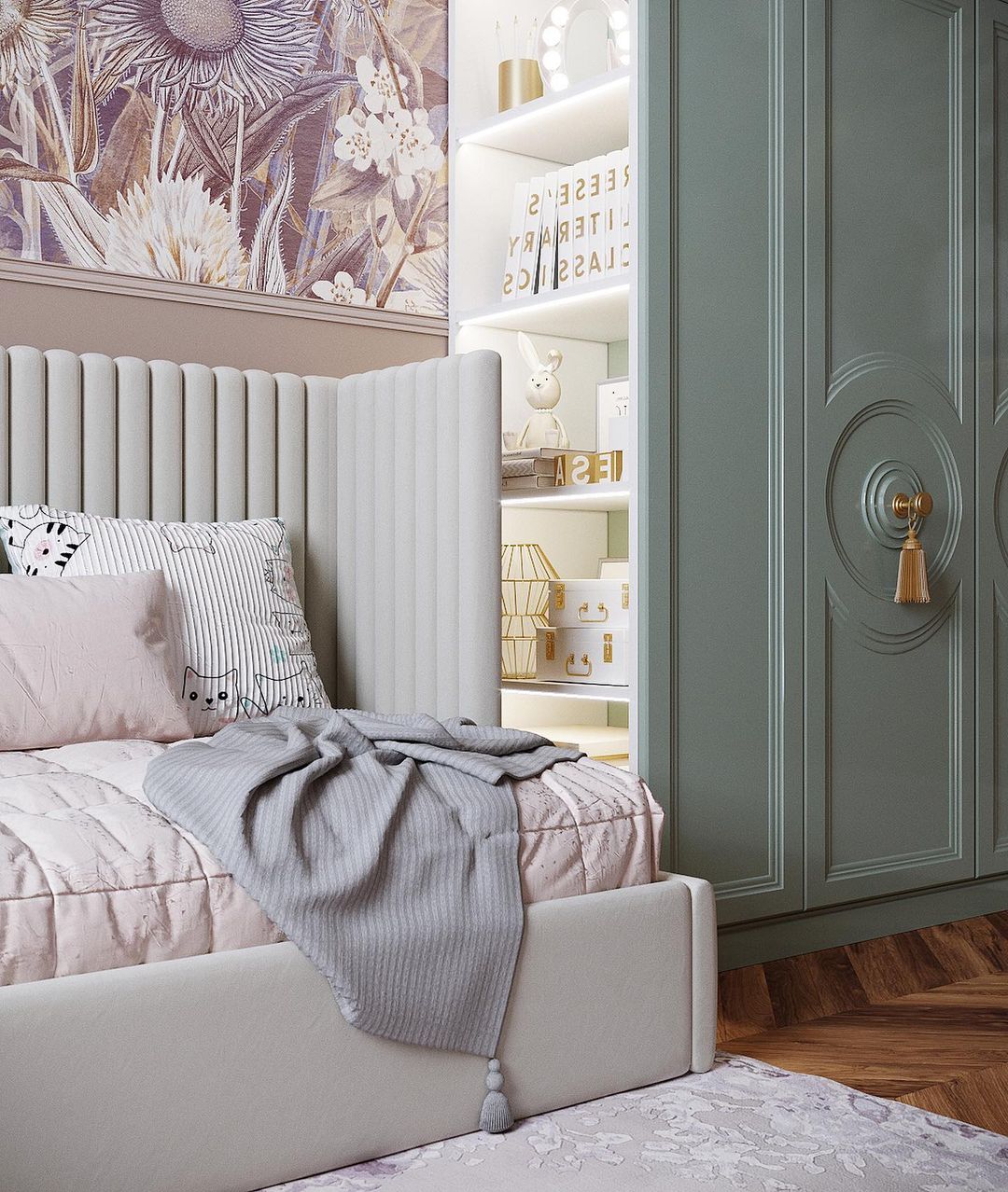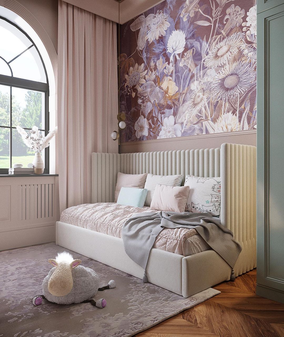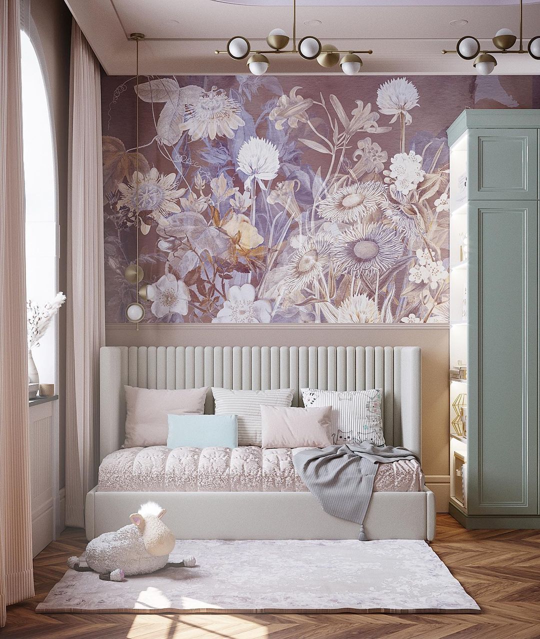 Обои здесь использовались из взрослой коллекции «Paleo». Эта удивительная коллекция с её акварельными изображениями изумительно вписывается в любое помещение. Прекрасная цветочная поляна с яркими чувственными бутонами украсит интерьер вашего дома вне зависимости от сезона!