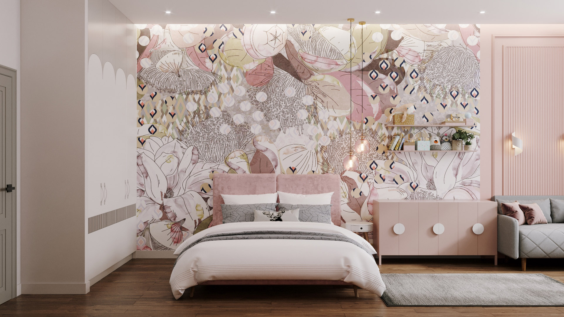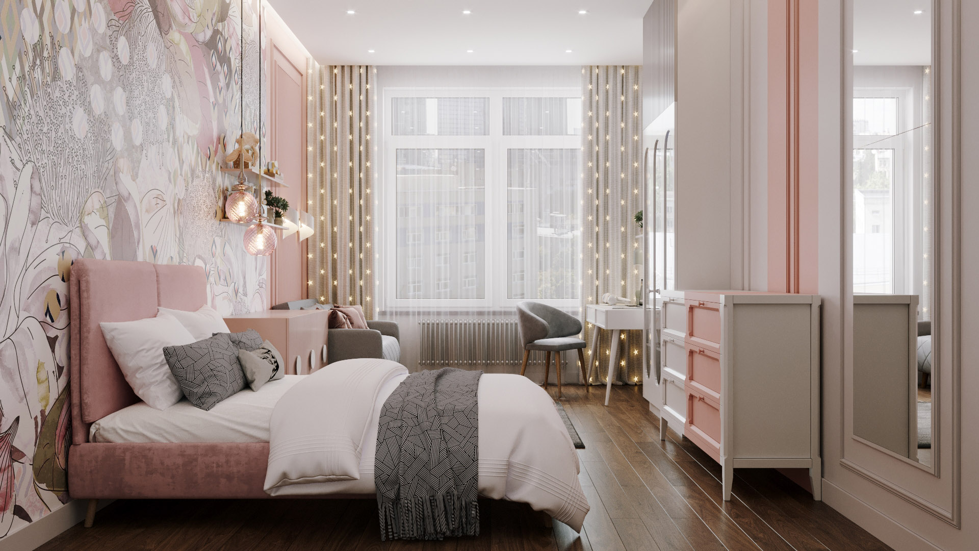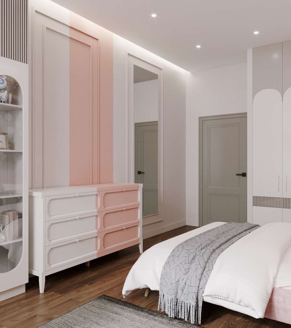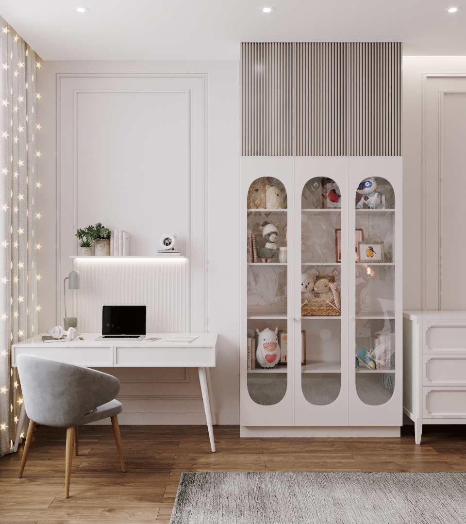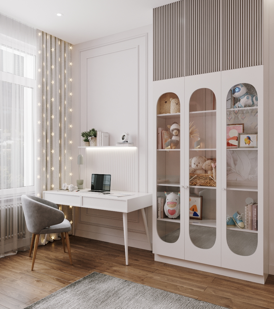Эта милая и просторная детская находится в Санкт-Петербурге, на Петроградской стороне. Площадь комнаты 22 квадратных метра. Комната выглядит уютно. Когда мы начинали работу над проектом, заказчики переживали, что в нём будет холодно и пусто, поскольку помещение узкое и длинное.