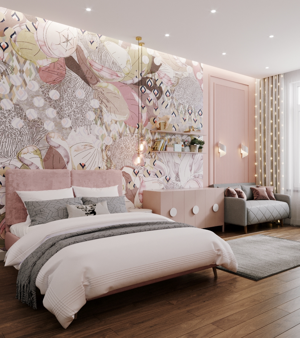И действительно, в комнатах более камерных размеров атмосферу «гнёздышка», где ребёнку будет комфортно, создать гораздо проще. Но на самом деле этого добиться можно в любых помещениях. В этом нам помогают отсутствие визуально громоздких объёмов, дробность деталей, разнообразие фактур и оттенков в отделке стен и мебели, а также пересечение цветовых решений в разных элементах интерьера, сочетание растительного орнамента и геометрических форм.