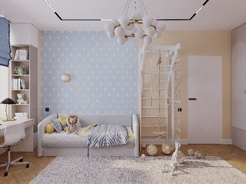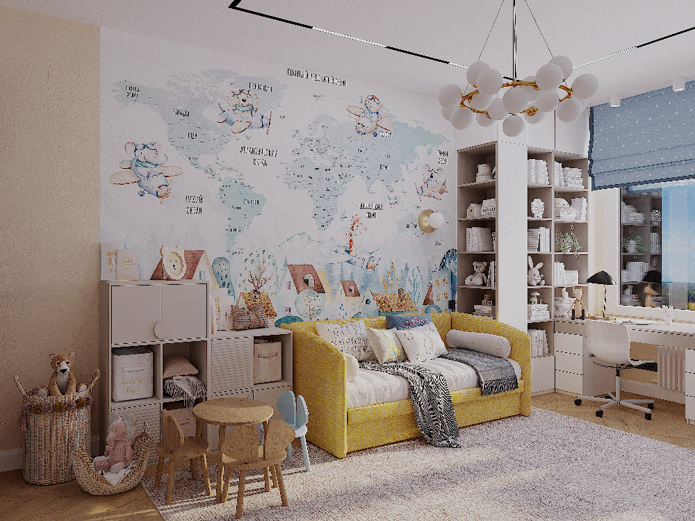 Квартира в ЖК «Flora & Fauna», г. Новосибирск. Заказчиками этой квартиры является молодая семья с двумя маленькими детьми: сыну 4 года и дочери 1 год. Часто любят путешествовать. Нужно было создать светлый просторный интерьер в сочетании с натуральными материалами и контрастными оттенками. В детскую комнату площадью 24,6 м² выбрали обои из коллекции «Travel Kids».