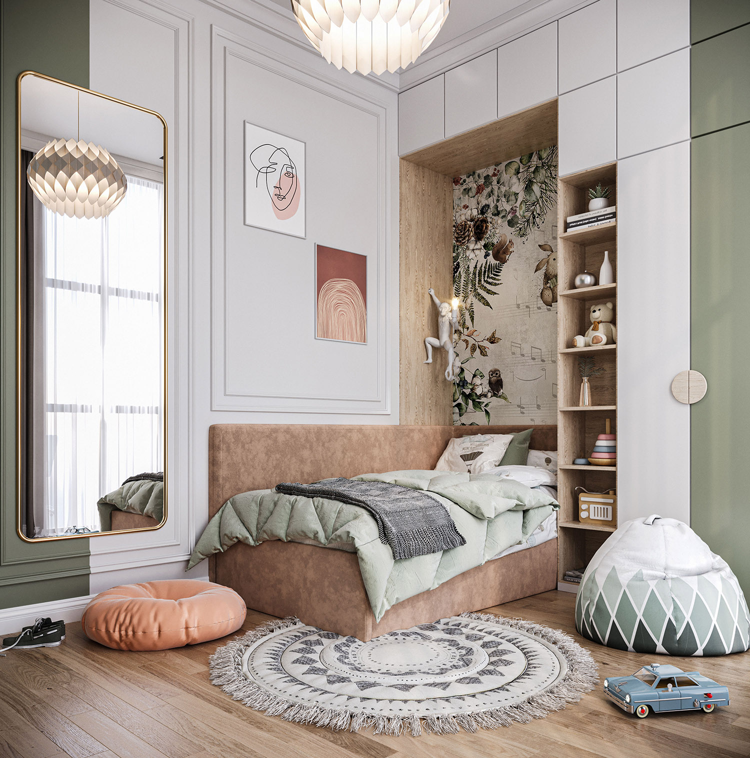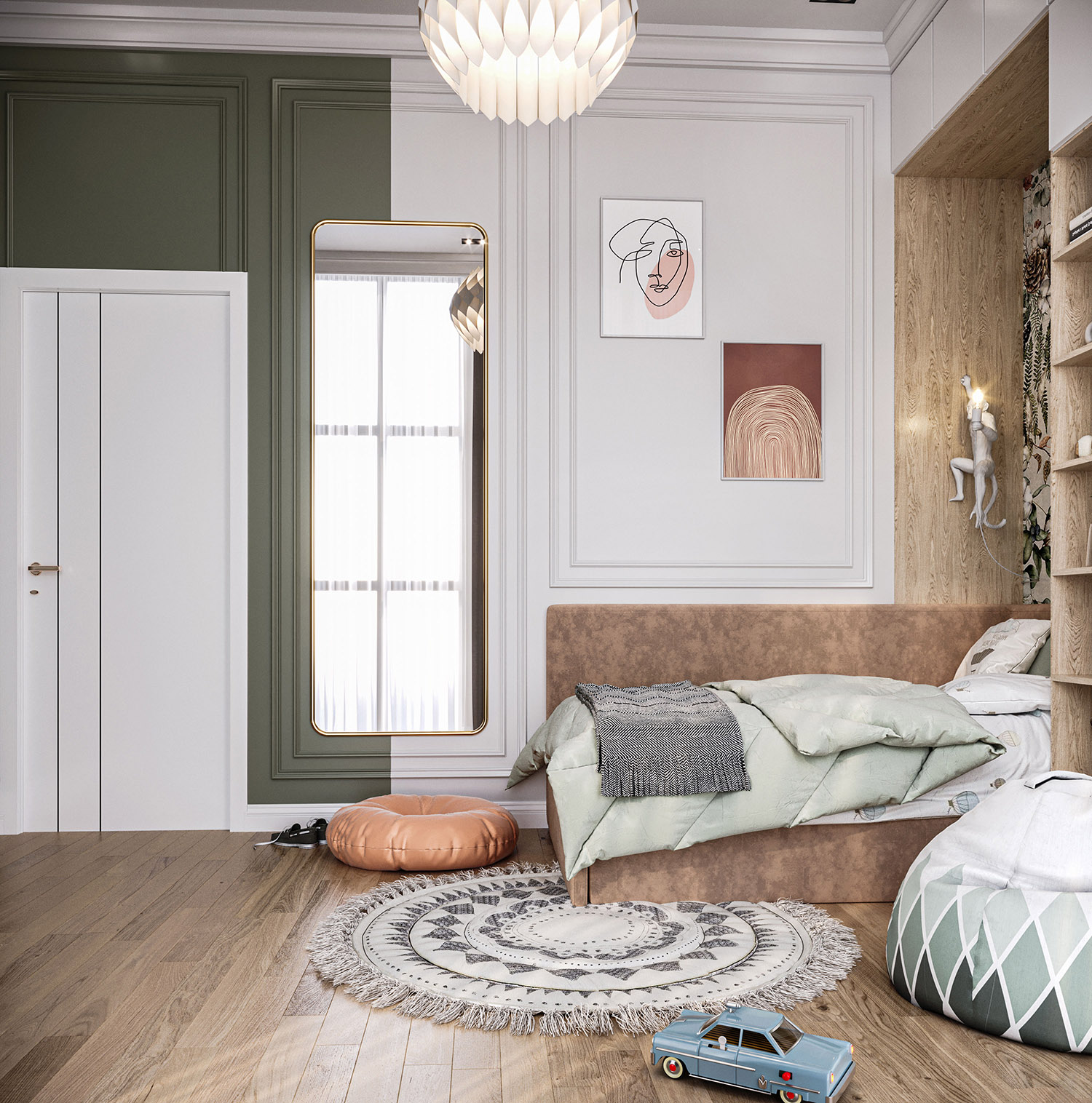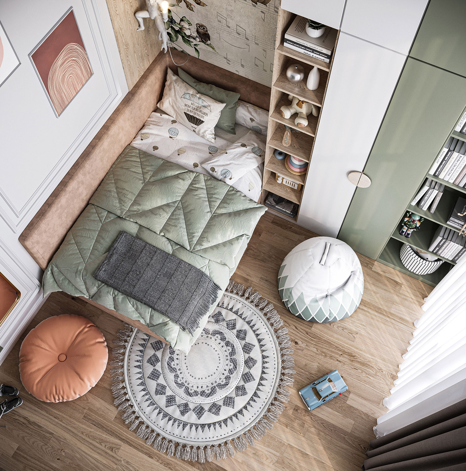 Эта комната принадлежит 5-летнему мальчику из Туркмении, г. Ашхабад. Общая площадь комнаты — 20 м². Здесь есть для ребенка игральная и где можно заняться умственно. Фреска выбрана из коллекции «Woody» Все сделано только для удобства ребенка!