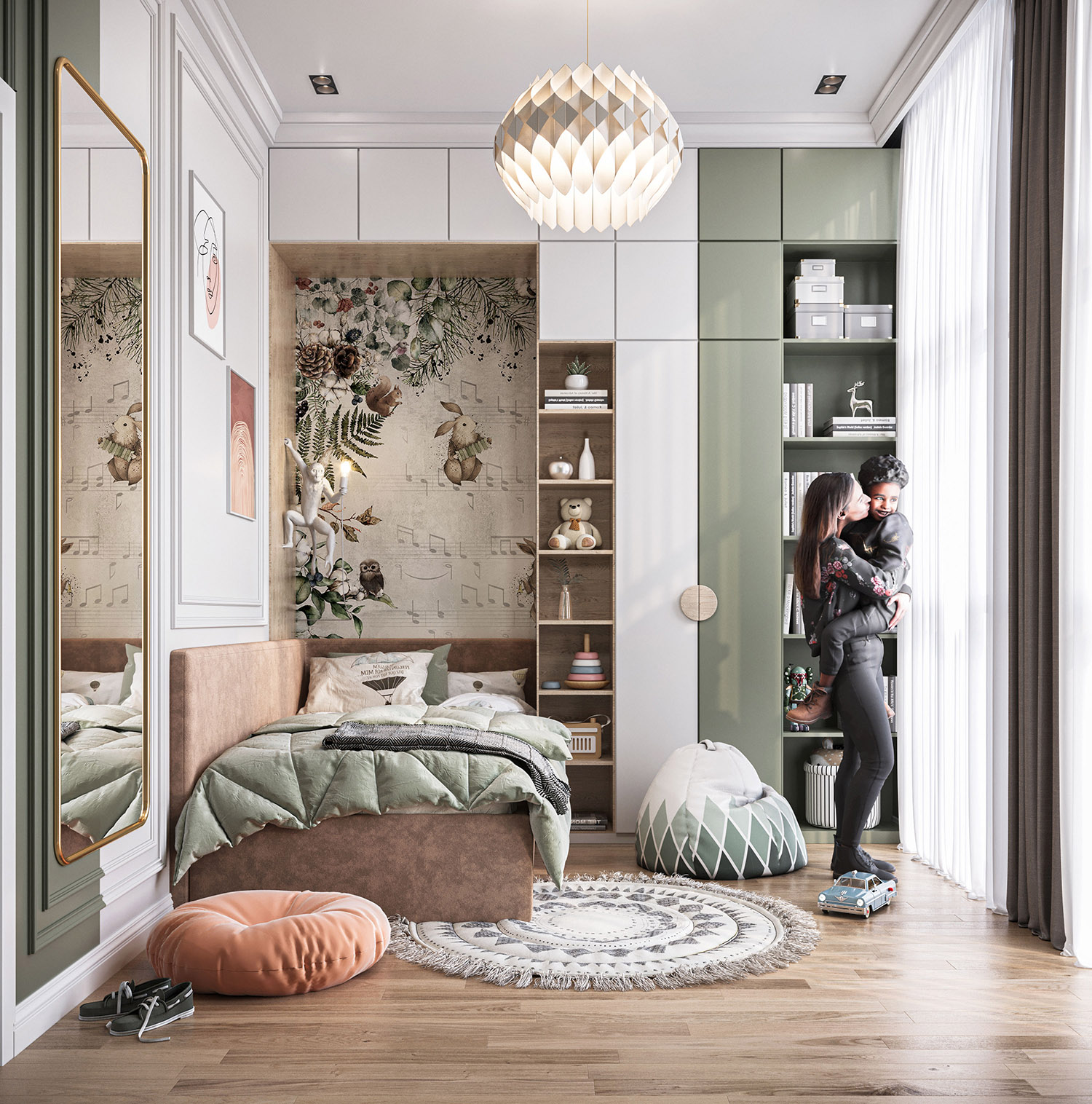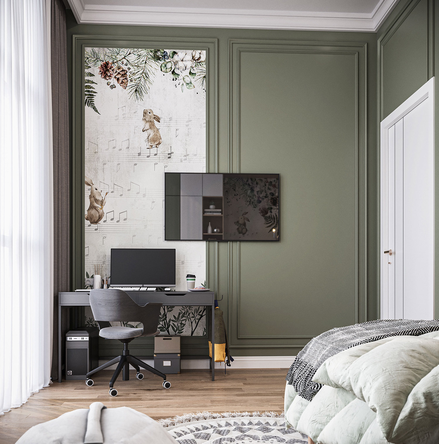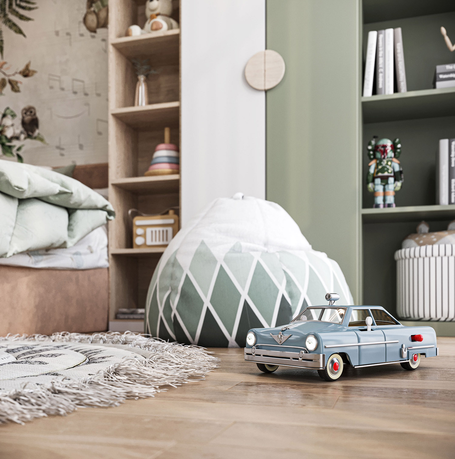 Эта комната принадлежит 5-летнему мальчику из Туркмении, г. Ашхабад. Общая площадь комнаты — 20 м². Здесь есть для ребенка игральная и где можно заняться умственно. Фреска выбрана из коллекции «Woody» Все сделано только для удобства ребенка!
